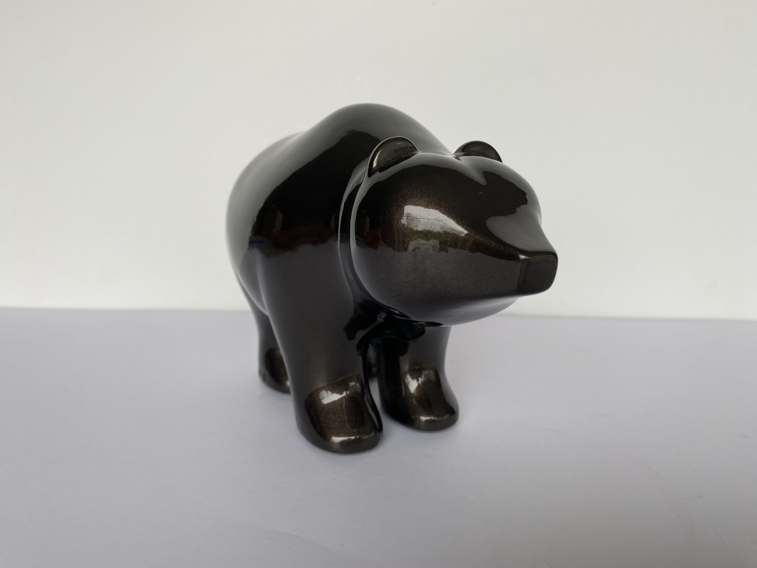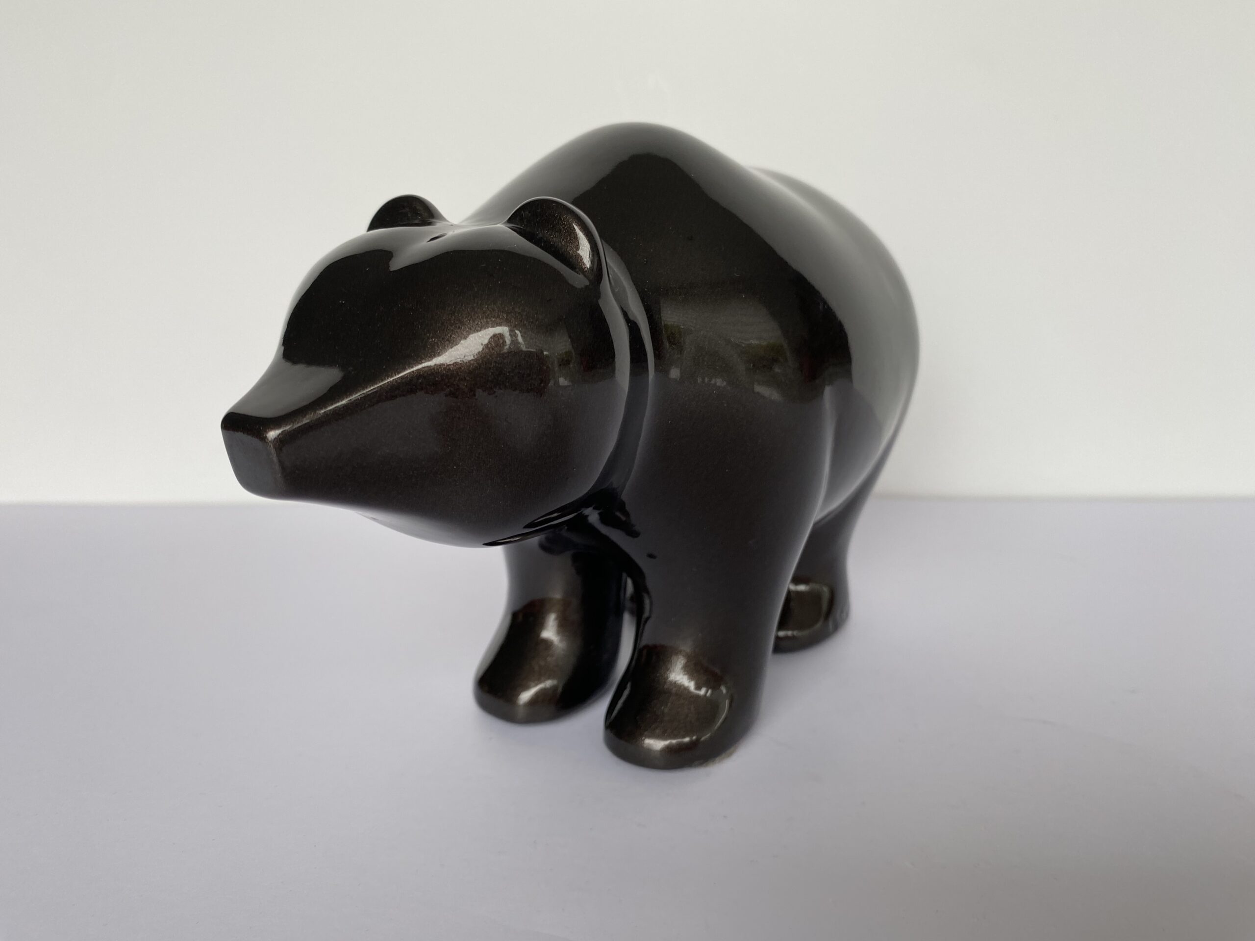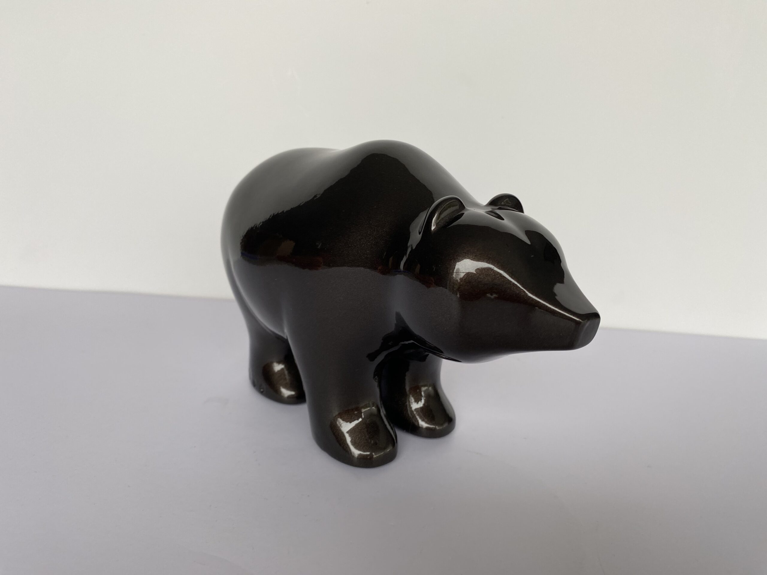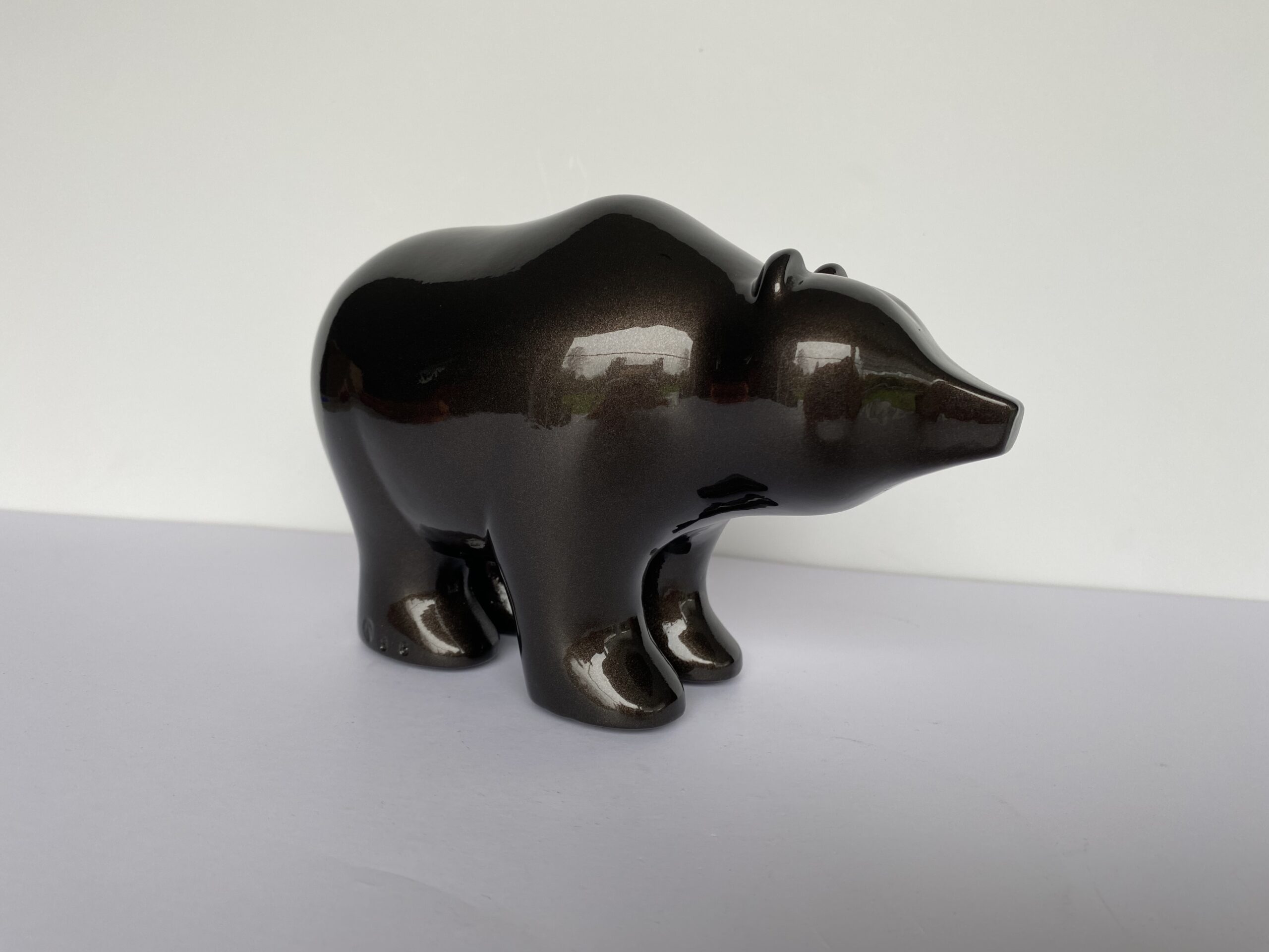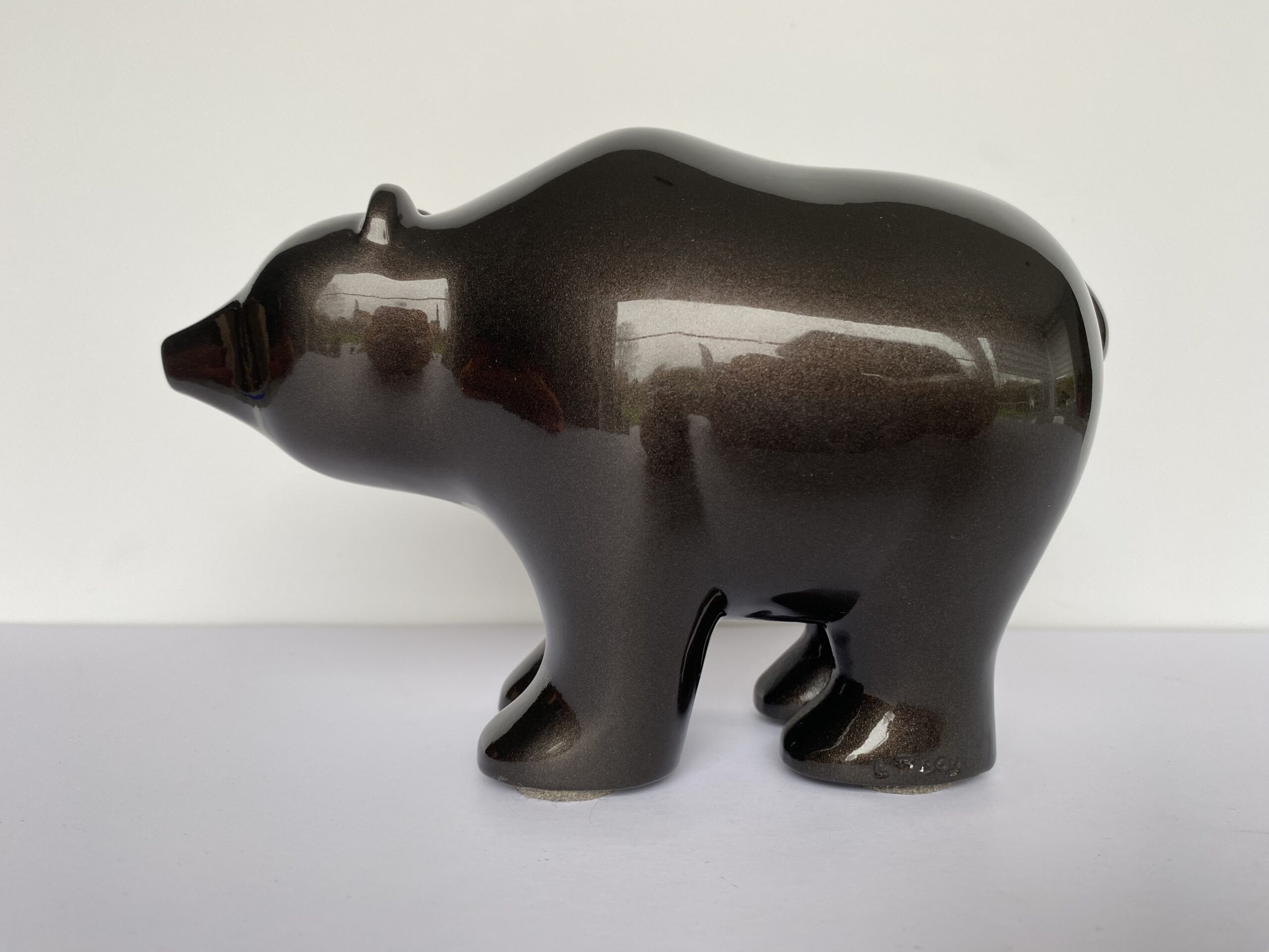 Contemporary sculpture of a bear in brown lacquered bronze. Unique piece, signed Laszlo Tibay, numbered 8/8.