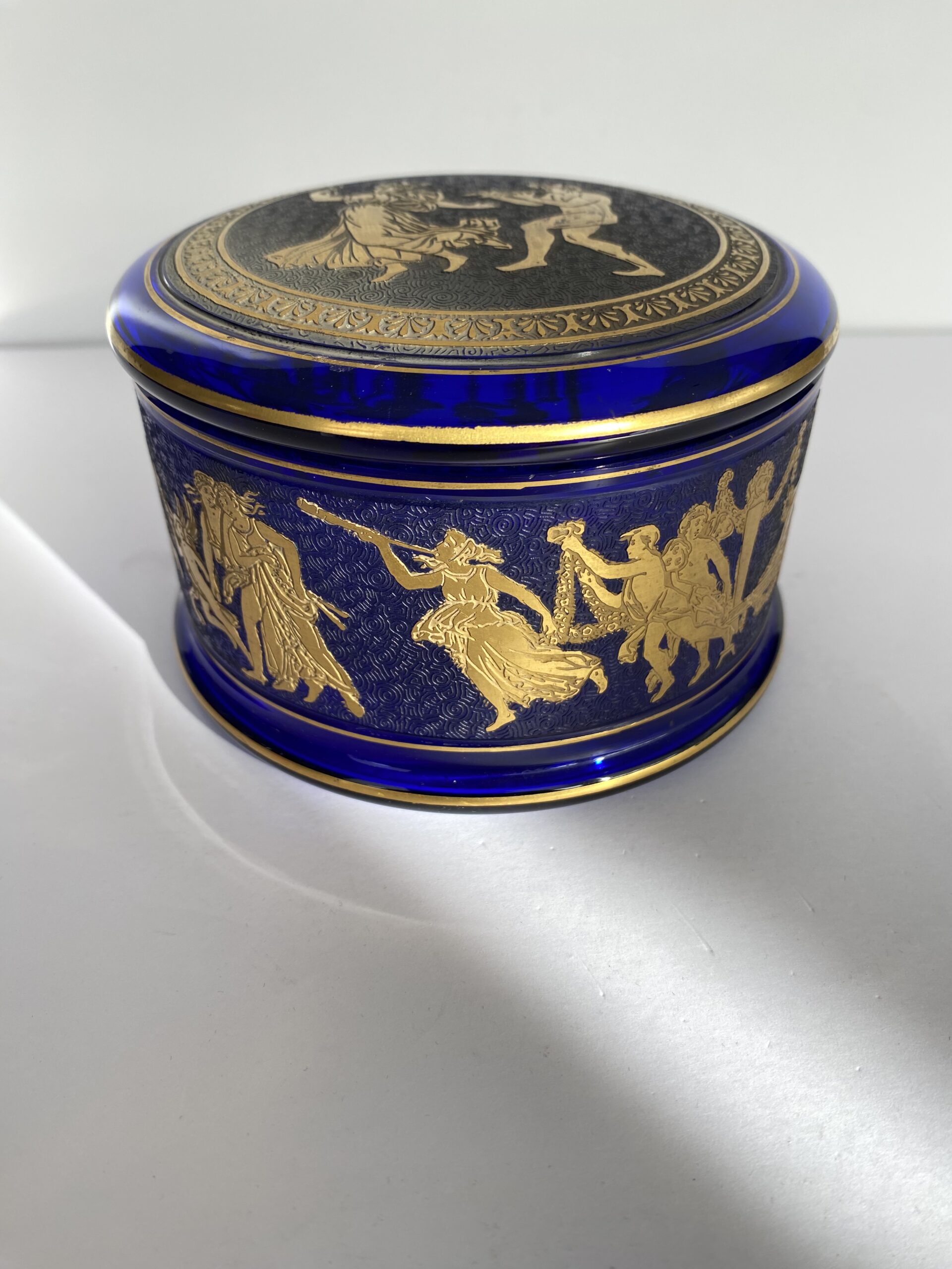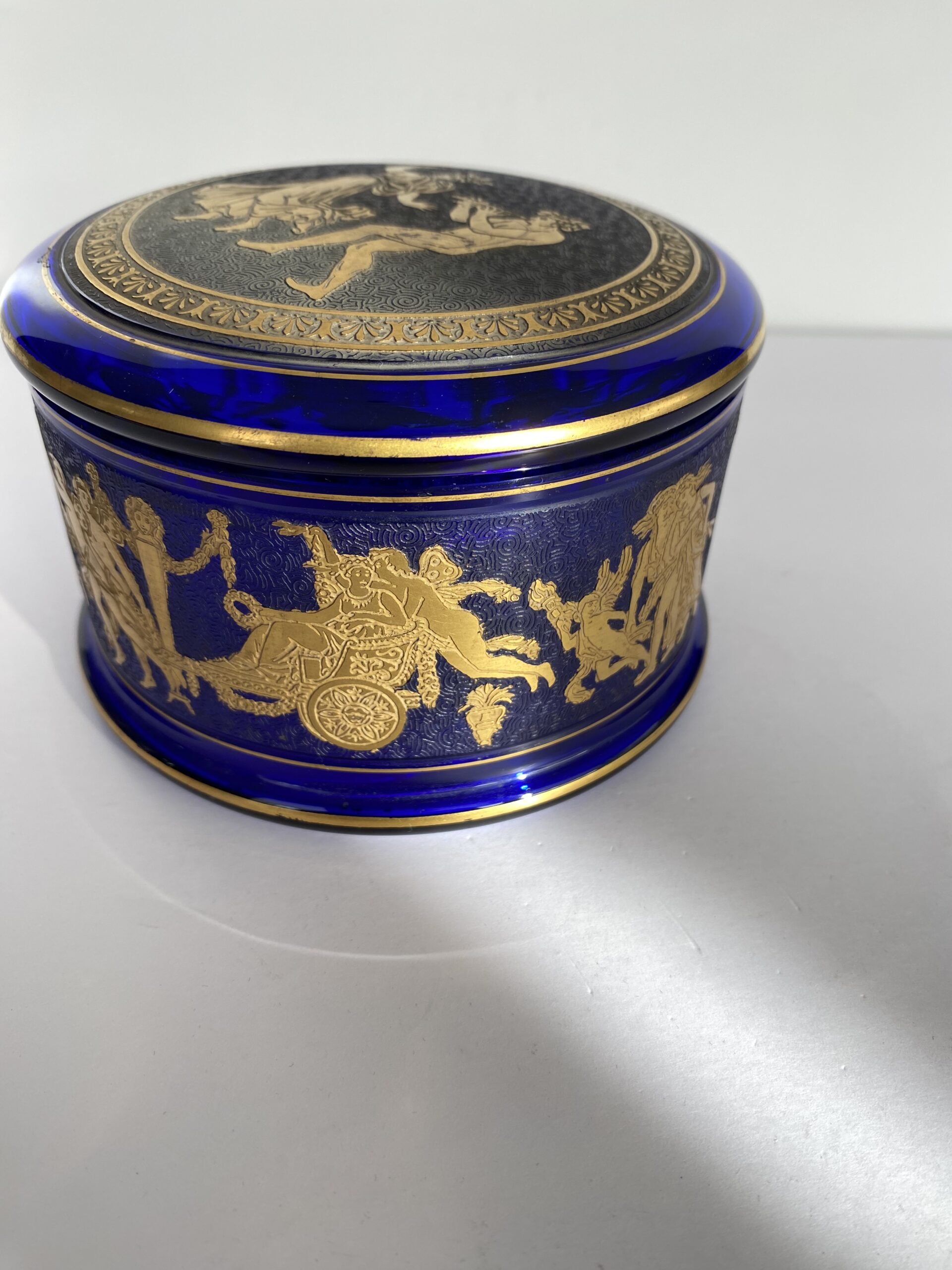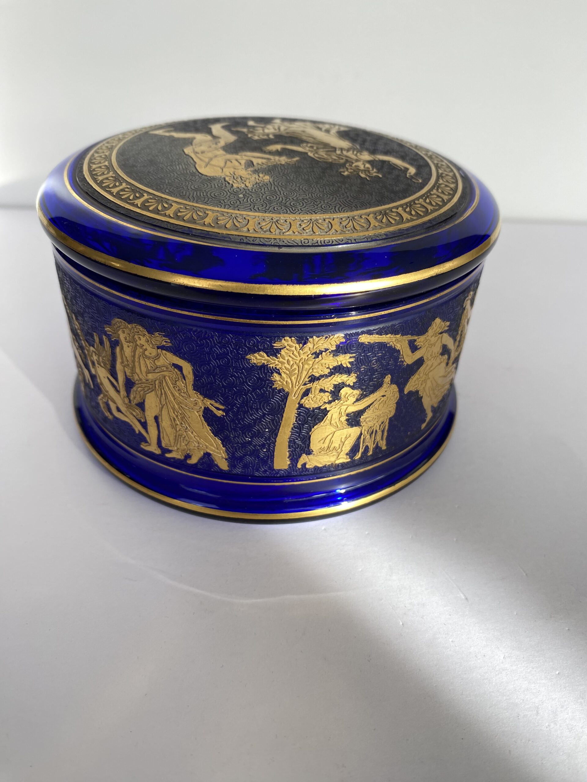 Round bonbonnière in cobalt-blue crystal. The lid is adorned with an acid-etched medallion, highlighted in gold with an antique mythological motif, while the body of the bonbonnière is adorned with a frieze.