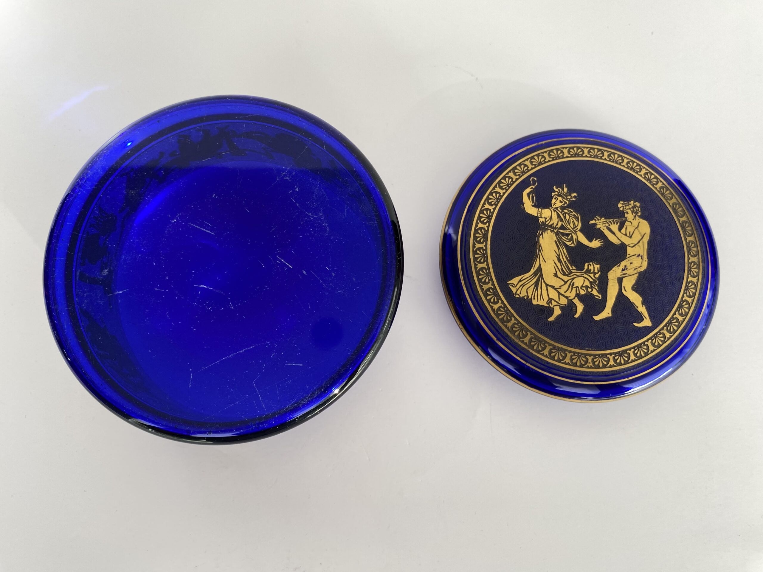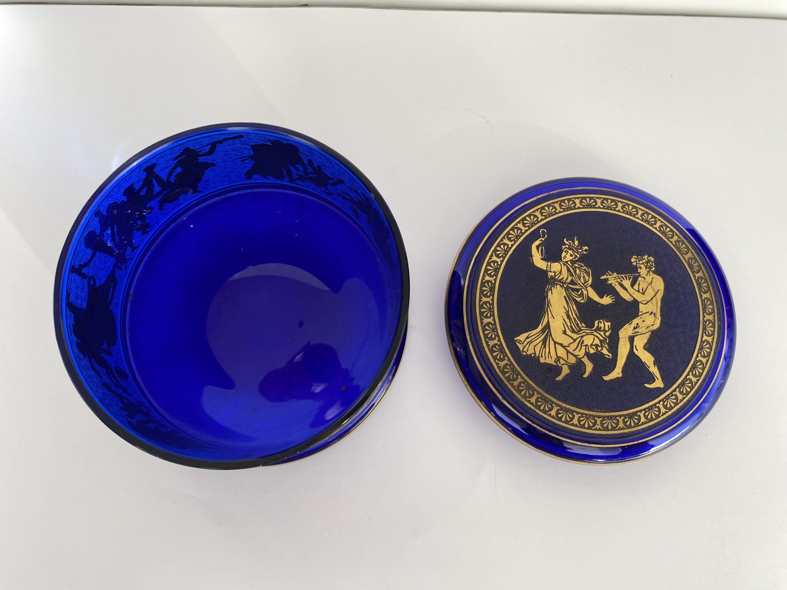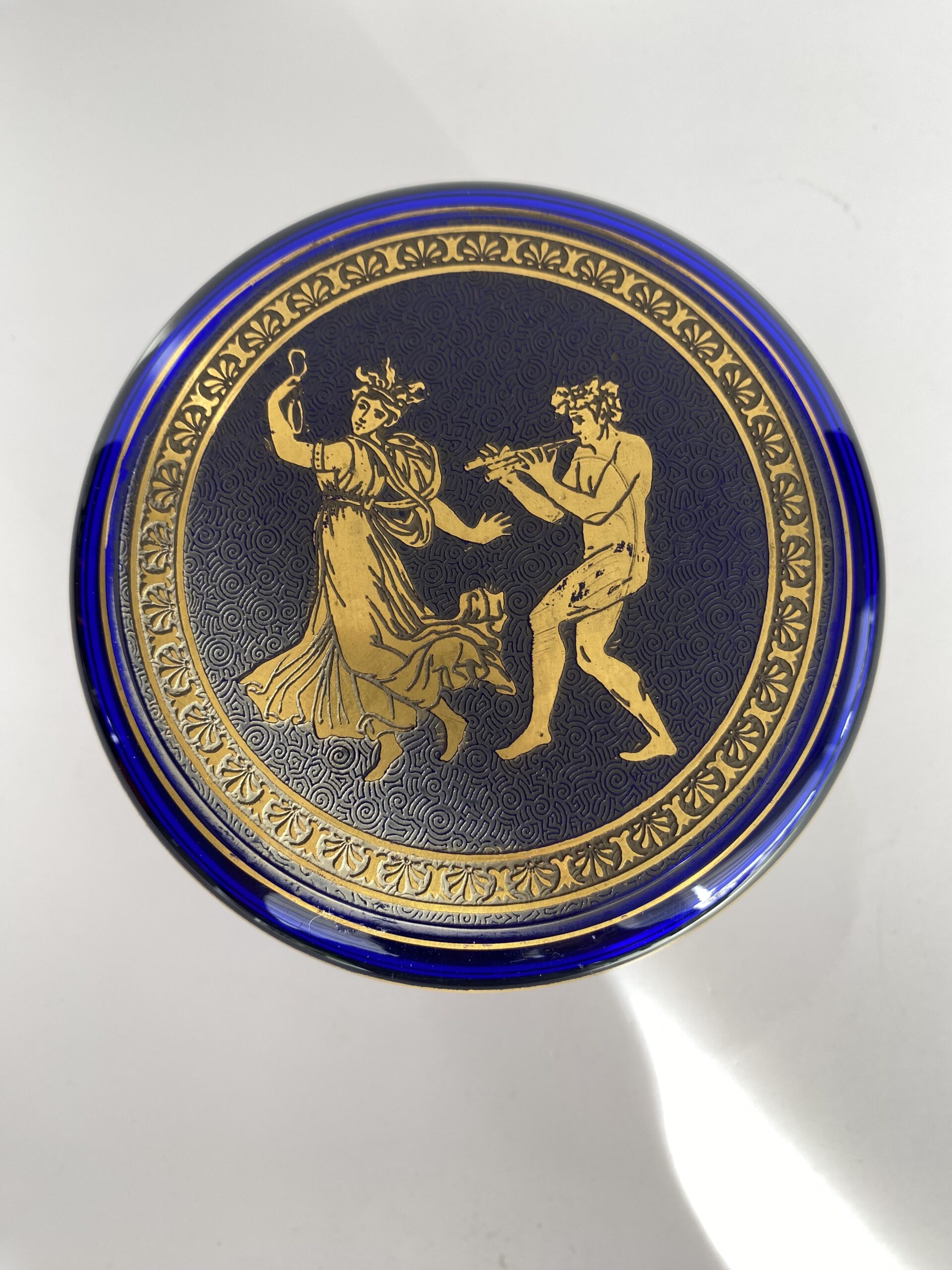 Round bonbonnière in cobalt-blue crystal. The lid is adorned with an acid-etched medallion, highlighted in gold with an antique mythological motif, while the body of the bonbonnière is adorned with a frieze.