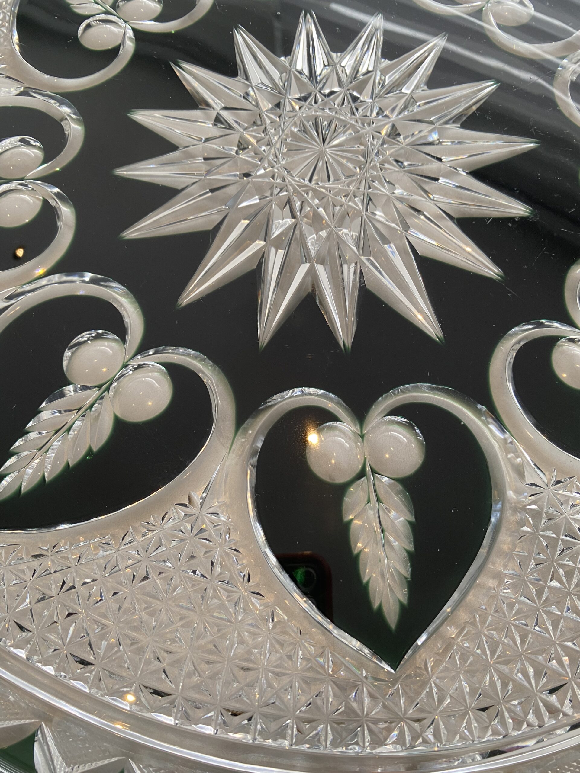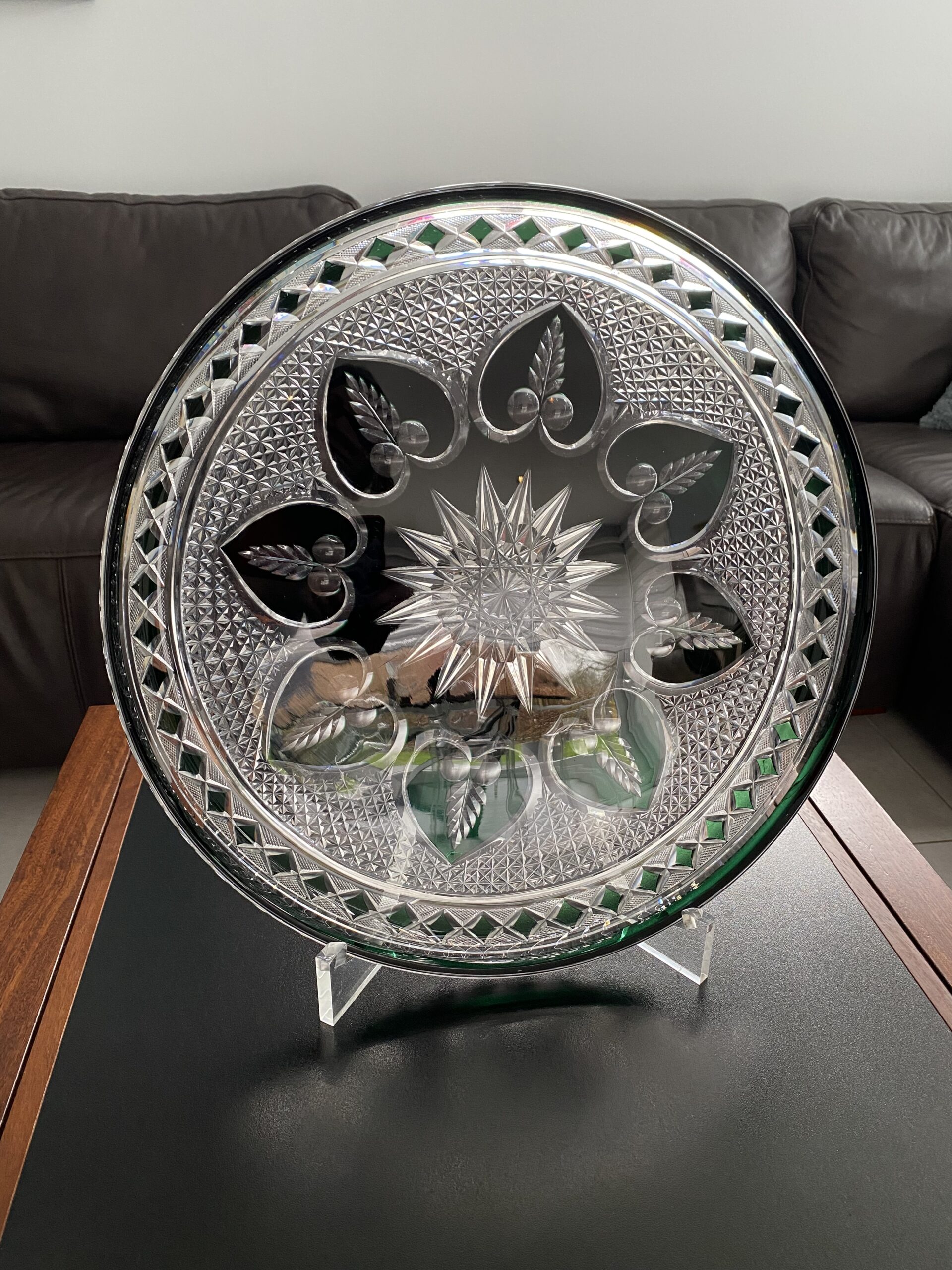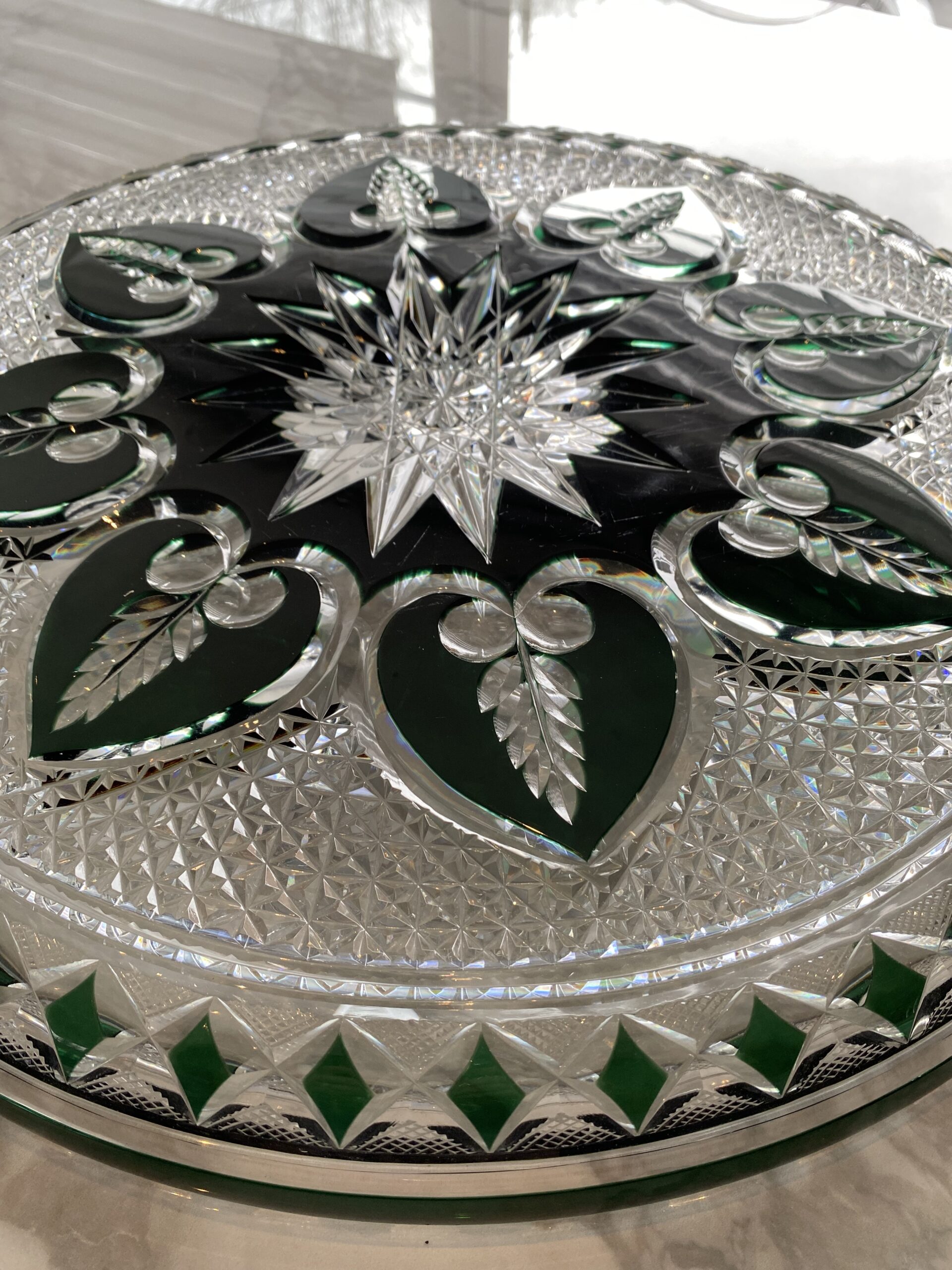 Large circular tray in clear crystal, green lined, from the Val-St-Lambert crystal works. Exceptional diameter and size. Probably made by Hubert Fouarge.