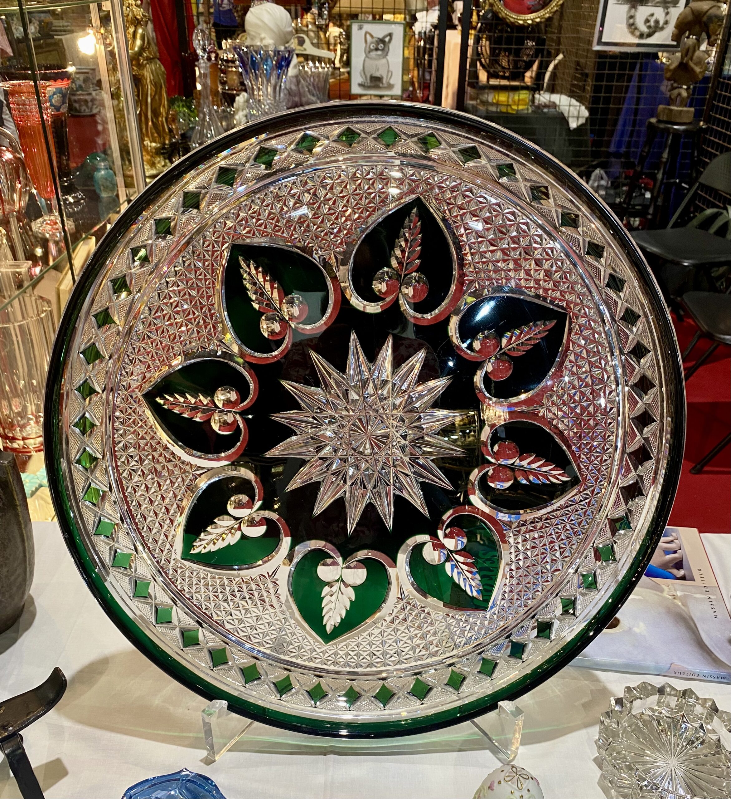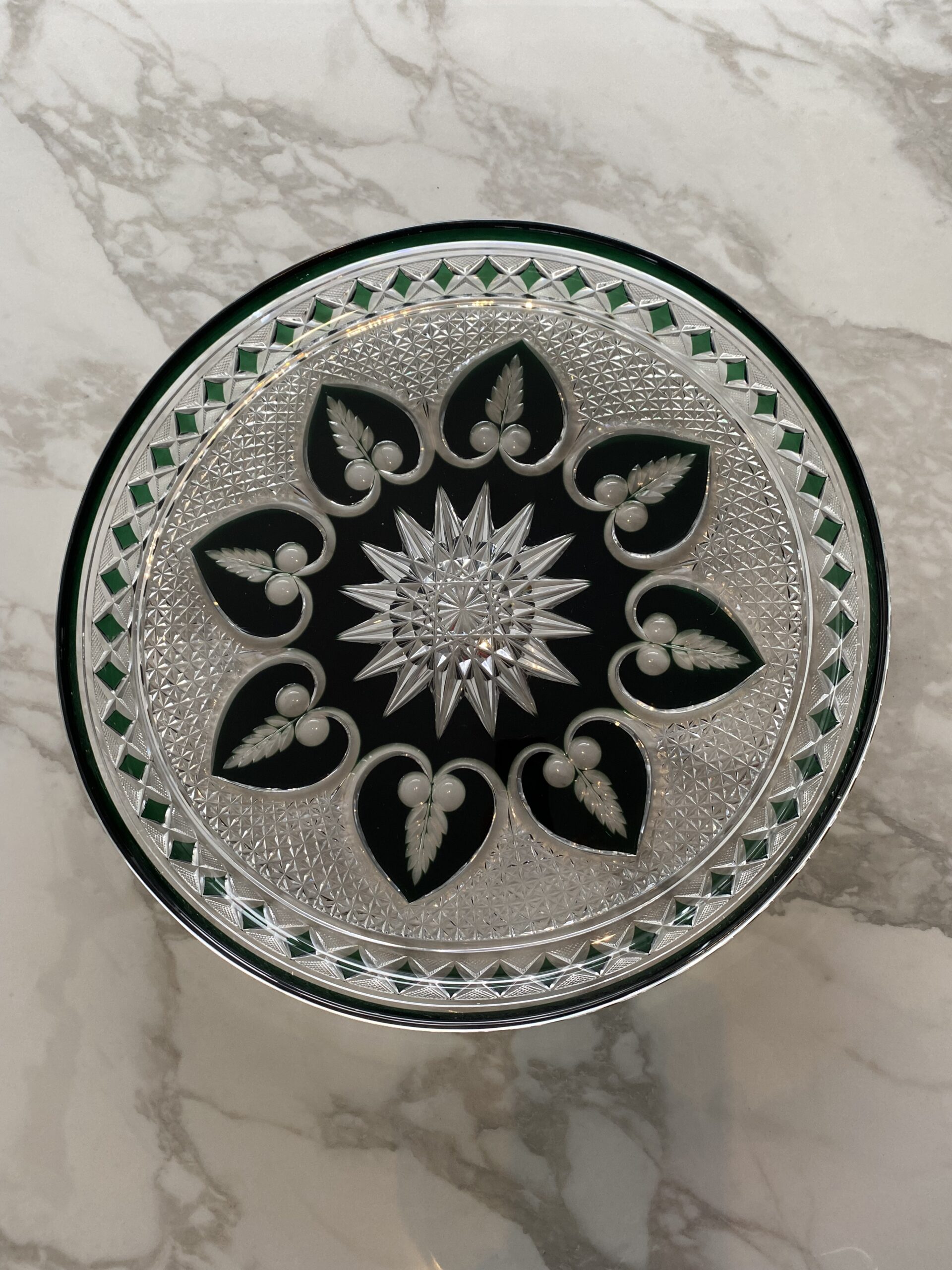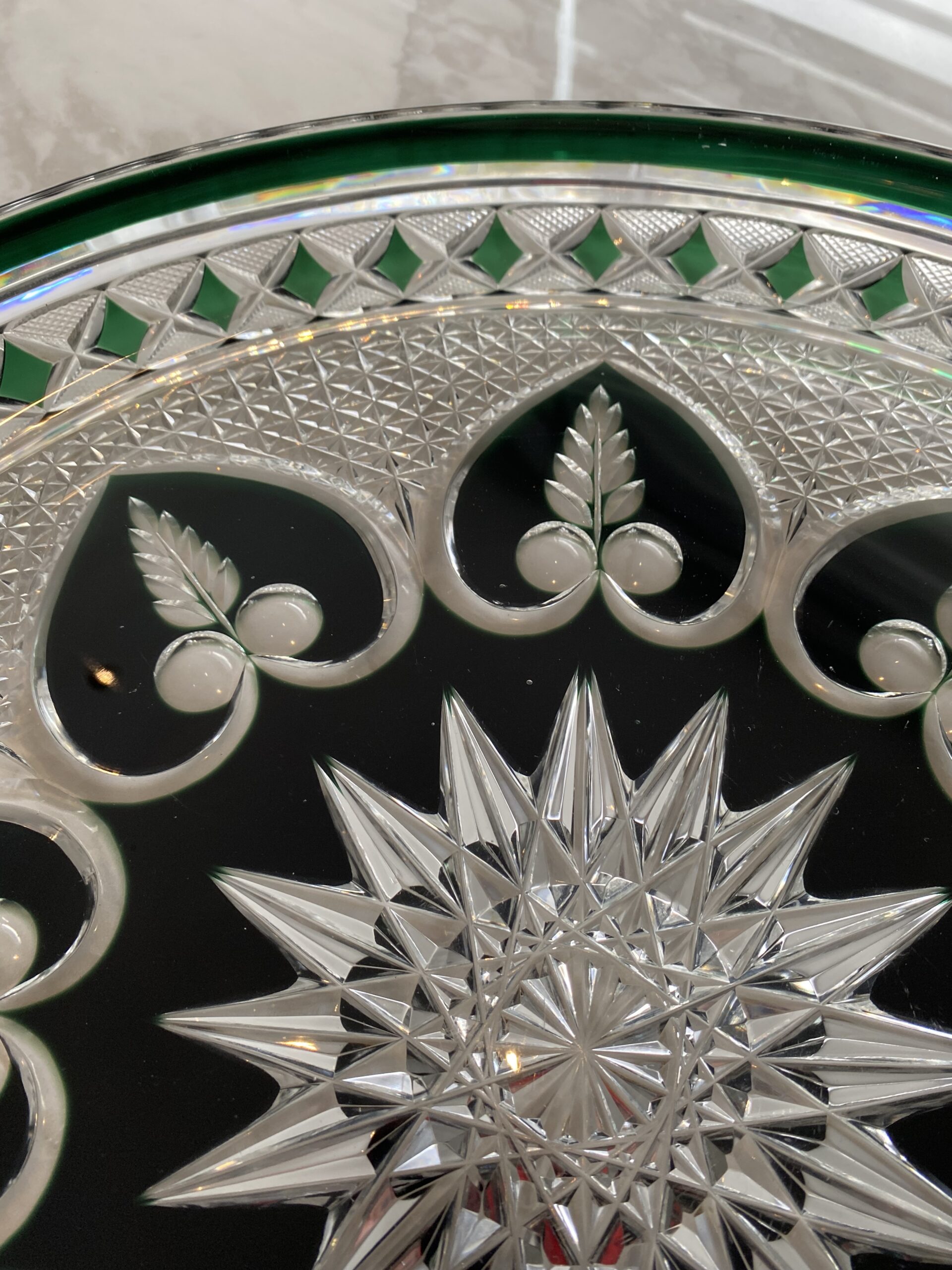 Large circular tray in clear crystal, green lined, from the Val-St-Lambert crystal works. Exceptional diameter and size. Probably made by Hubert Fouarge.