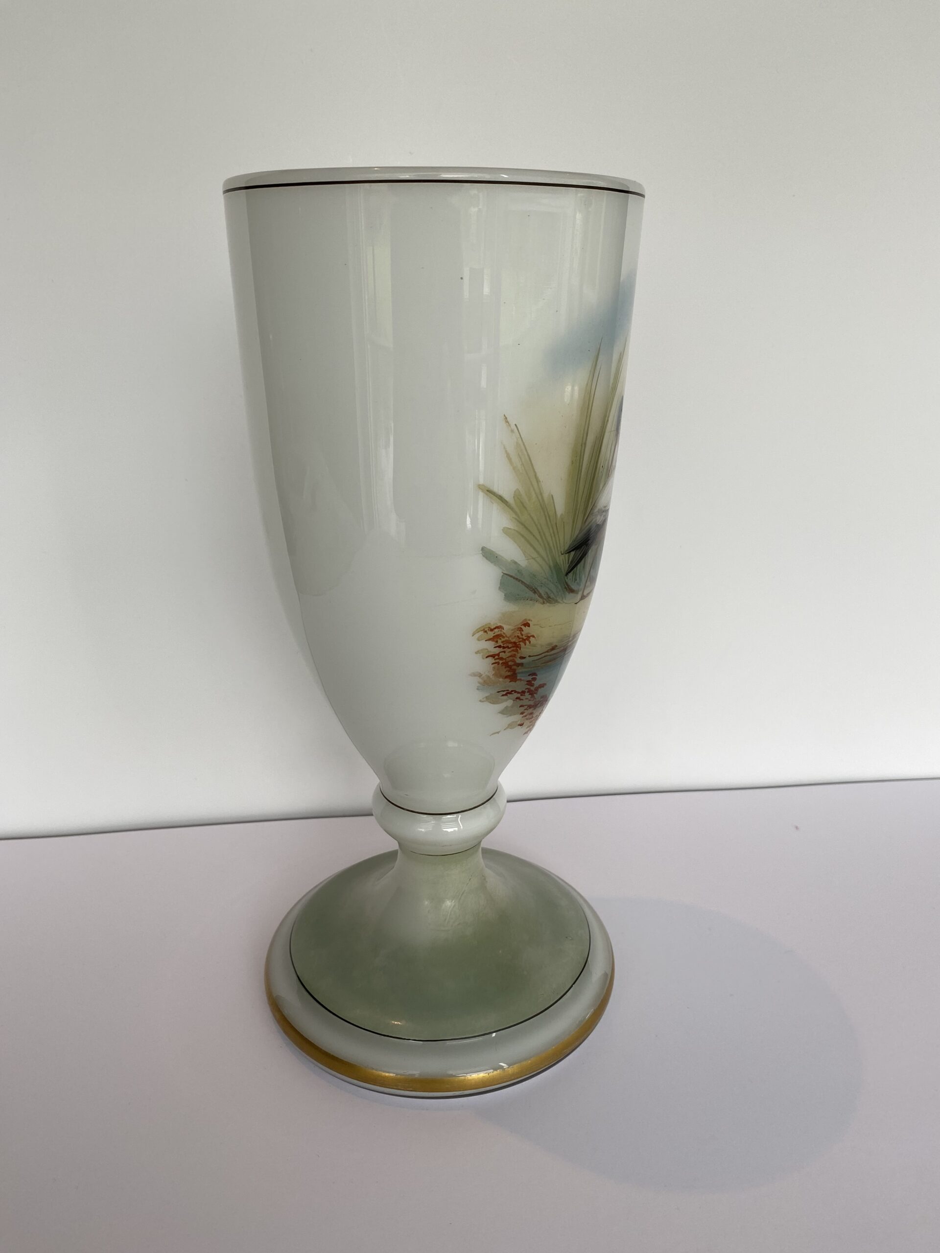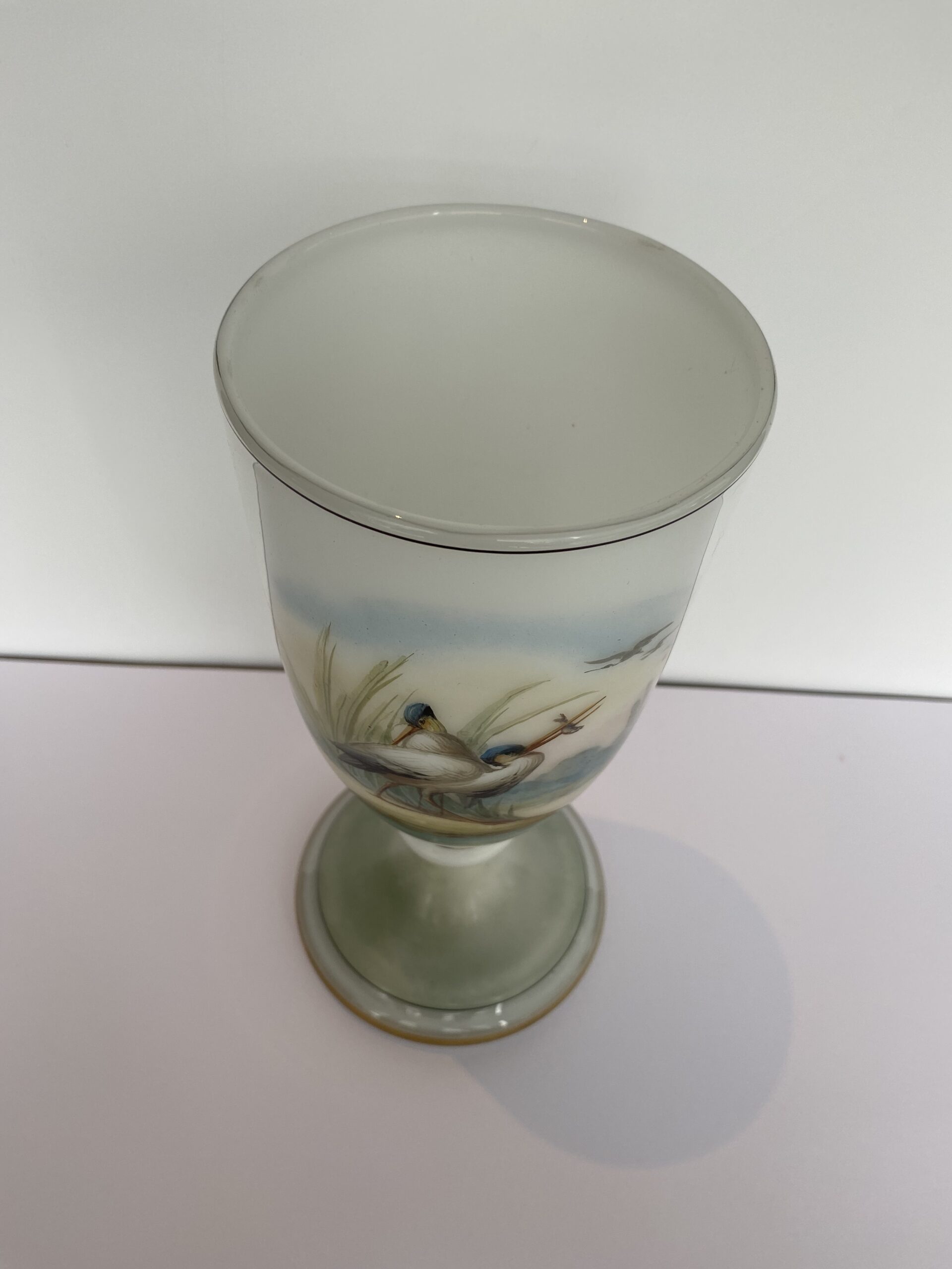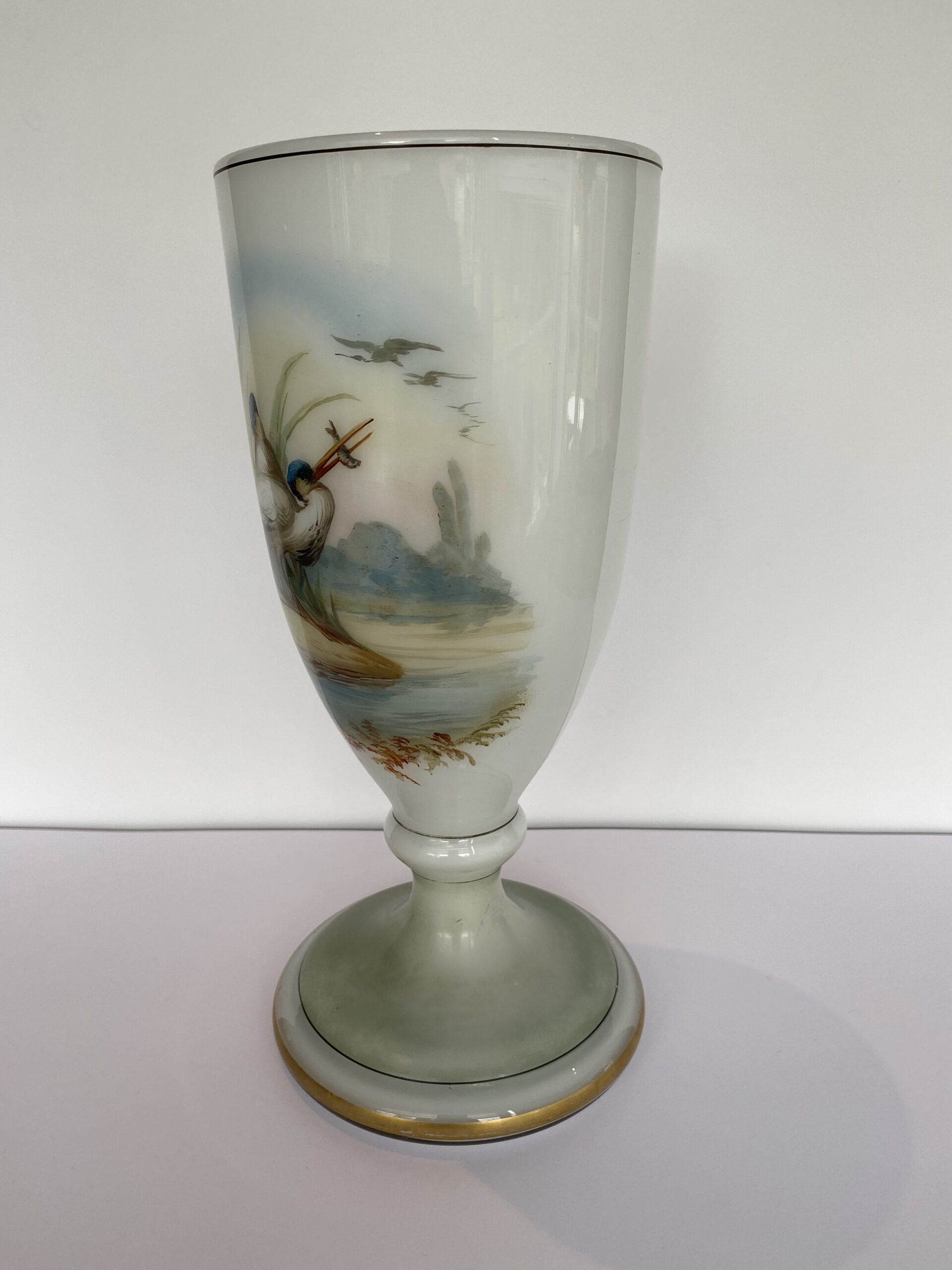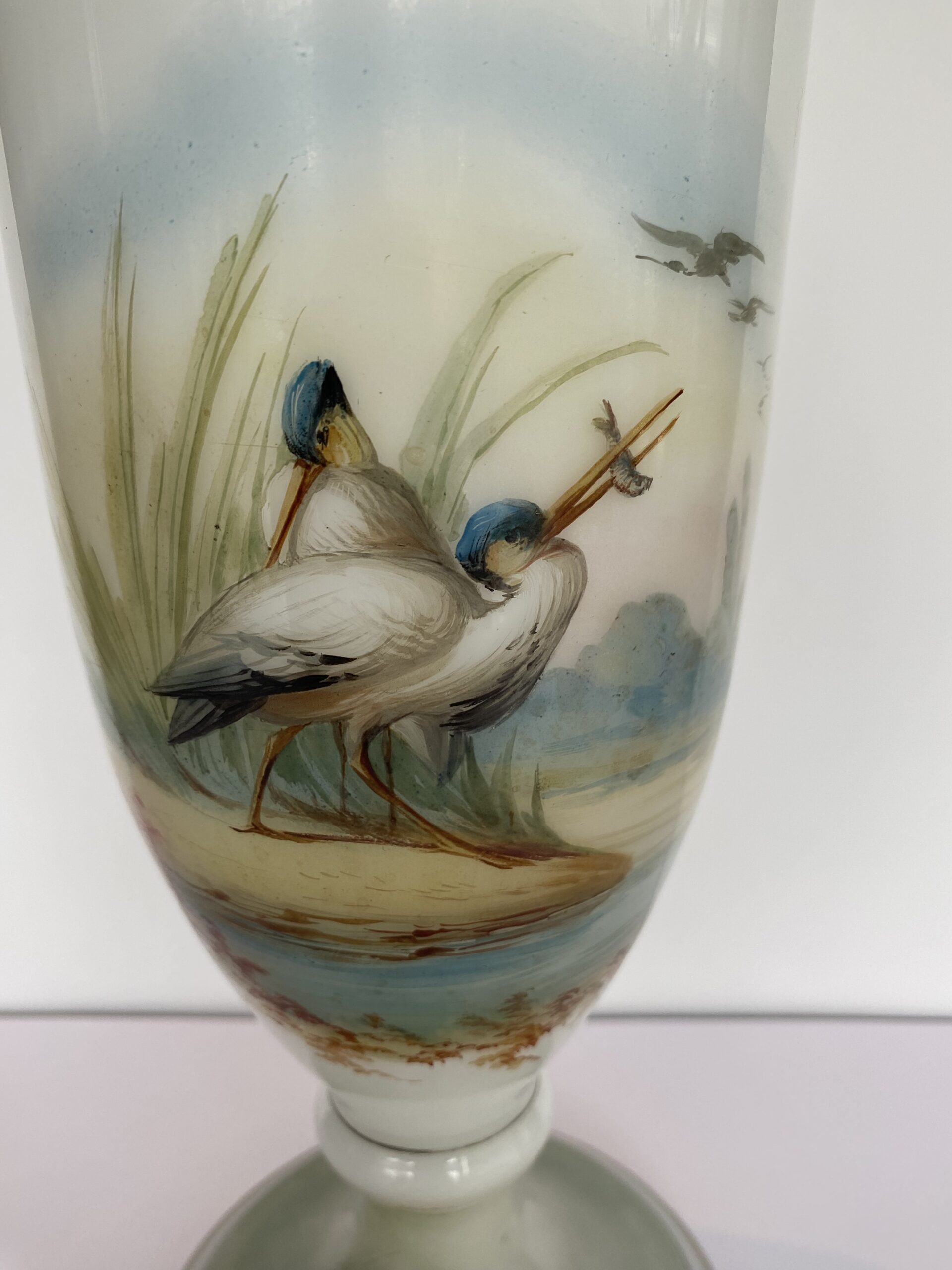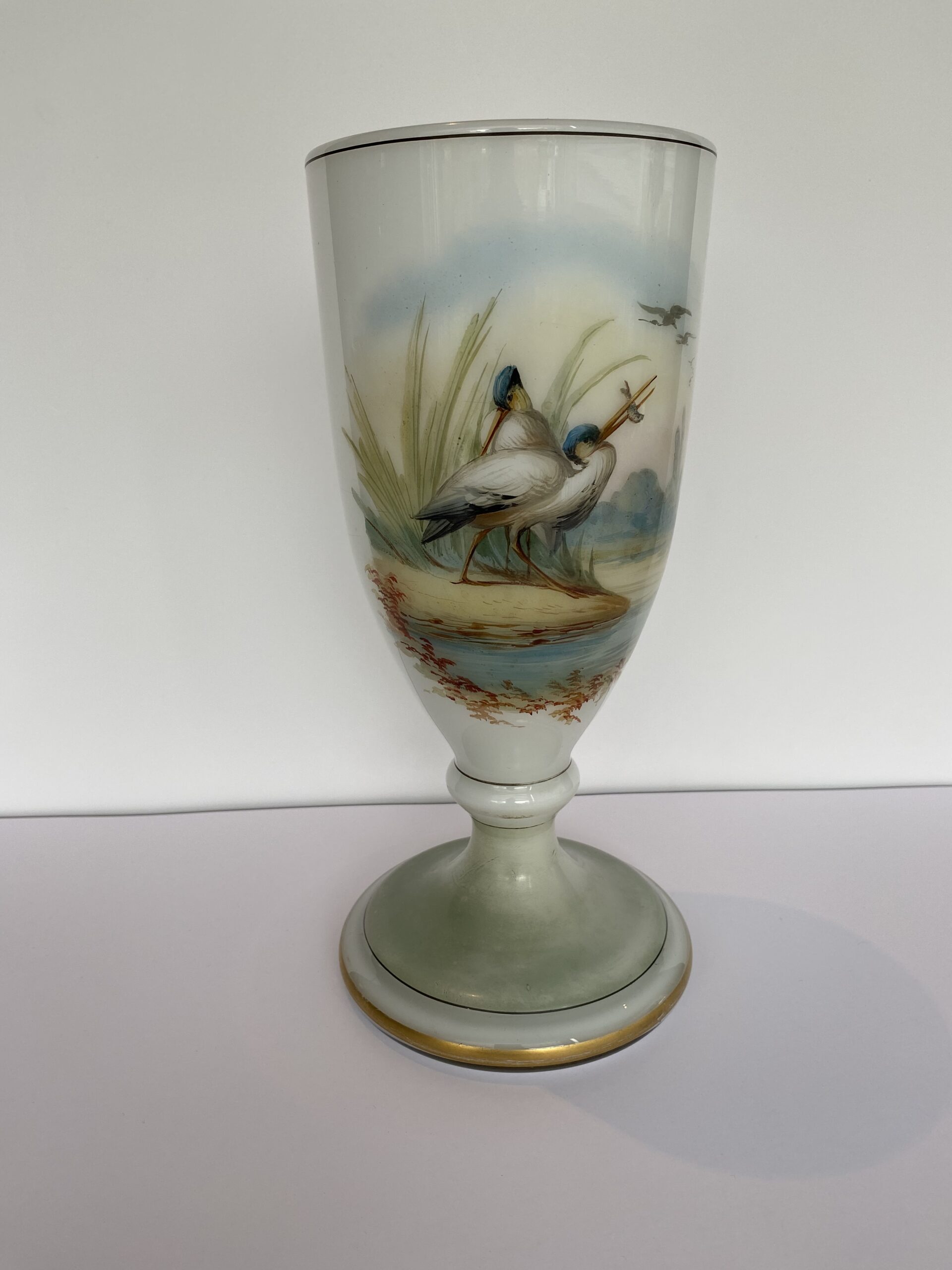 Painted naturalistic decor showing two wading birds at the edge of the water. Enhanced with circle-shaped gilding.
