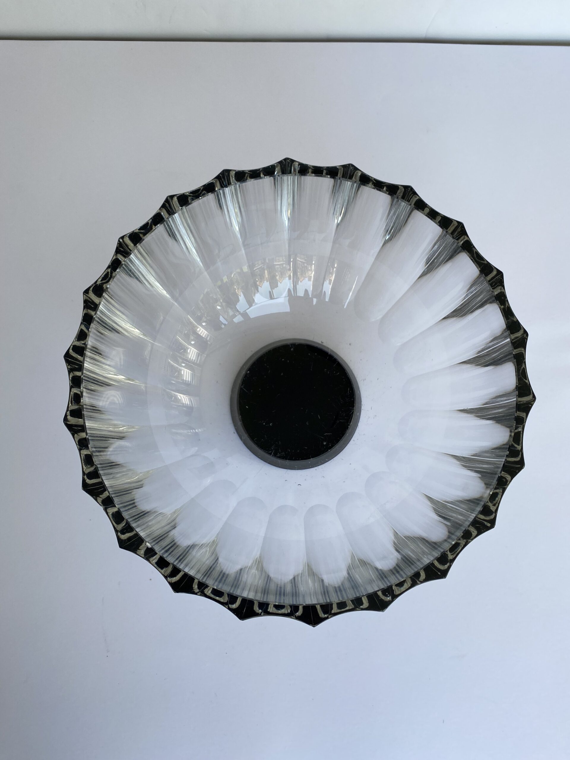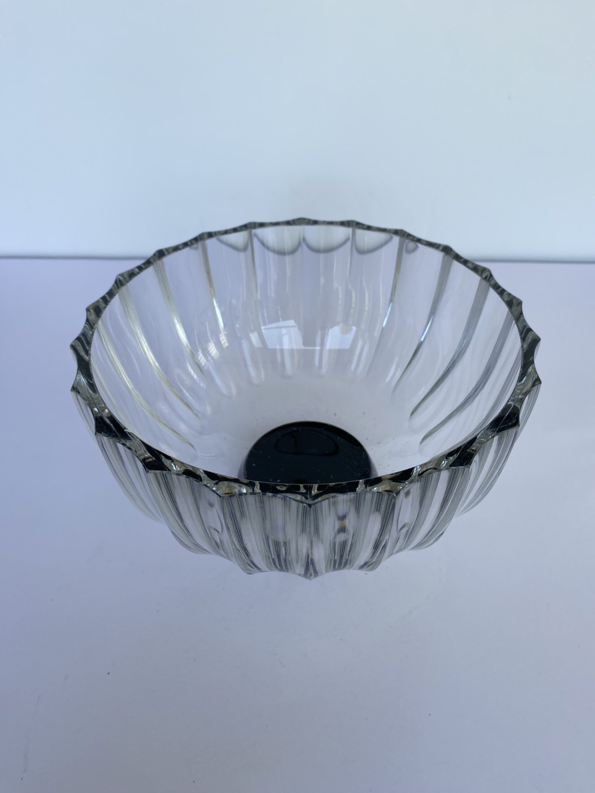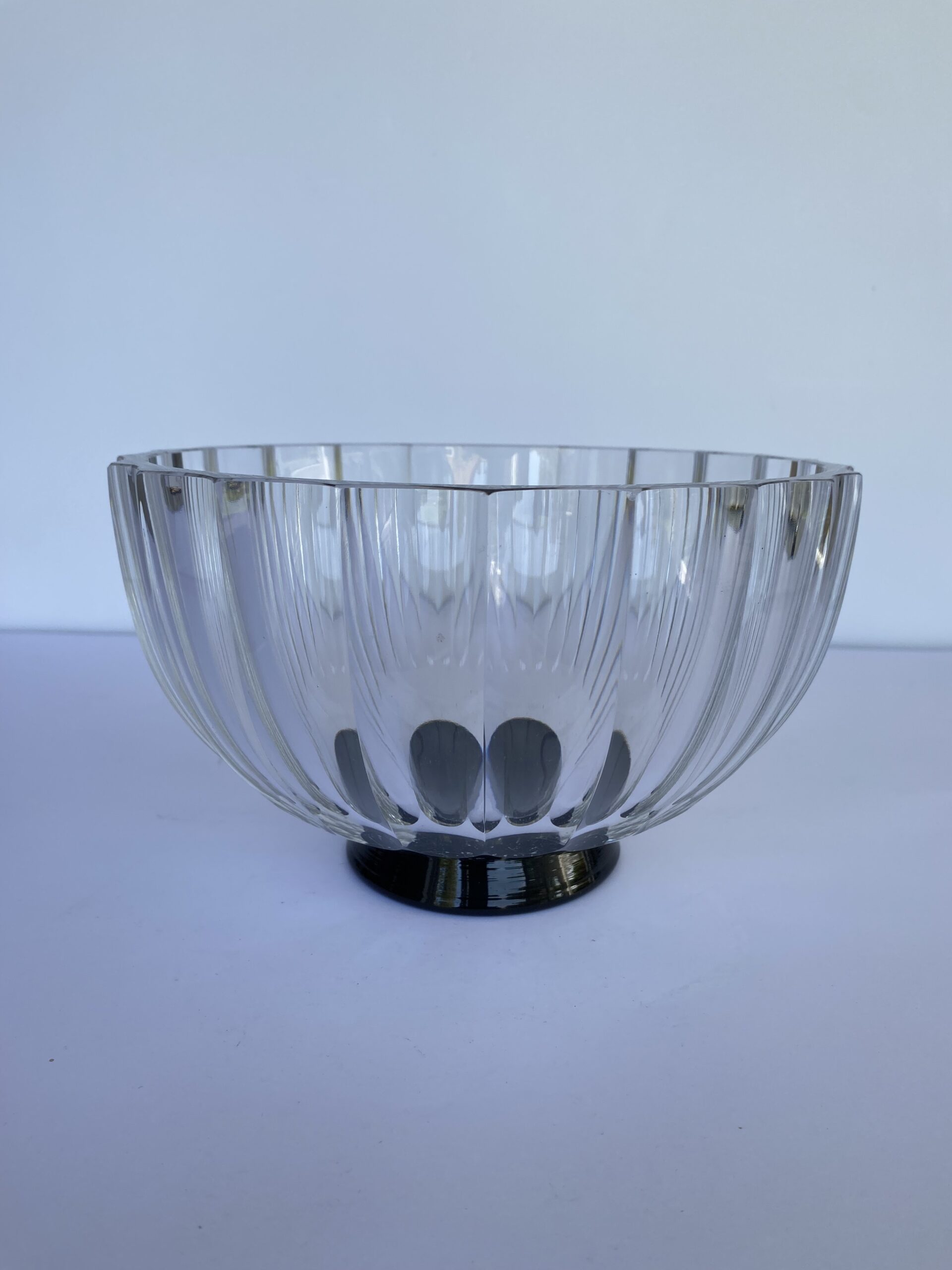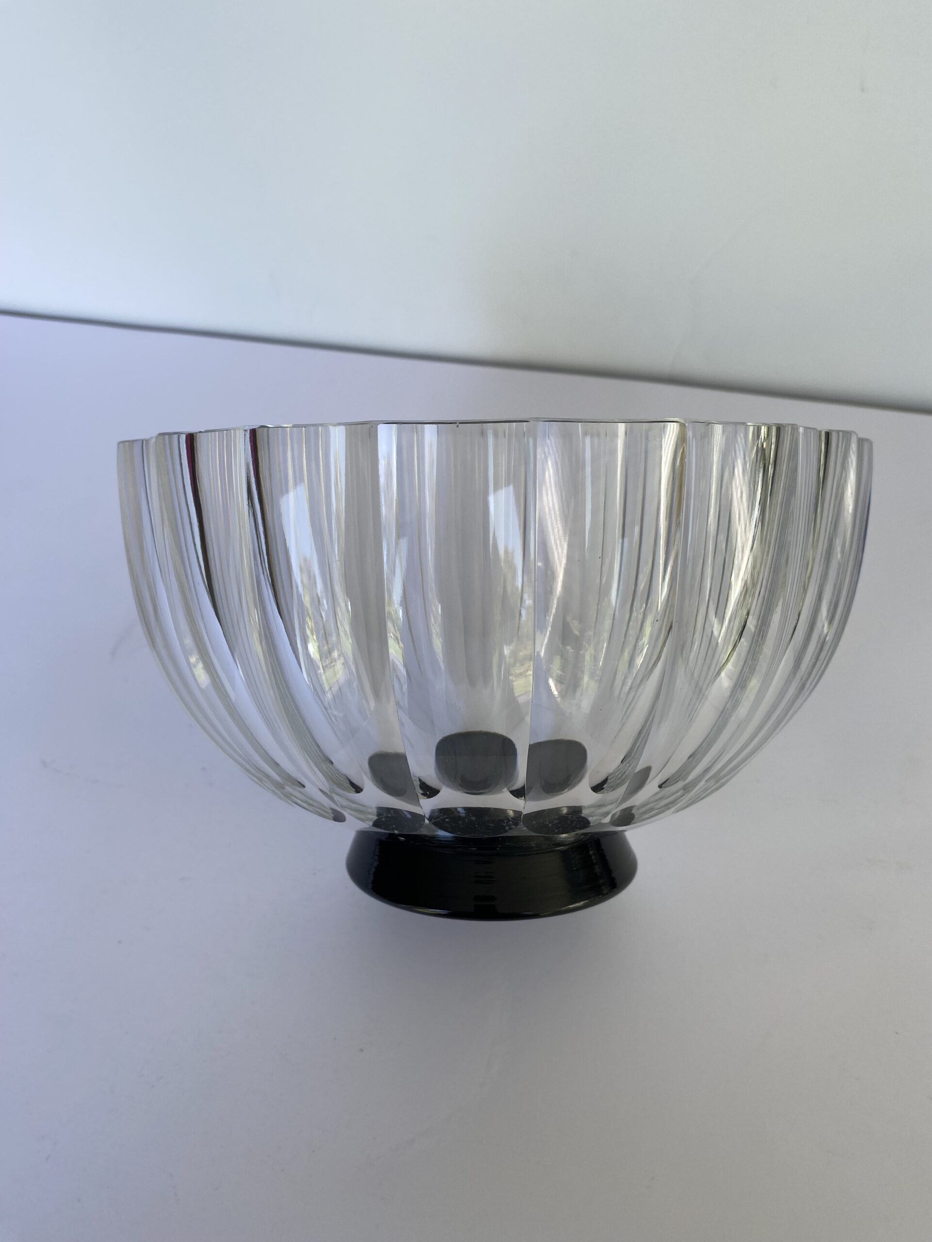 Faceted clear crystal bowl on a black circular foot.