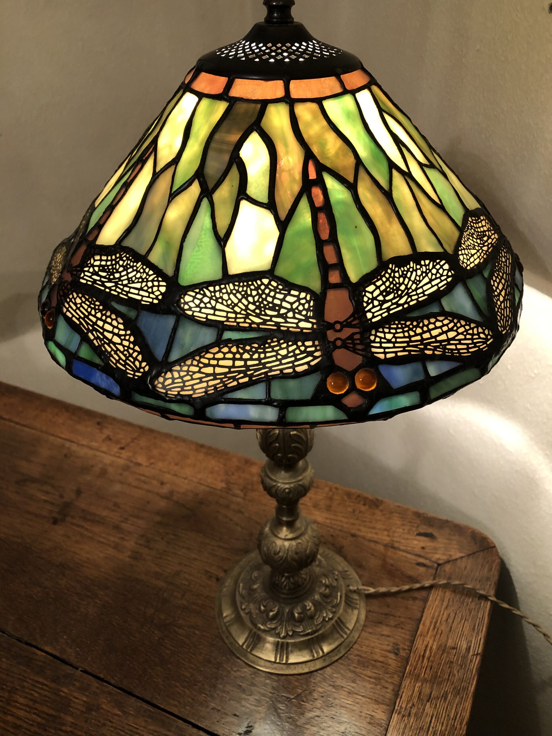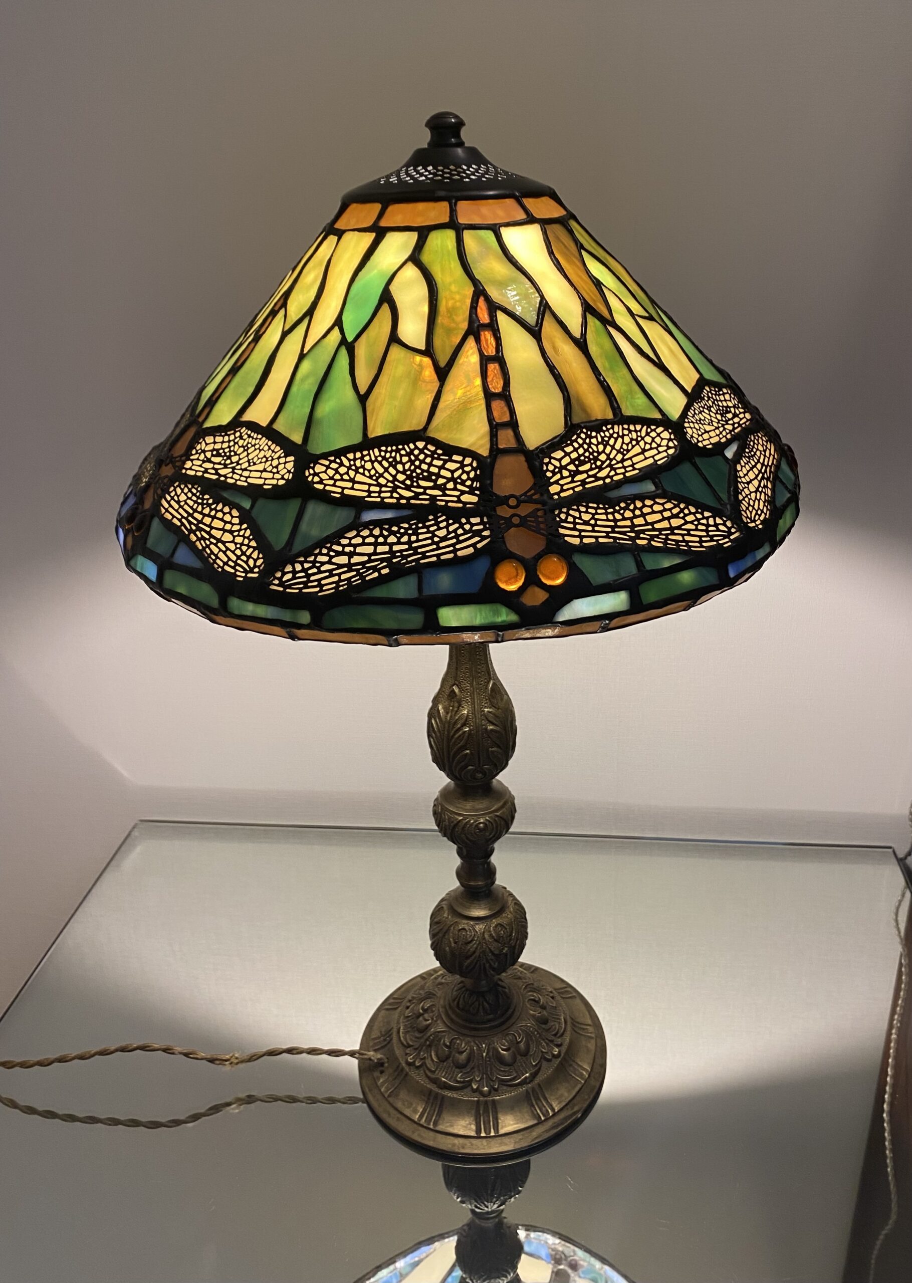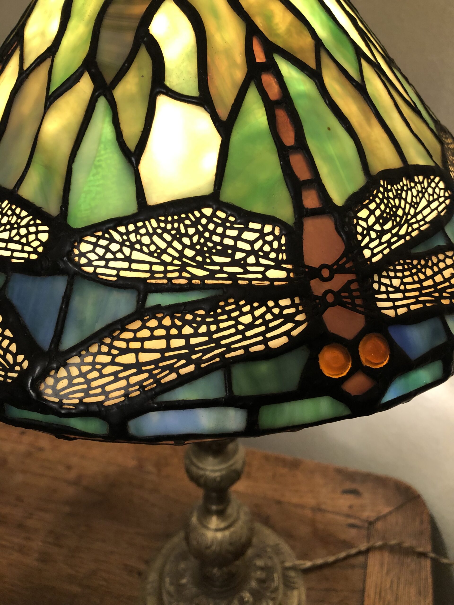 The brass base is topped by a stained glass shade depicting dragonflies.