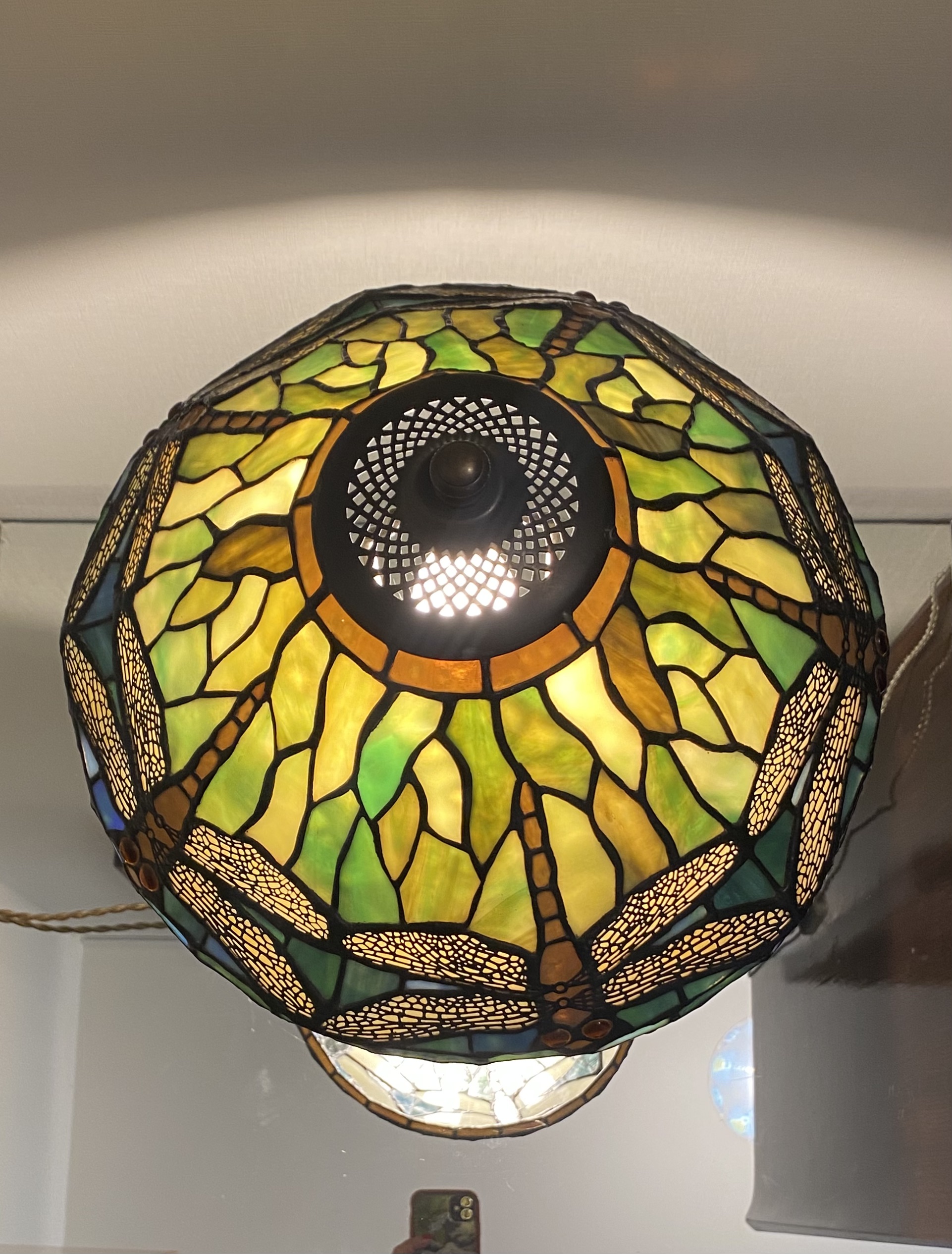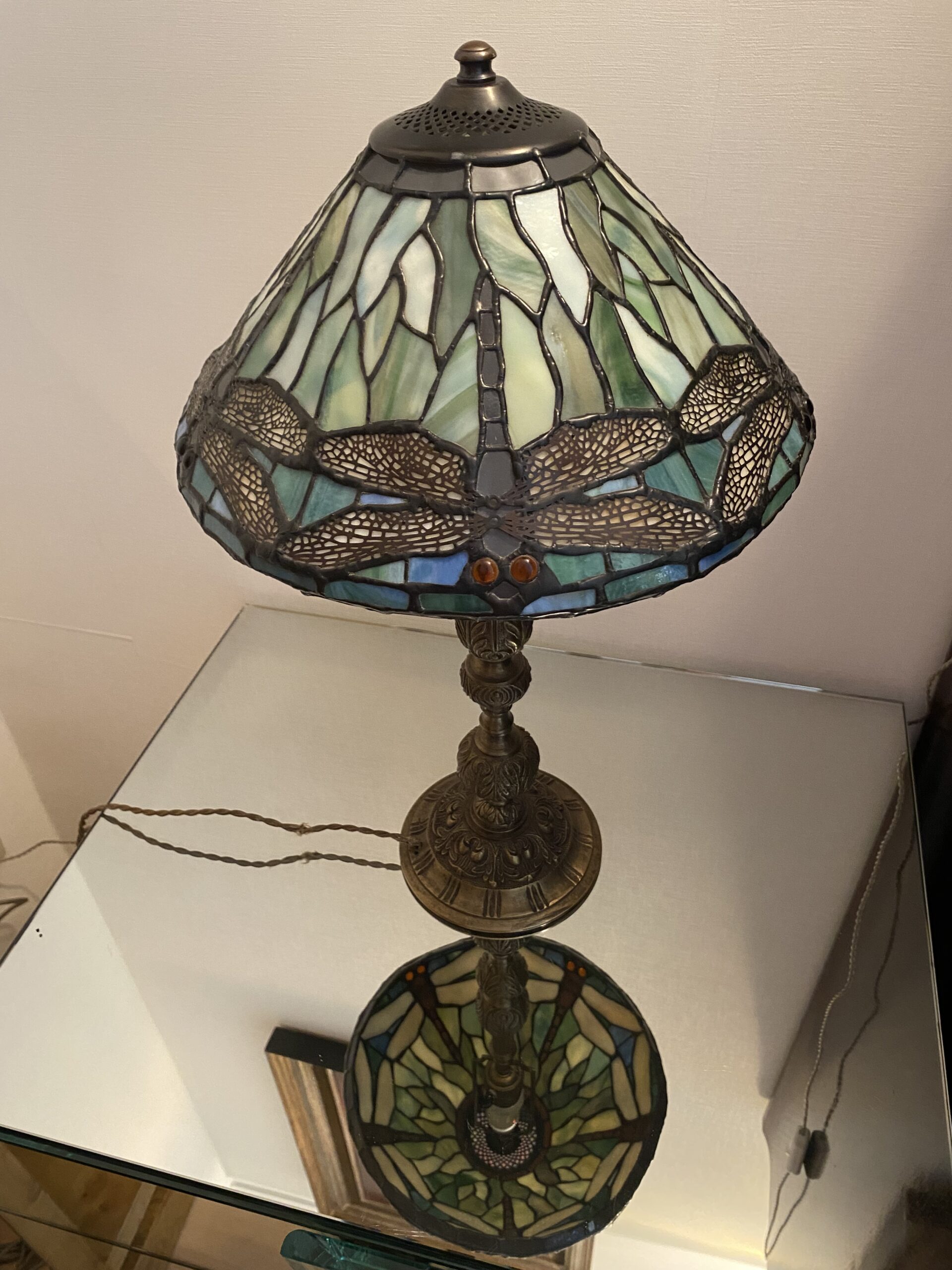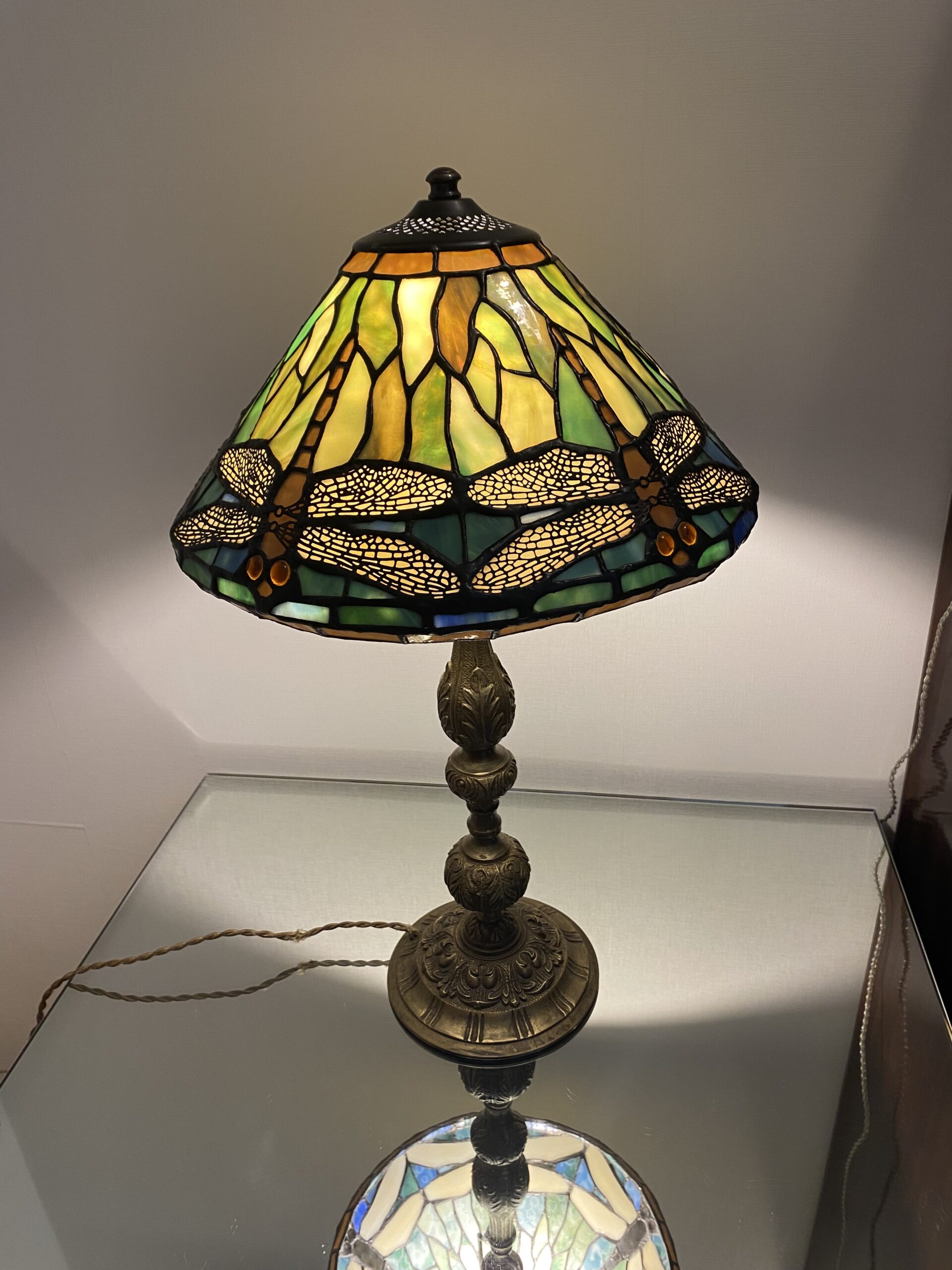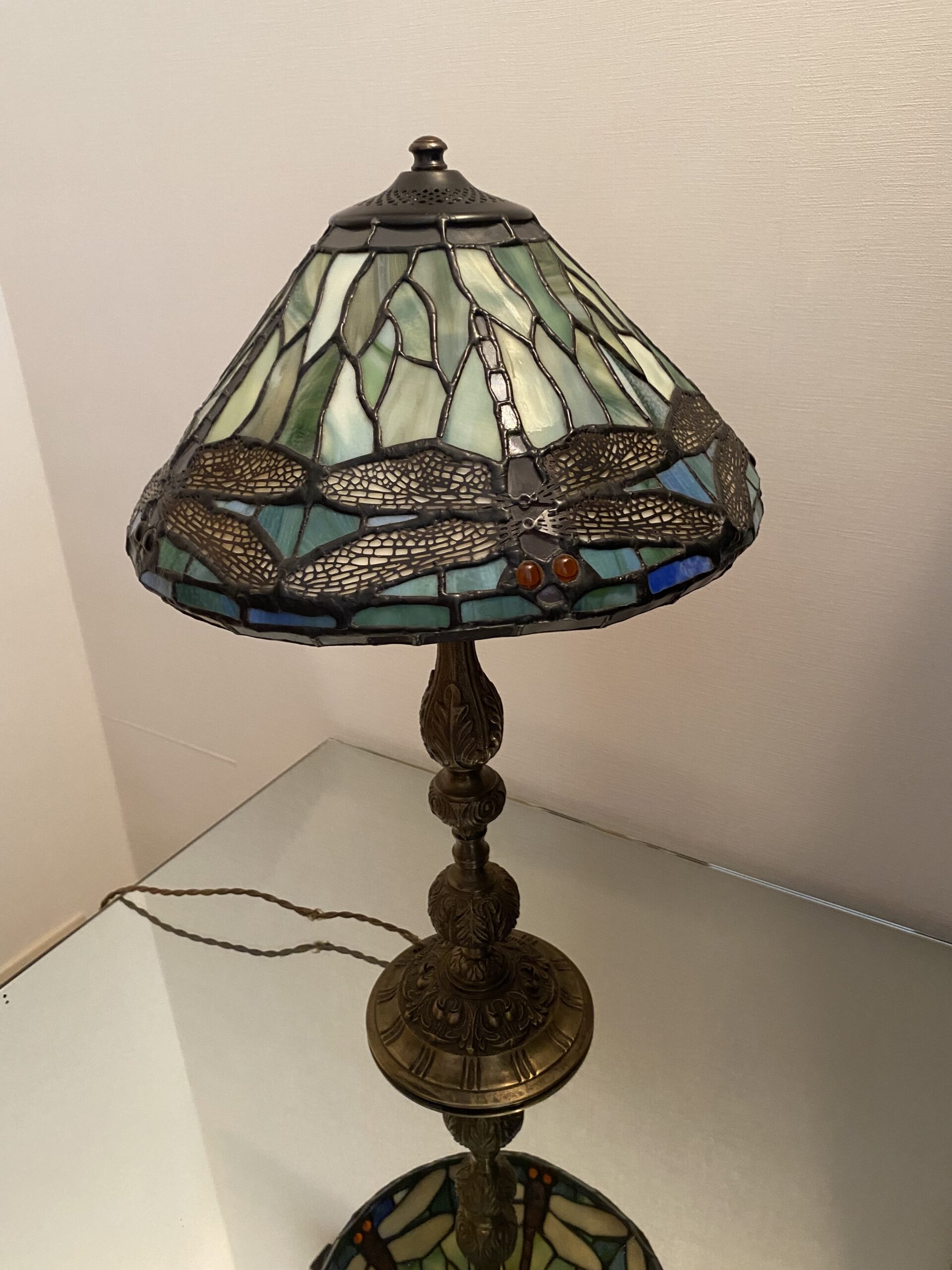 The brass base is topped by a stained glass shade depicting dragonflies.