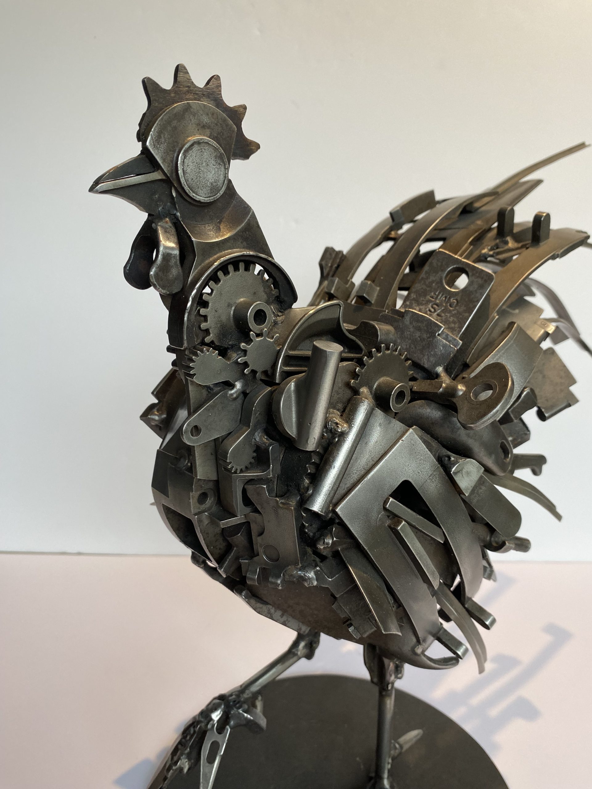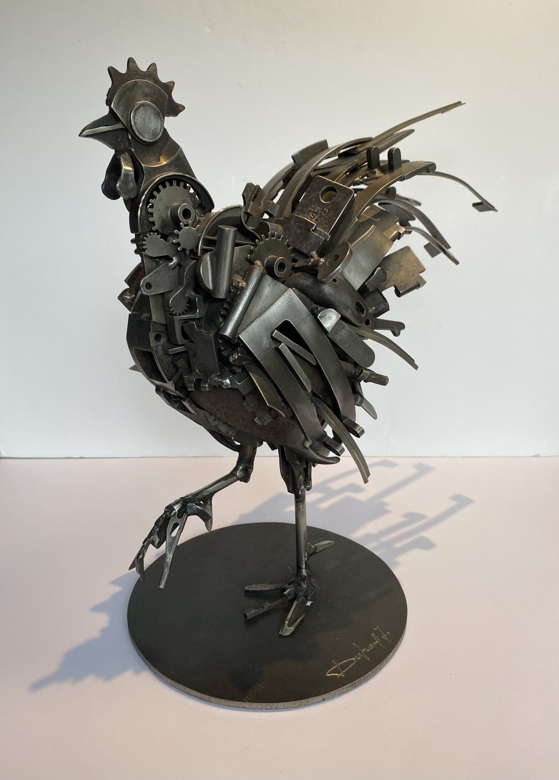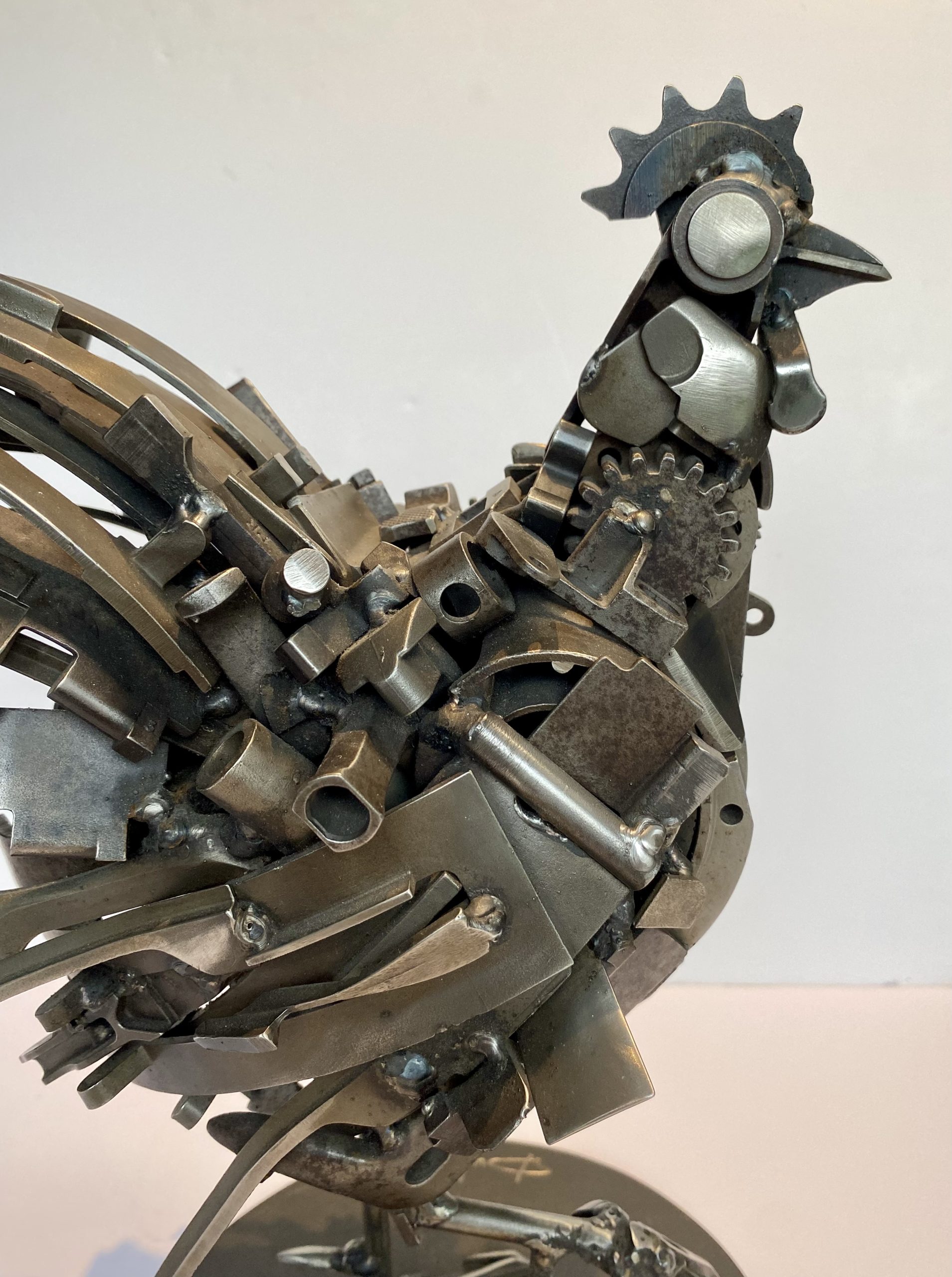 Proud bass-short animal, this rooster is made by assembling metal parts. He has a beautiful look with his raised paw and his long tail, and lorns his surroundings with his large round eye.