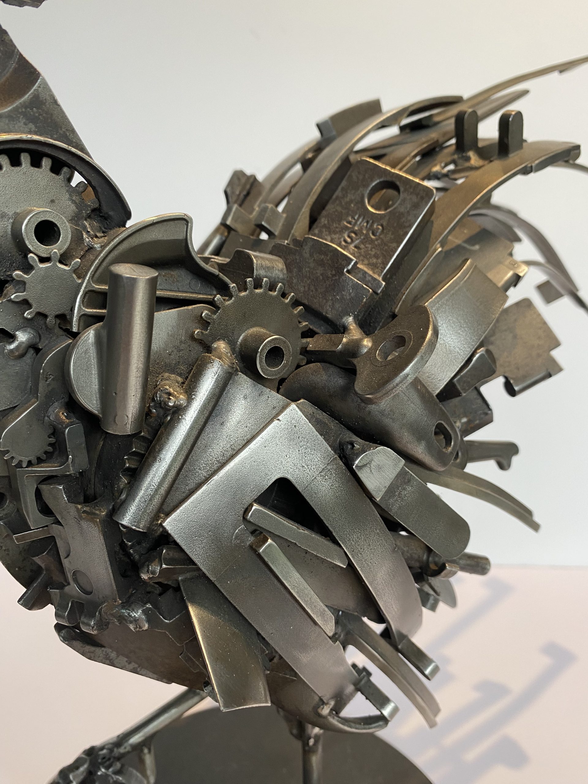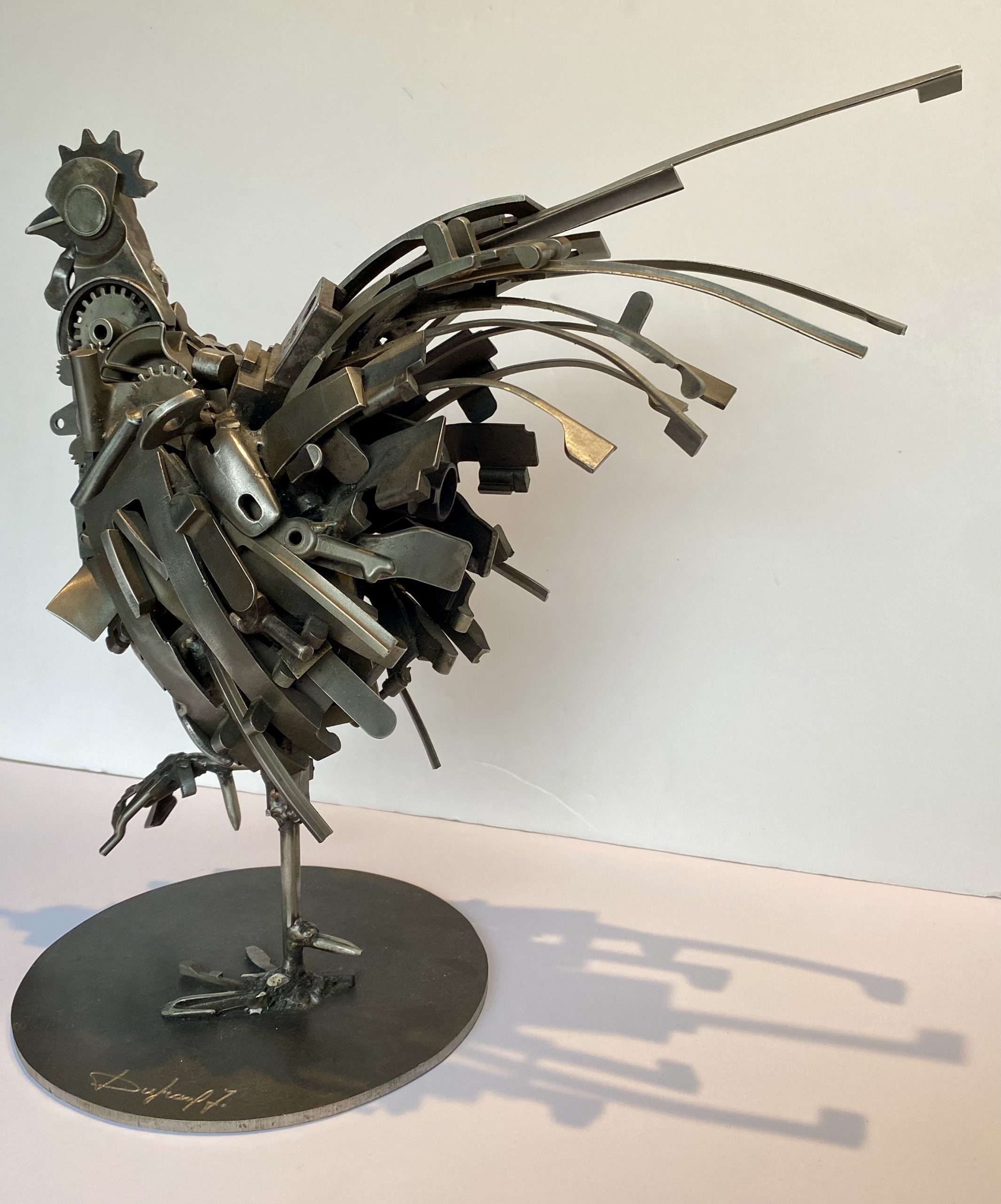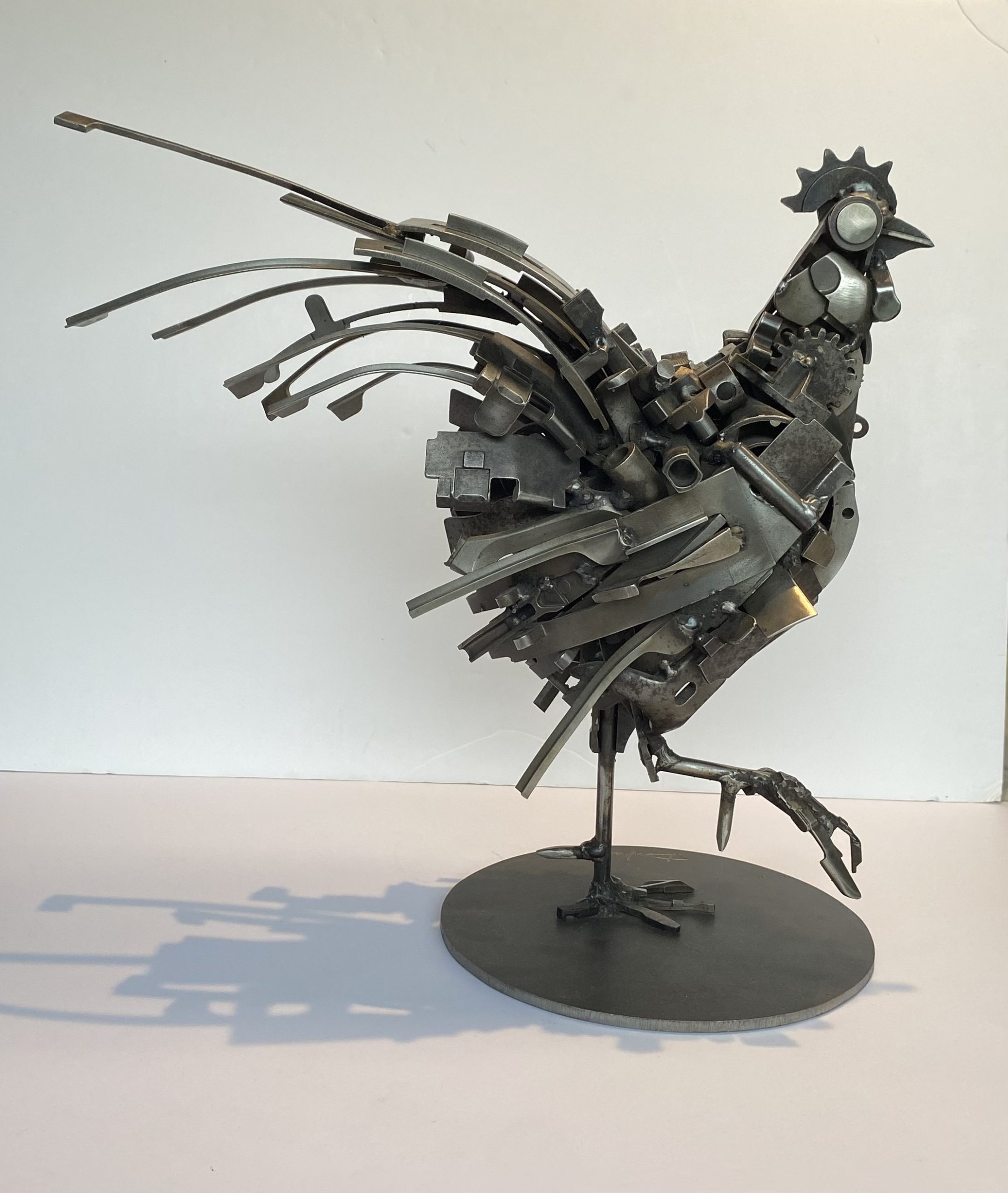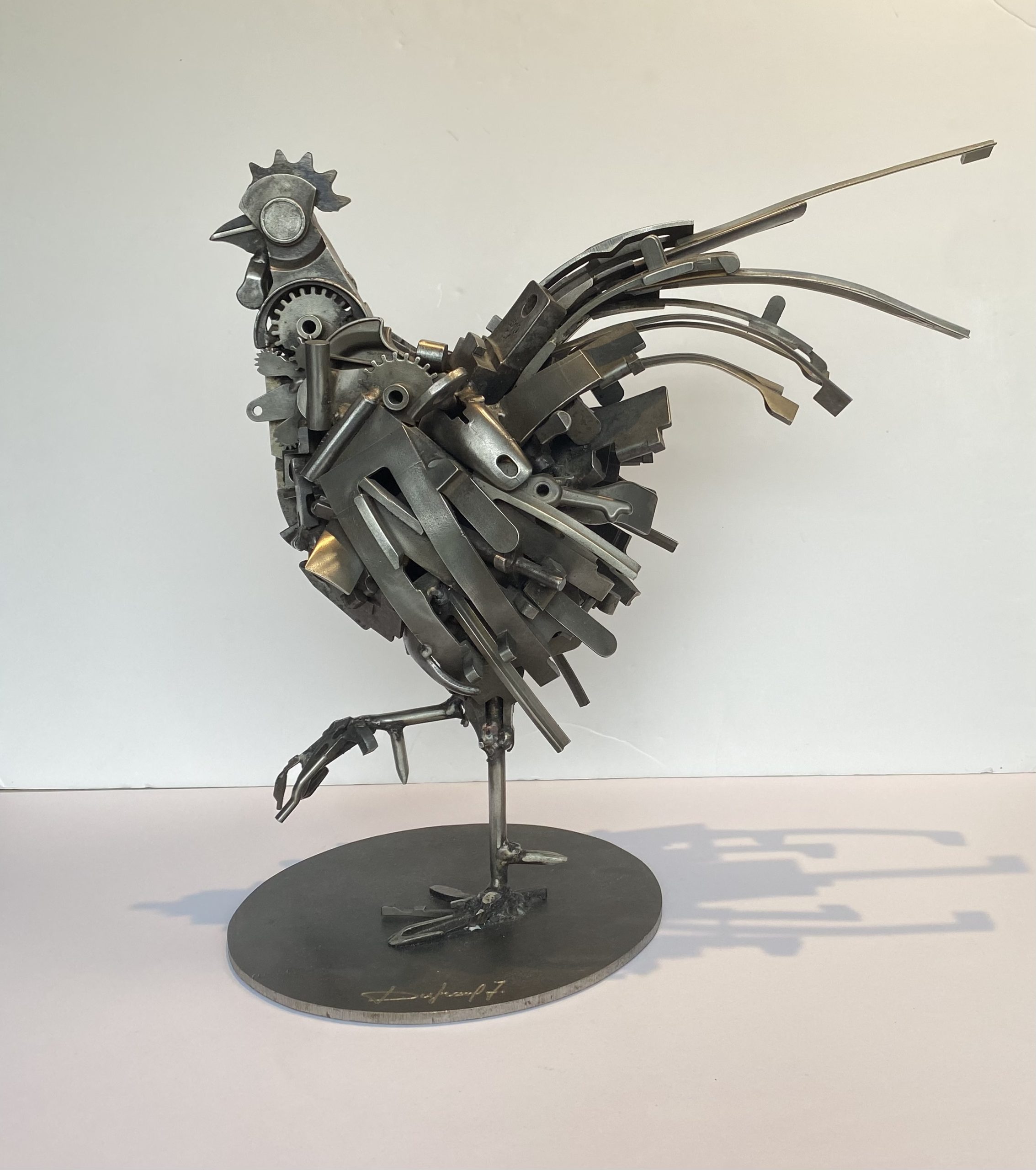 Proud bass-short animal, this rooster is made by assembling metal parts. He has a beautiful look with his raised paw and his long tail, and lorns his surroundings with his large round eye.