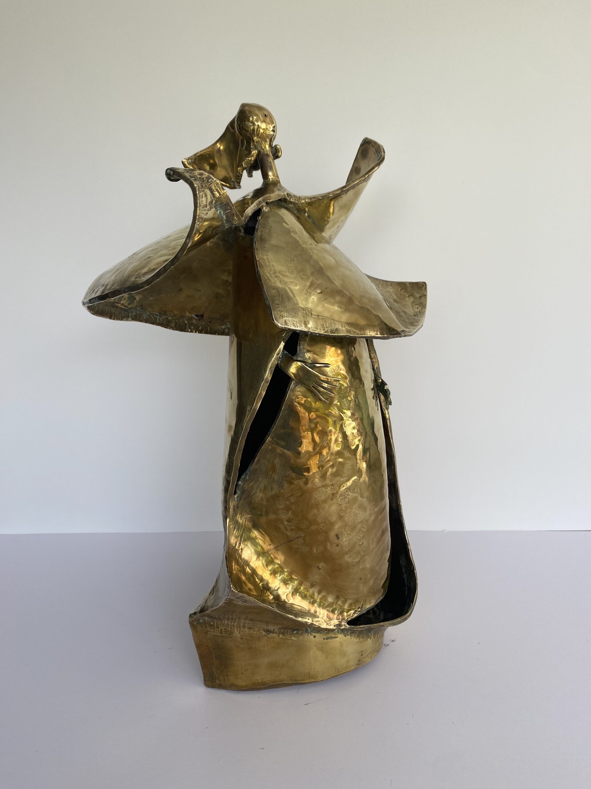 Gilded bronze sculpture of a woman wearing a long dress, headdress and short cape.