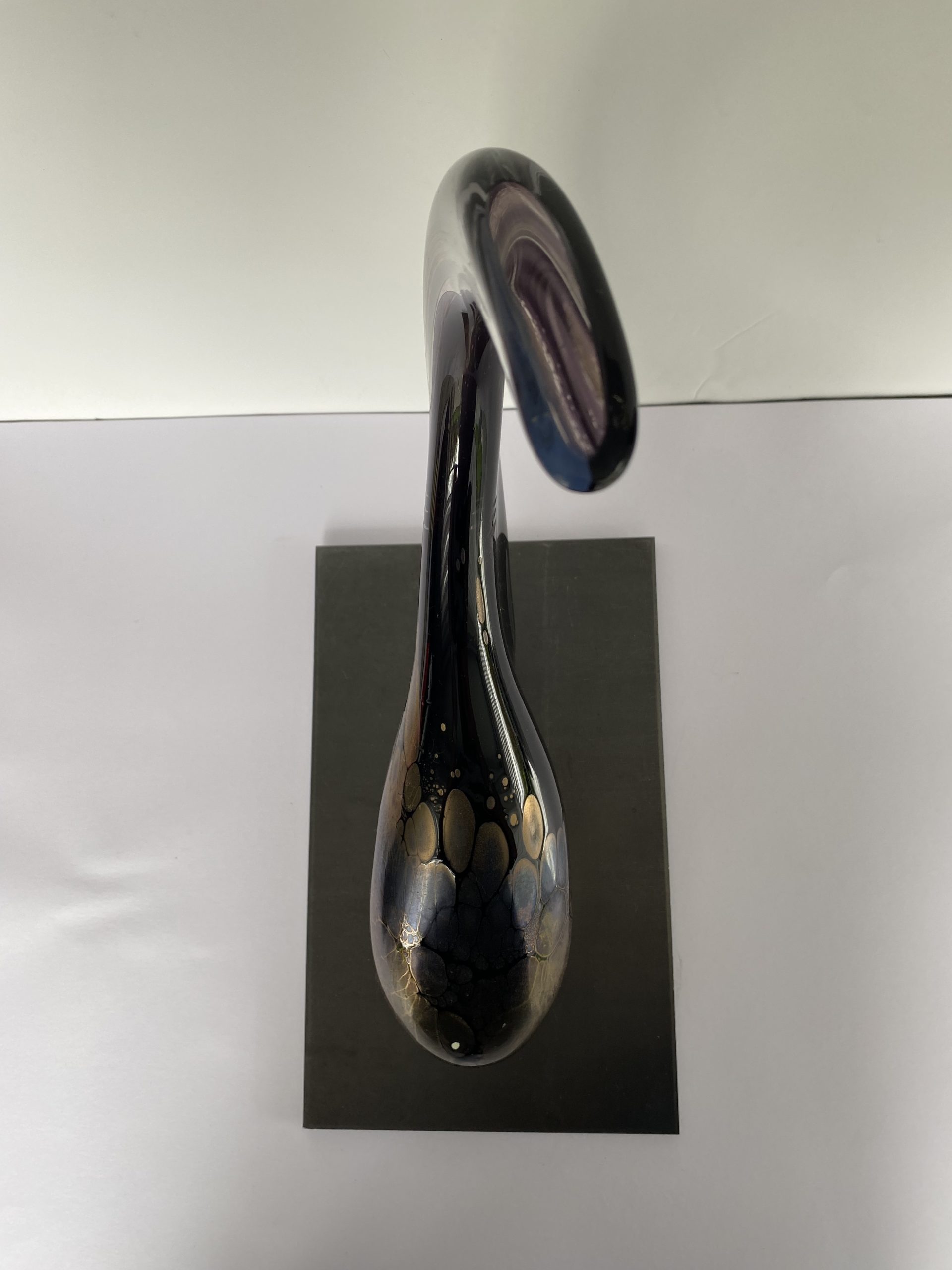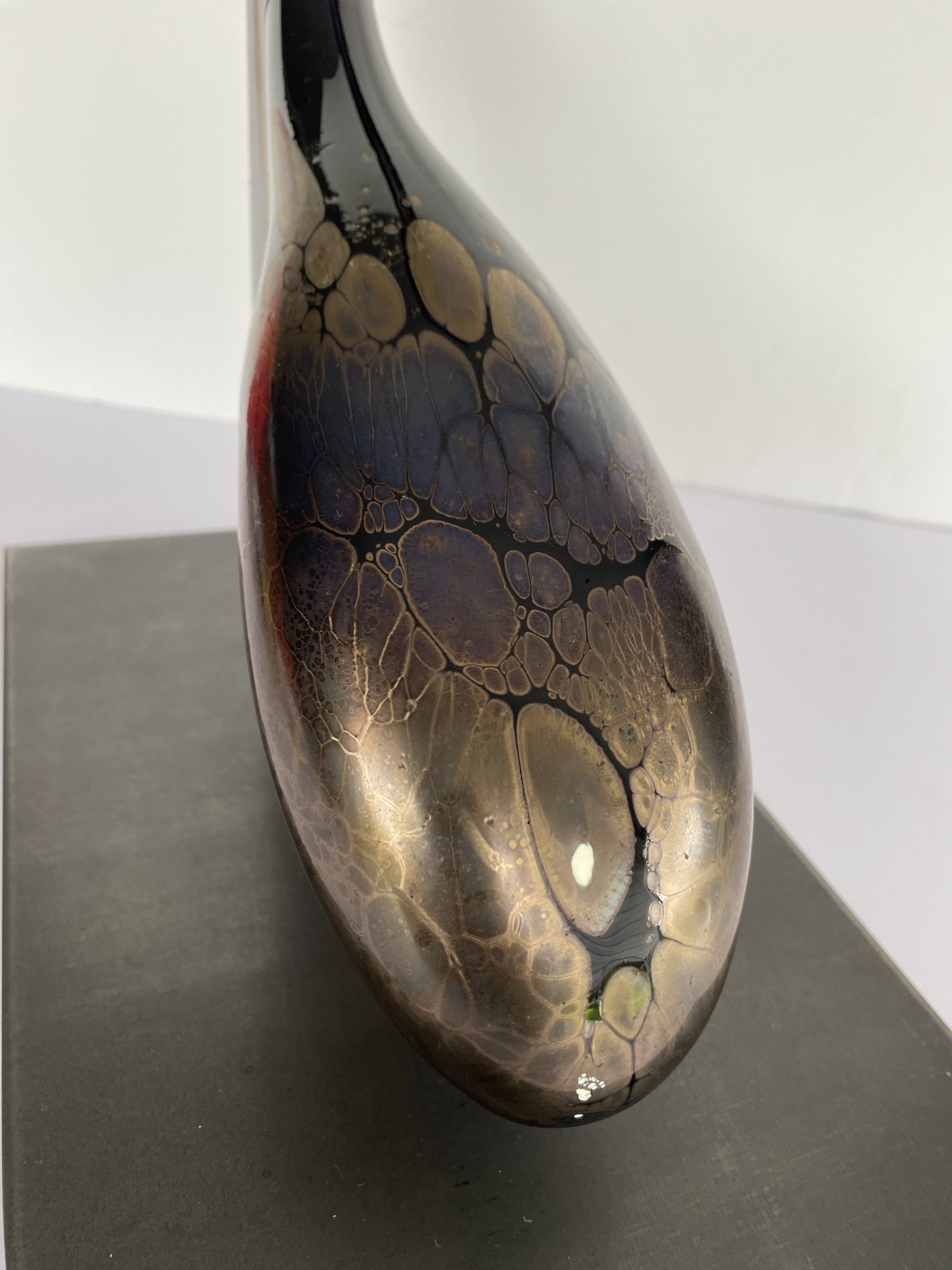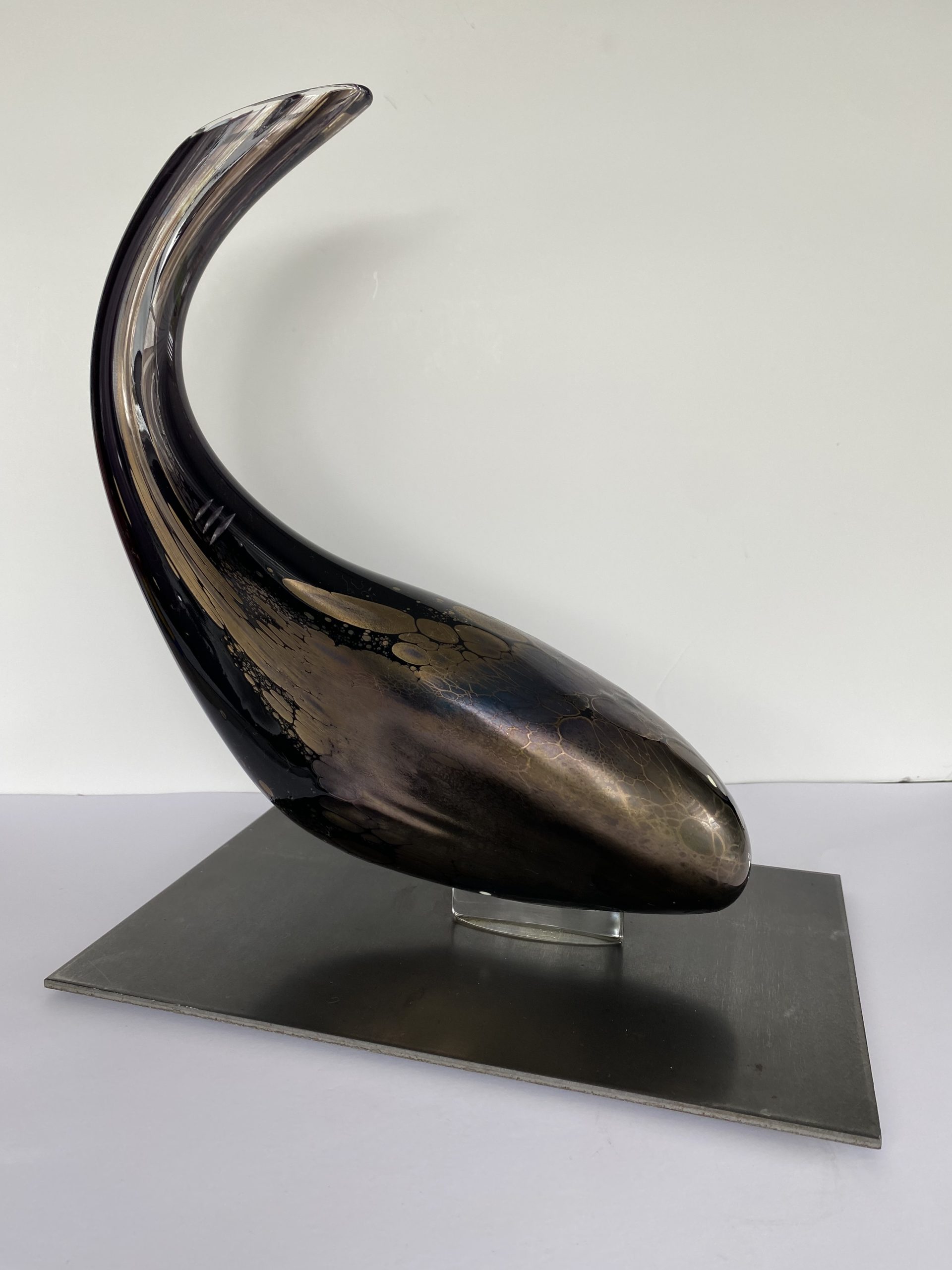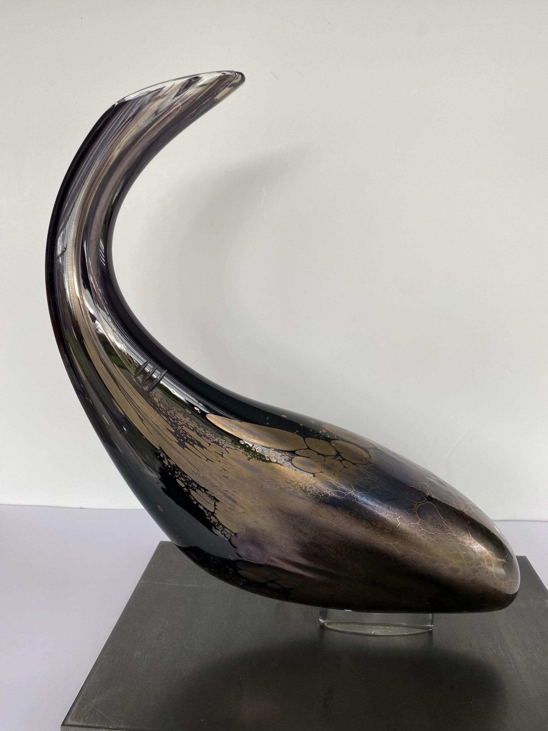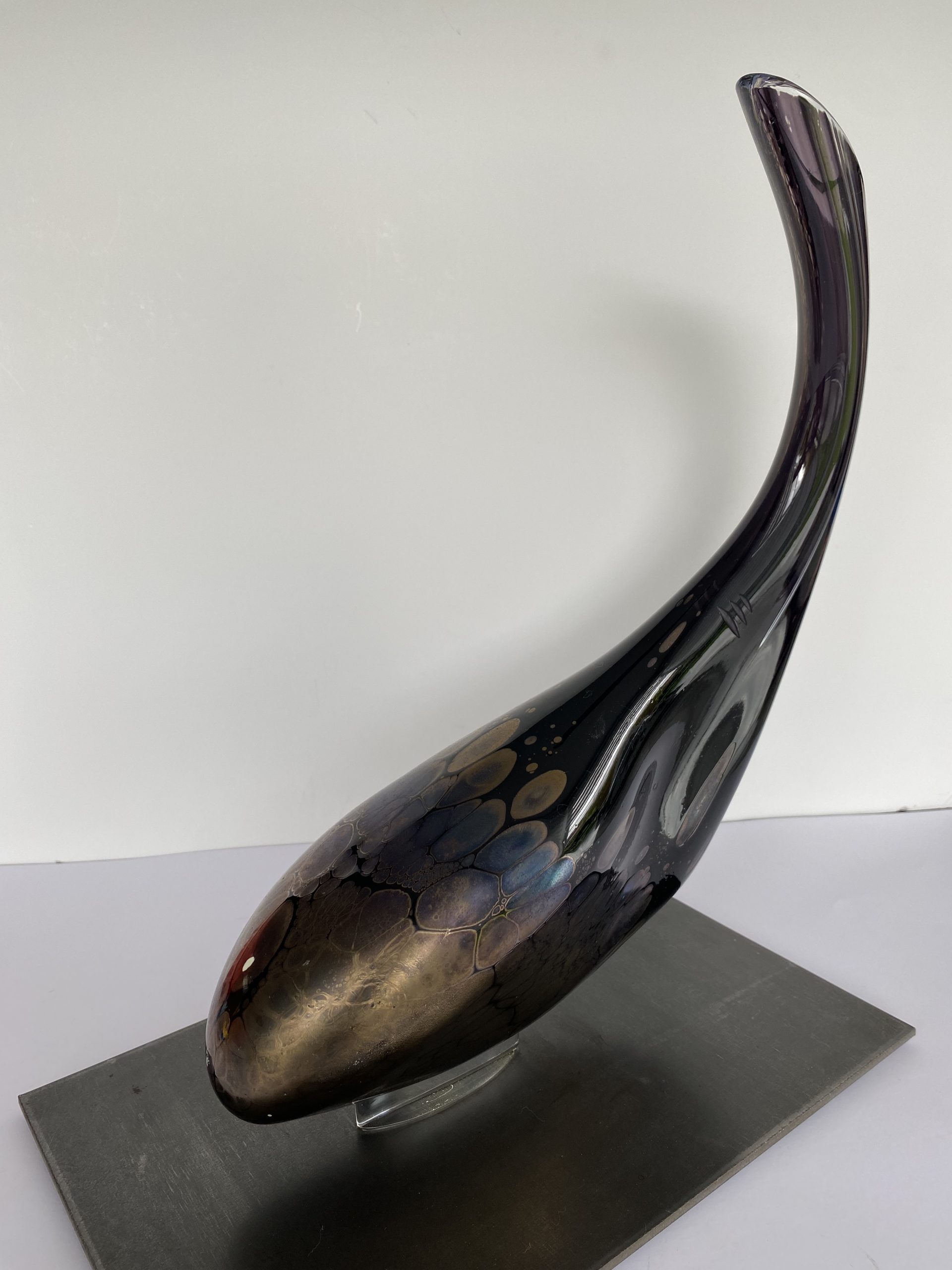 Contemporary abstract sculpture made of blown crystal in Val-saint-Lambert. Although unsigned, the artist is Eric Maquet*. It is a unique piece. The dominant color is purple, with oxides giving iridescent golden reflections mainly on the rounded front tip.