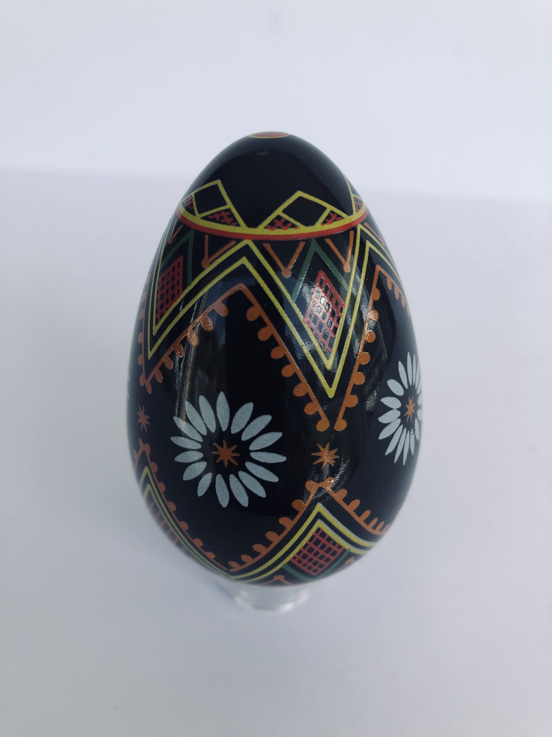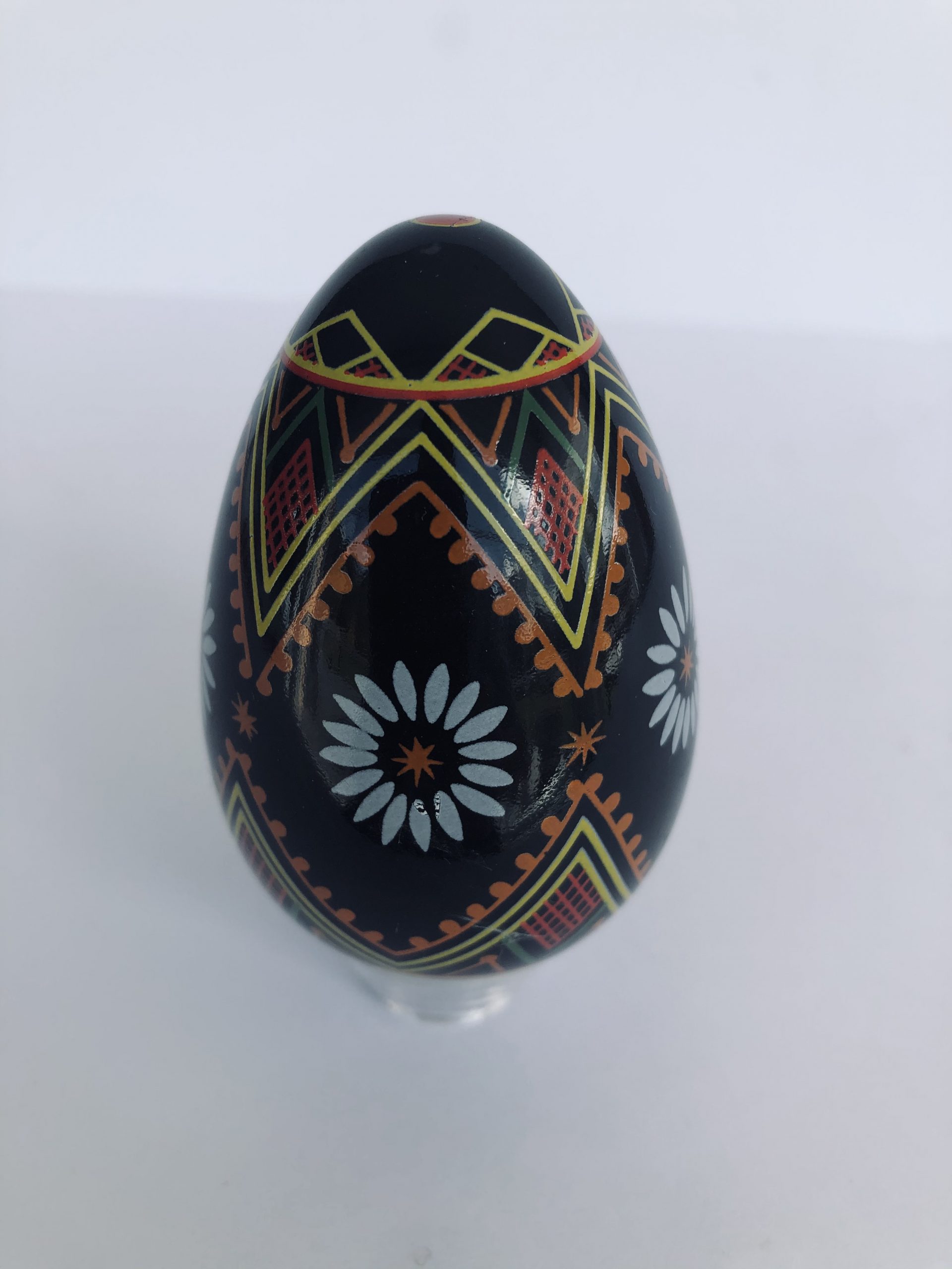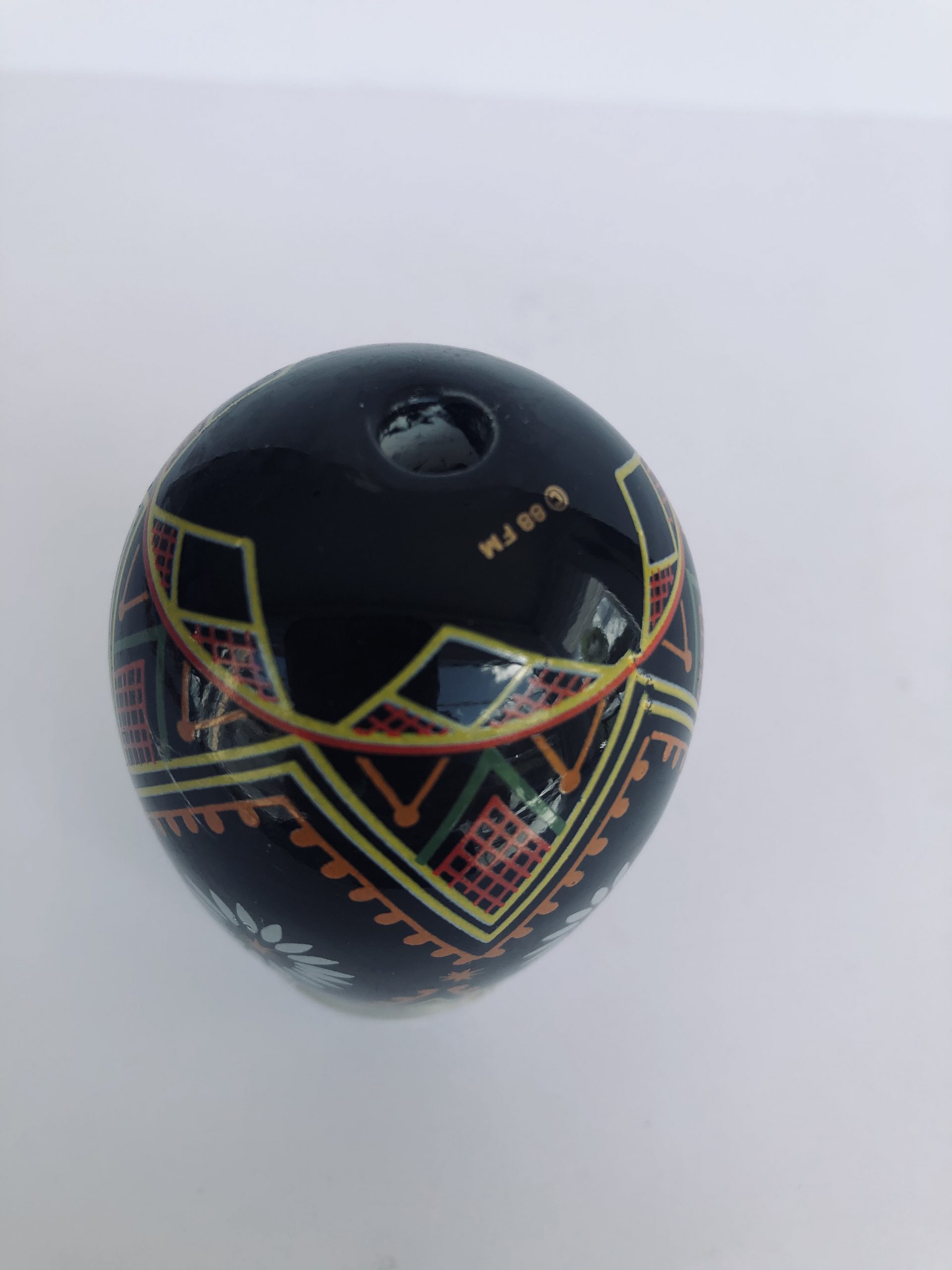 Oeuf en céramique avec motifs géométriques ukrainiens. H: 7 cm. P: 52g.