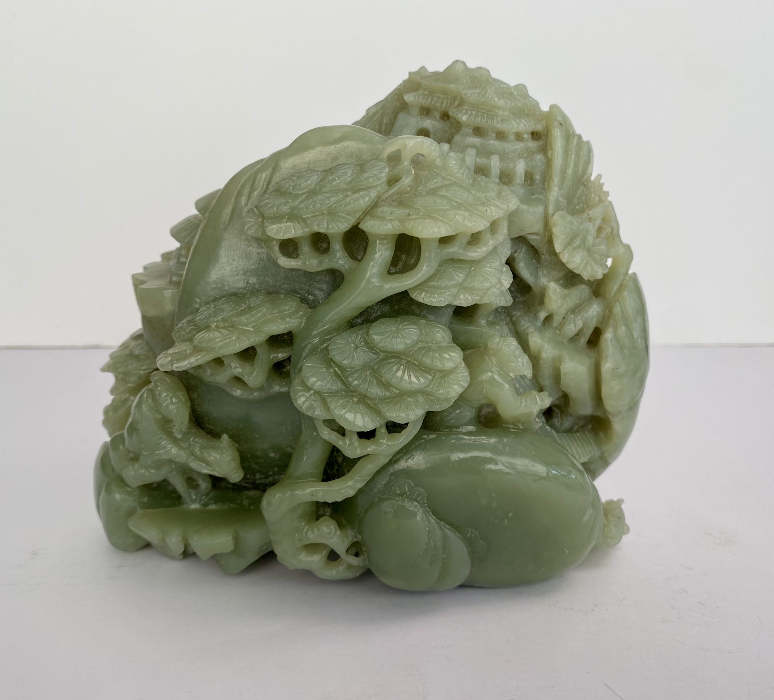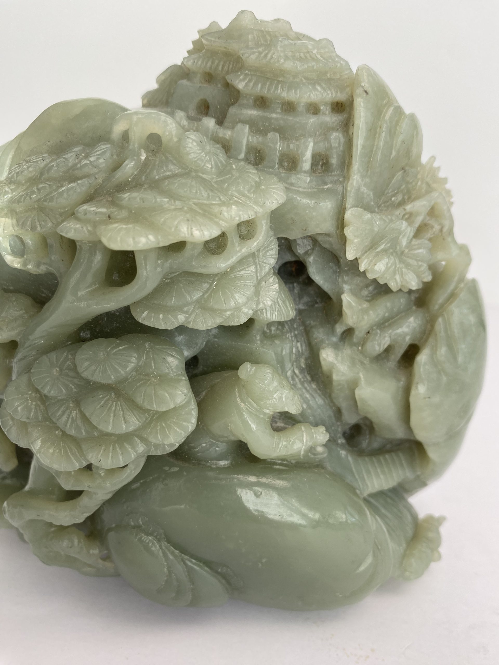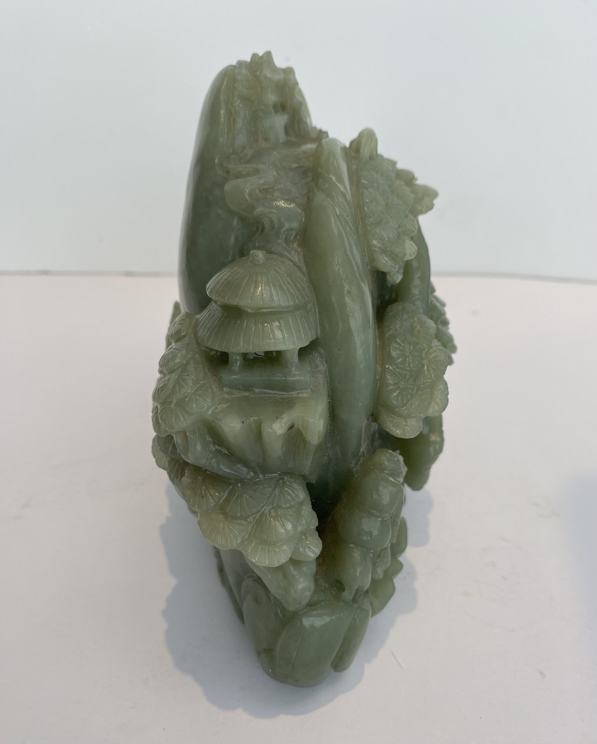 Carved jade block representing trees and characters in the rocks. Very decorative.