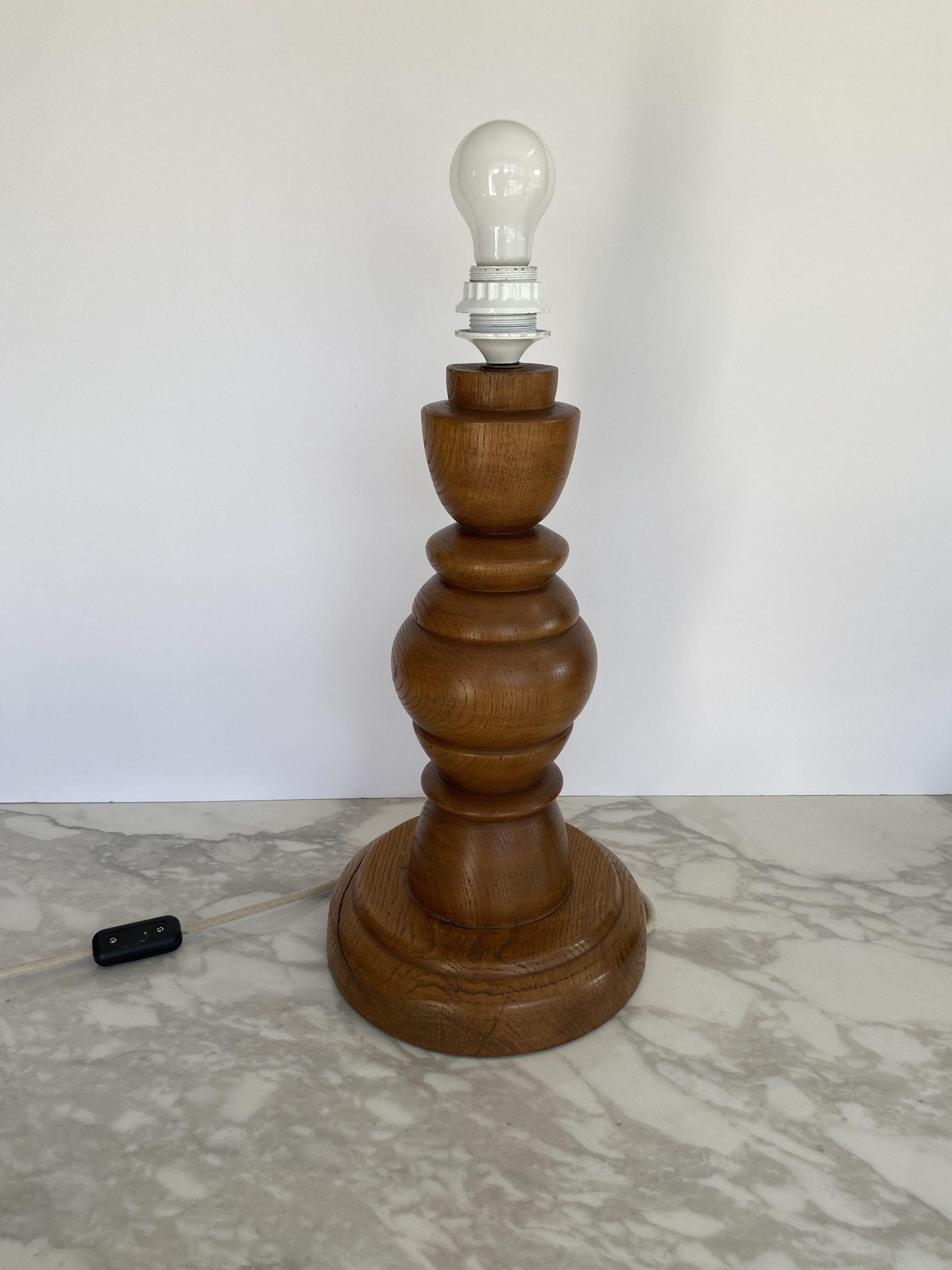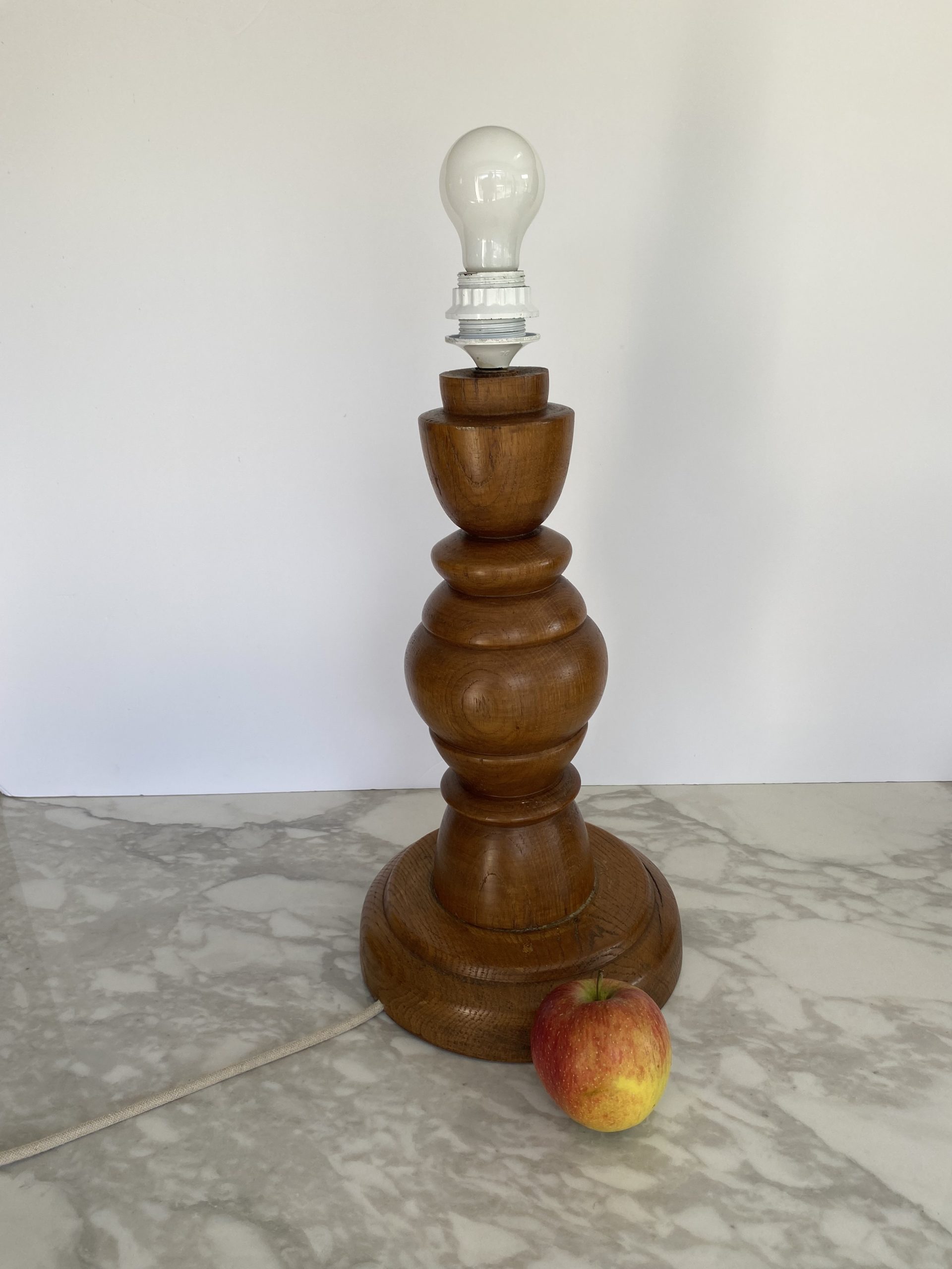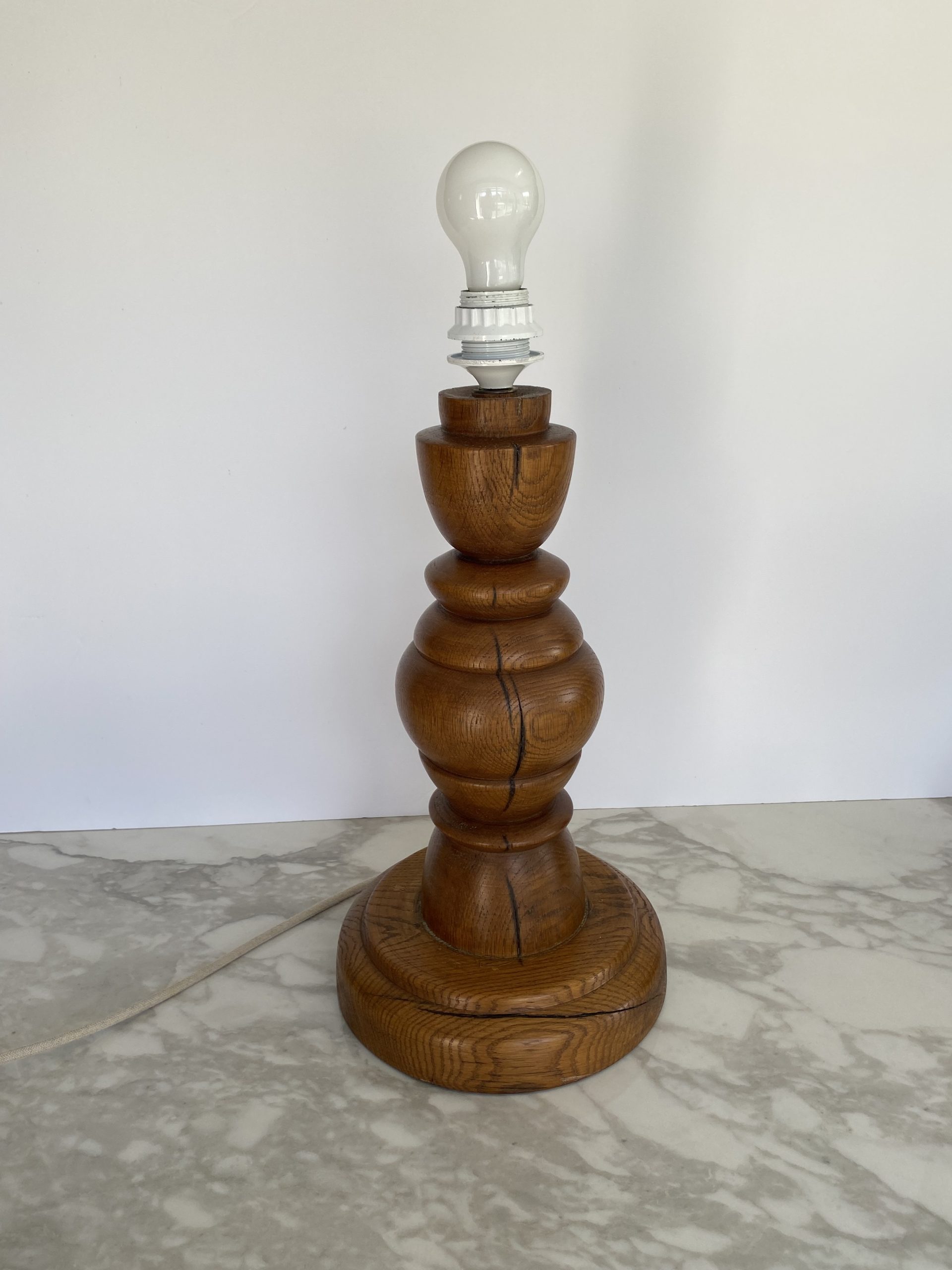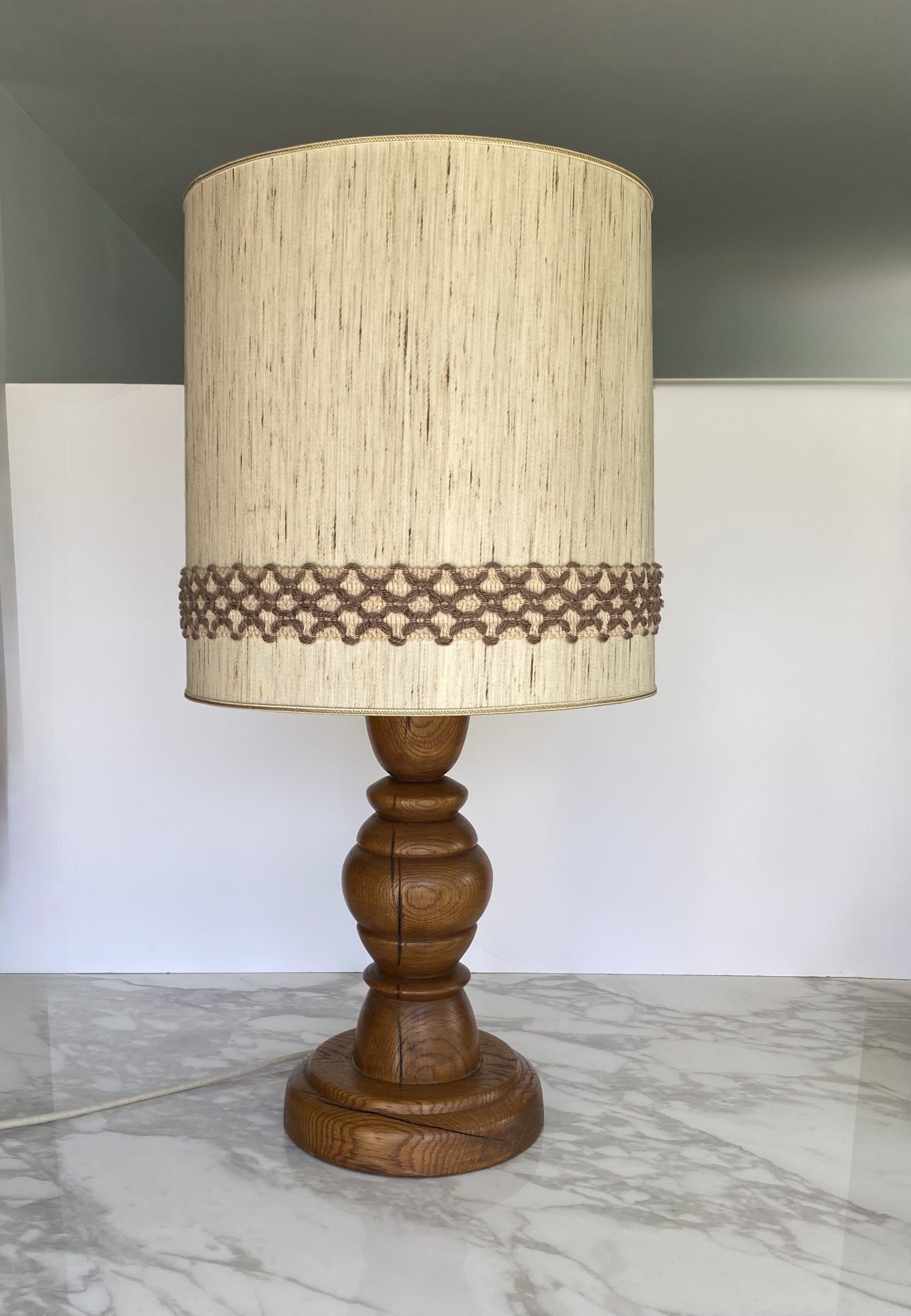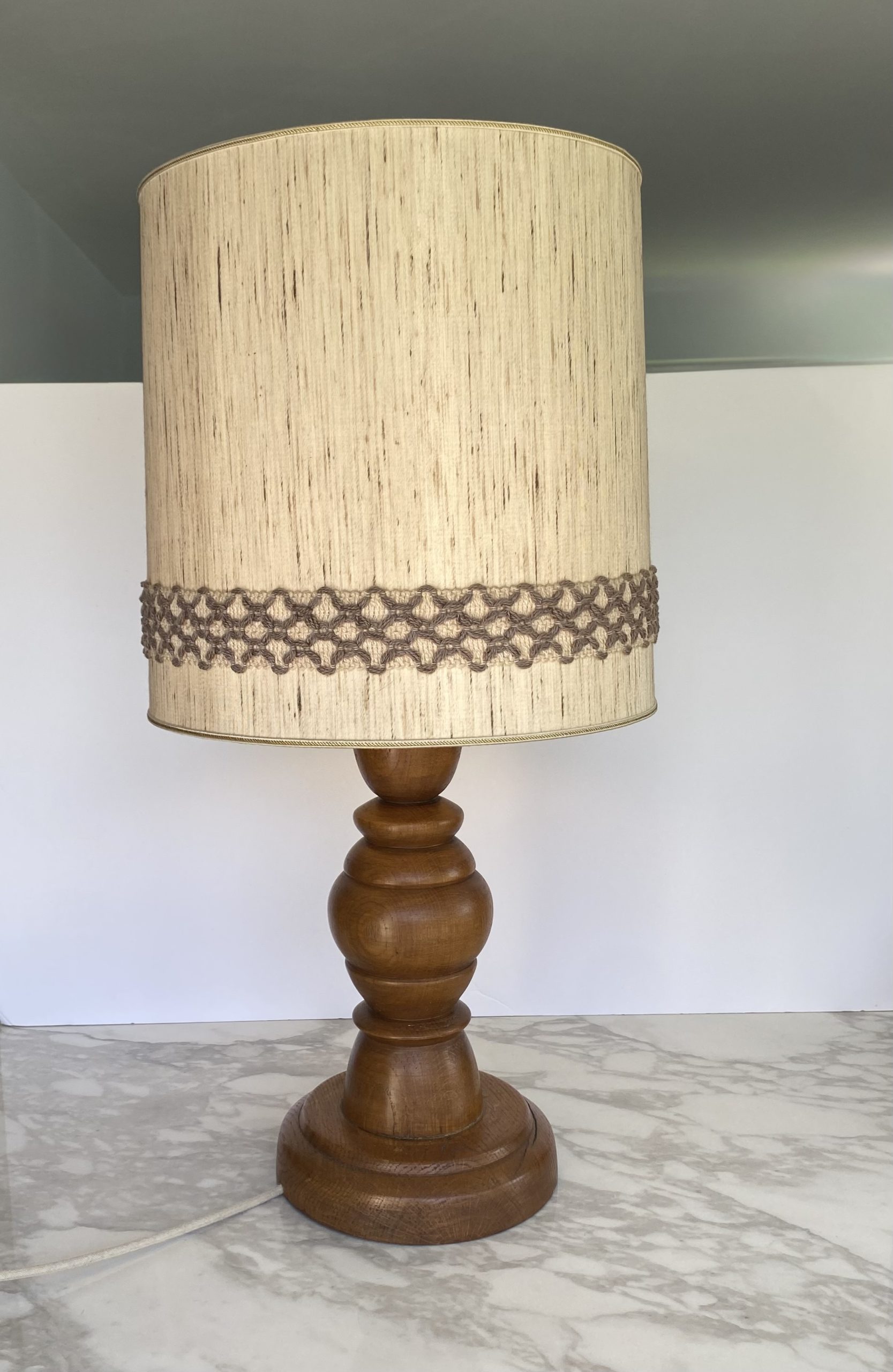 Large table lamp Vintage, 60s – 70s, Scandinavian. Very nice foot in turned wood, probably oak with dark circles, with a matching lampshade: in beige fabric with slightly brownier threads, textured, and a large decorative ribbon in beige and brown wool. Very beautiful presence with a harmonious foot with soft shapes. The drawings and cracks of the wood make it alive.