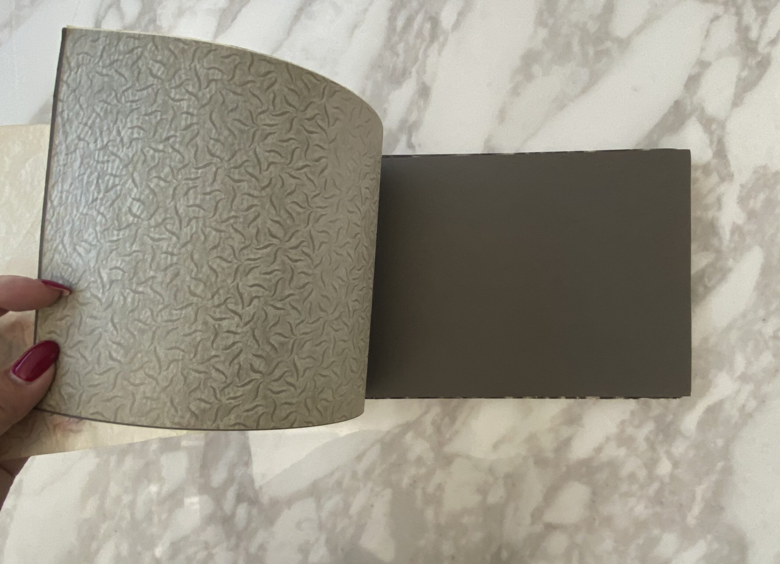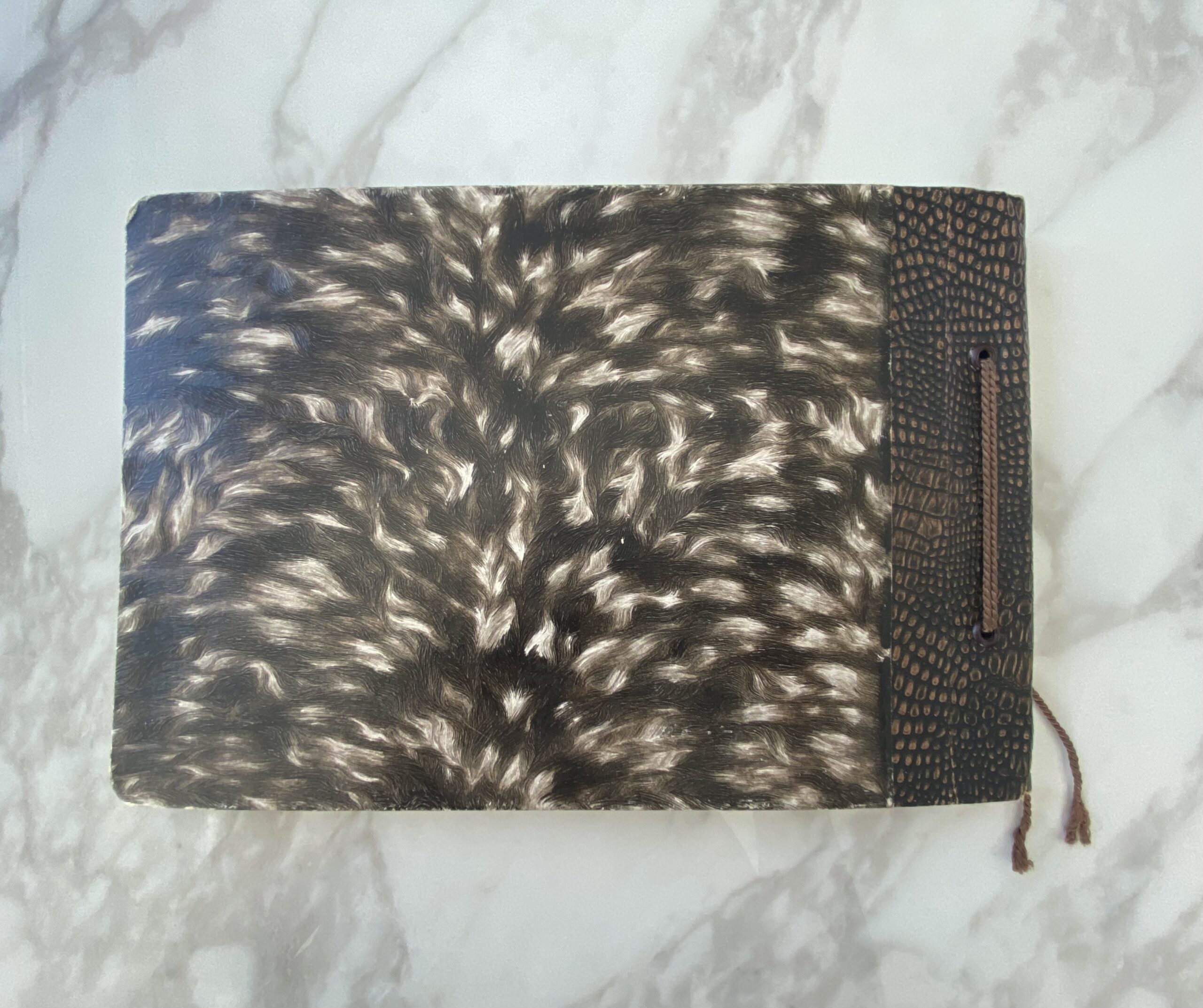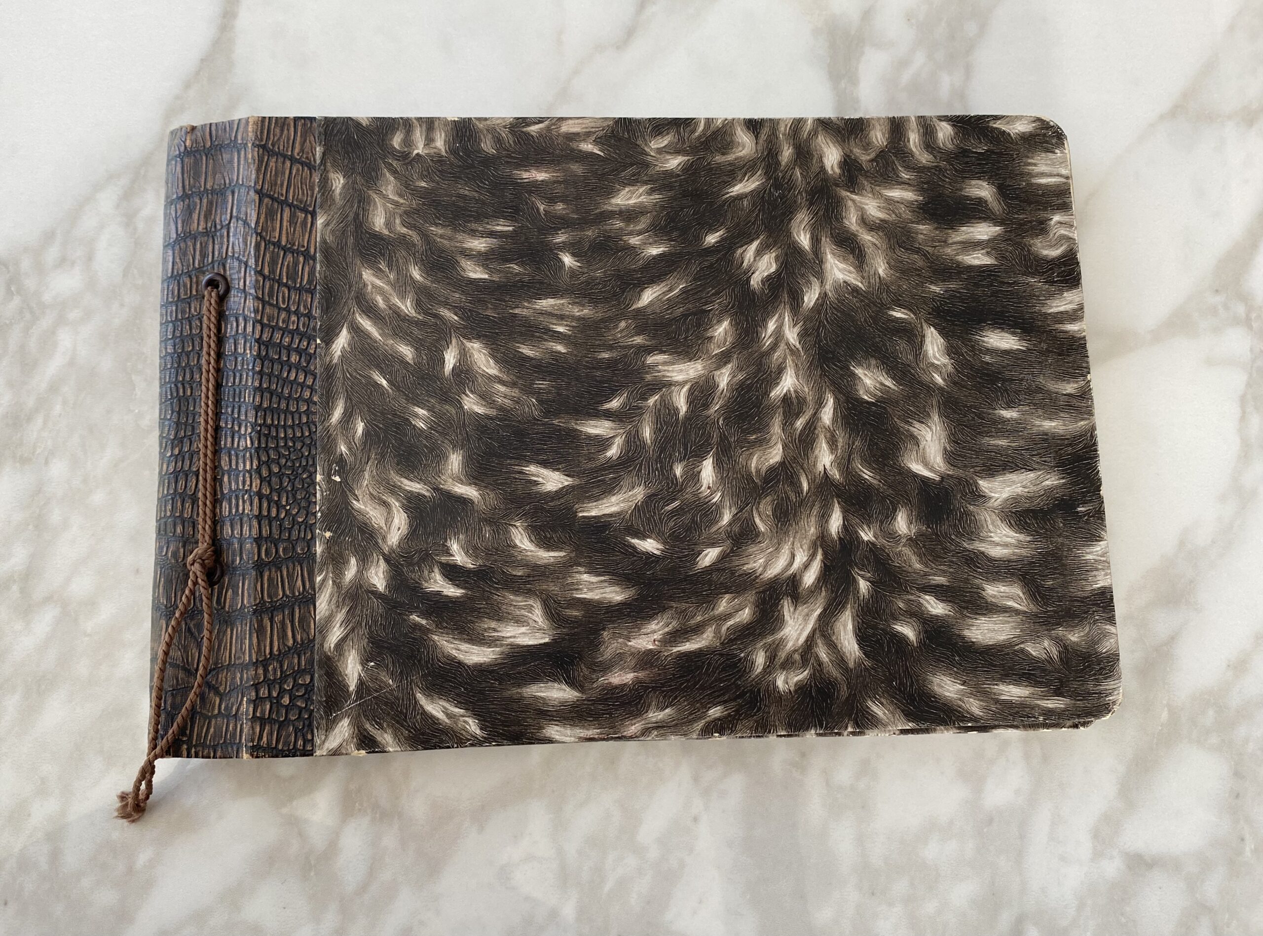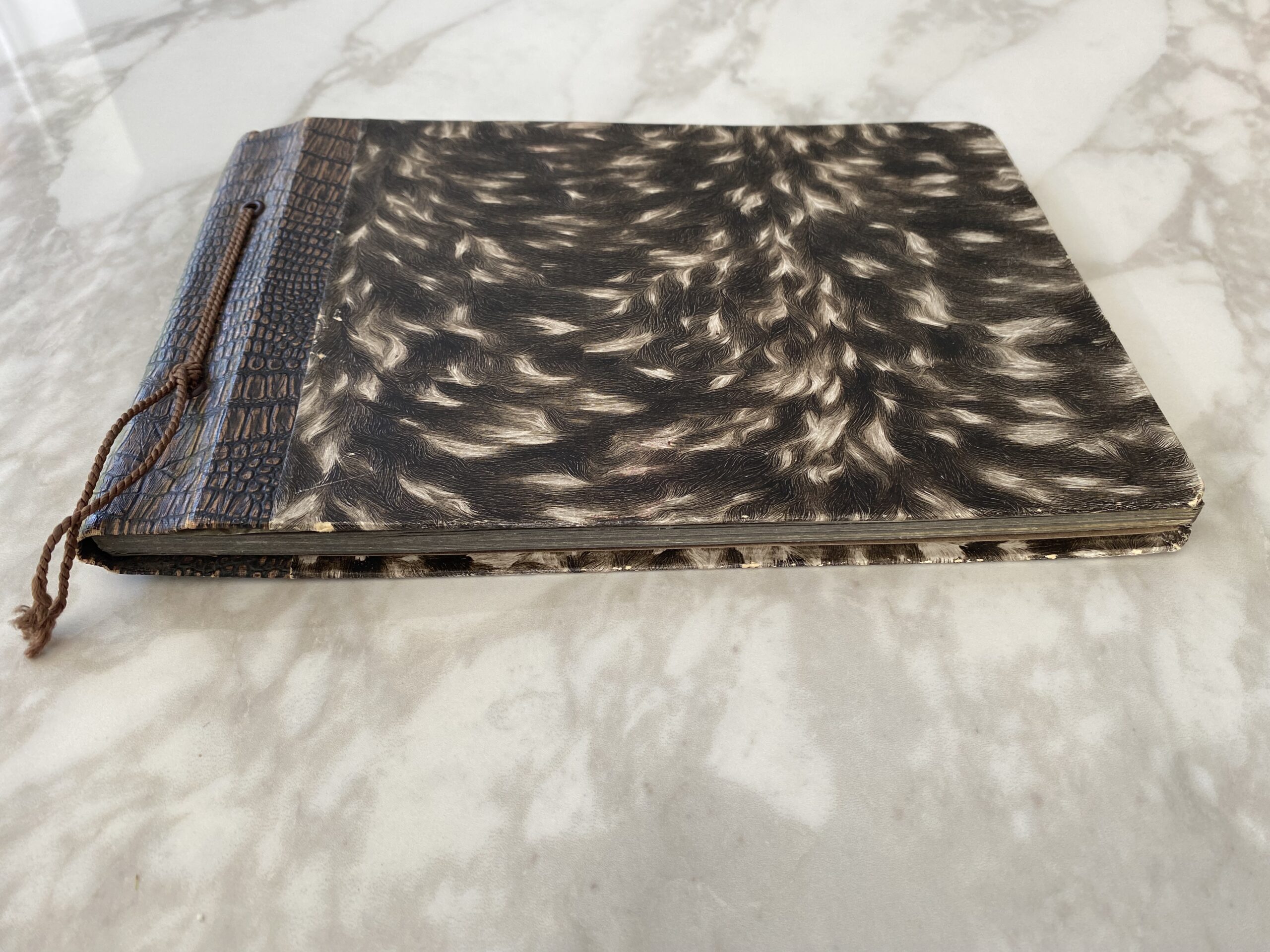 Album photo rétro avec une couverture en relief façon croco et pelage beige et brun. Coins arrondis.