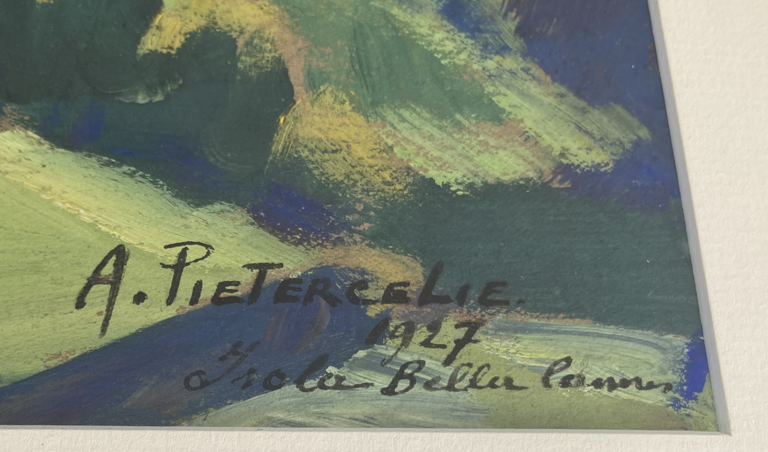 *Alfred Pietercelie est un artiste belge de renom né à Anvers en 1879 et décédé à Jette/Bruxelles en 1995. Peintre et décorateur, il étudia aux Académies d’Anvers, de Bruxelles et d’Anderlecht (1893-1900). Il exposa pour la première fois en 1917 avec le groupe L’Œuvre Nouvelle.