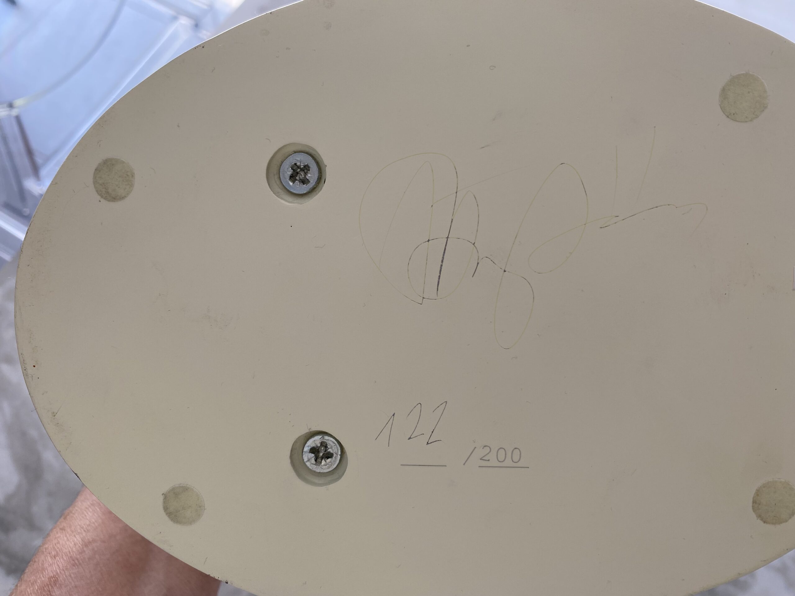 Résine acrylique blanc nacré et brun.