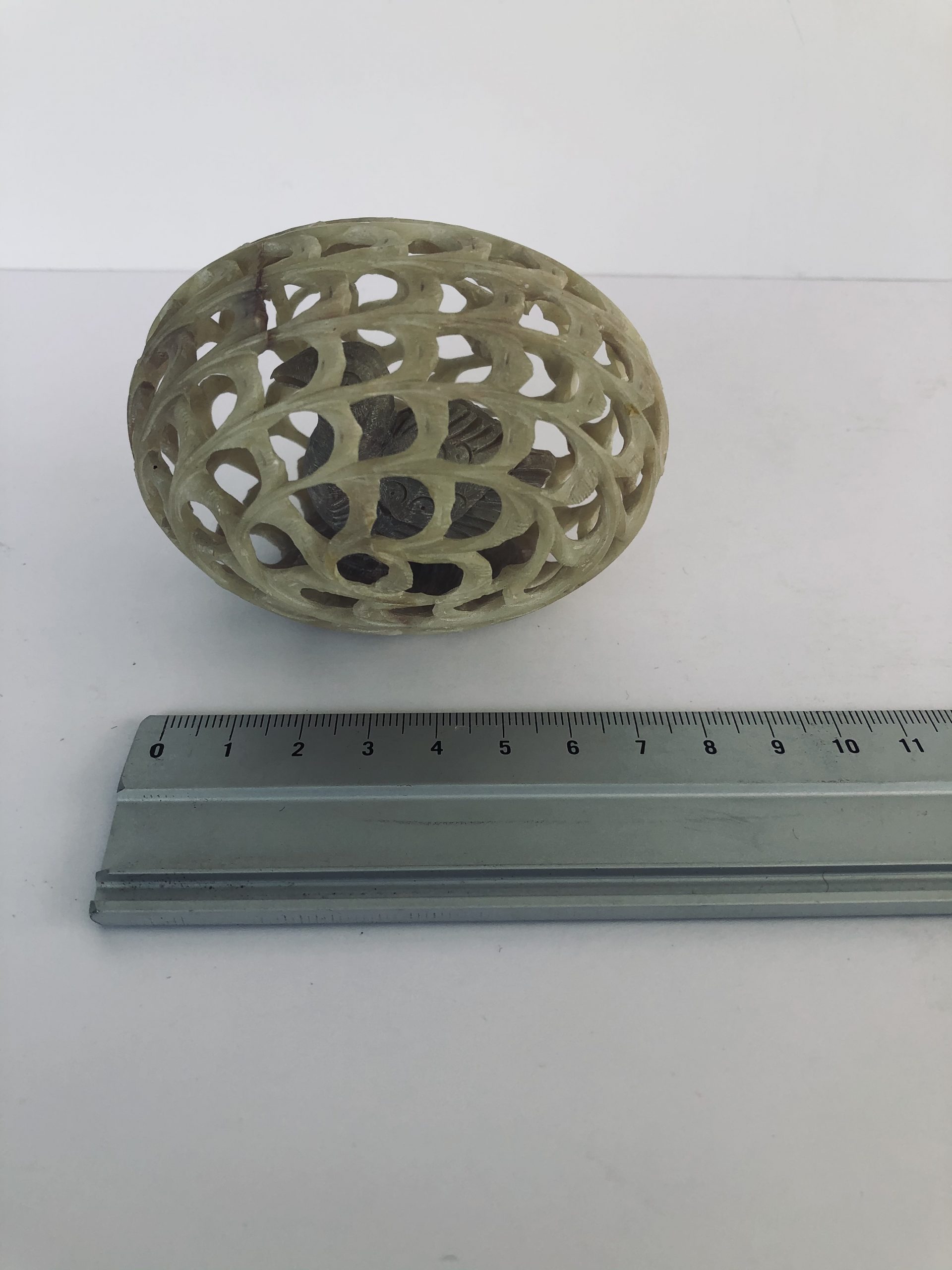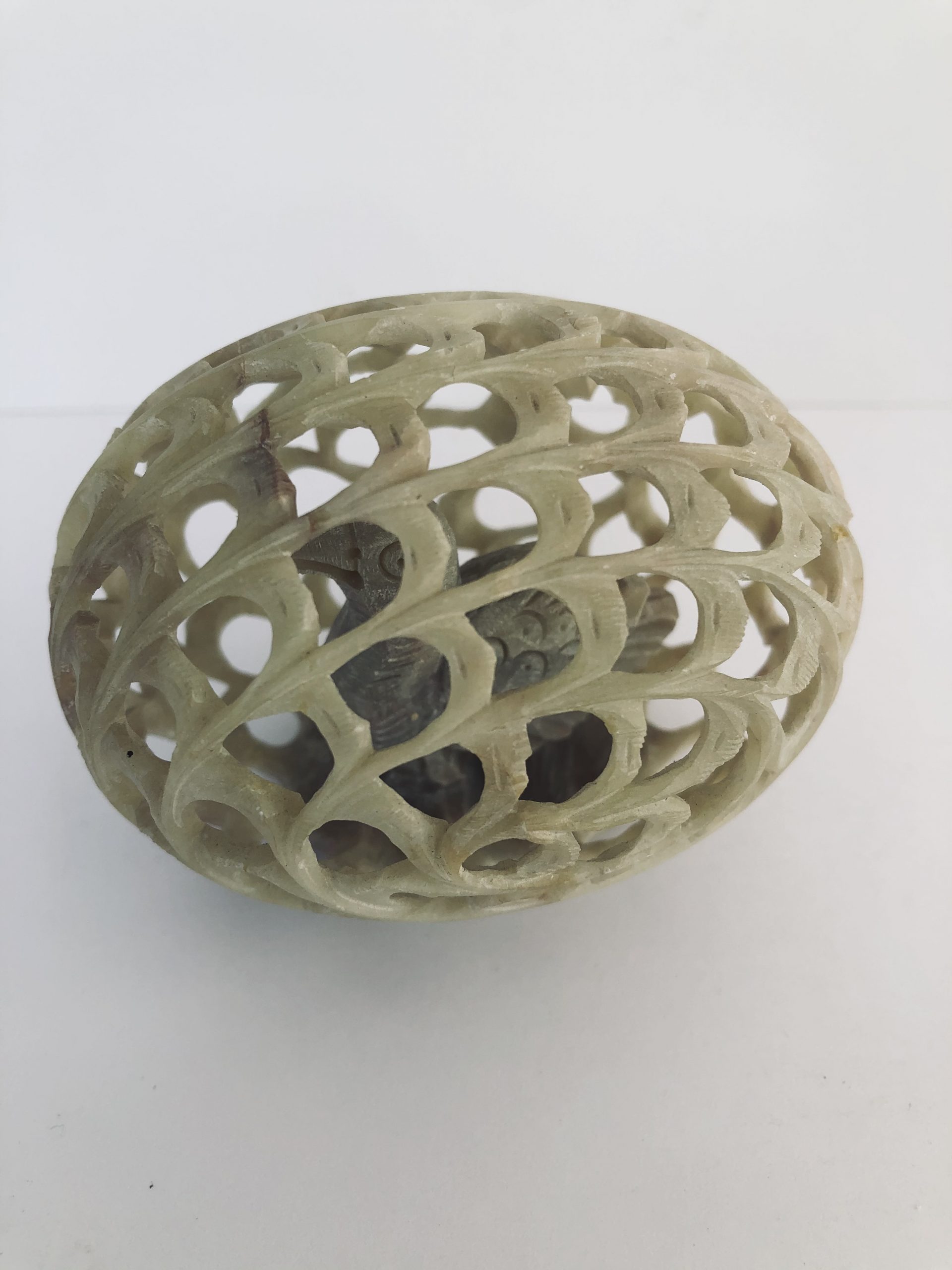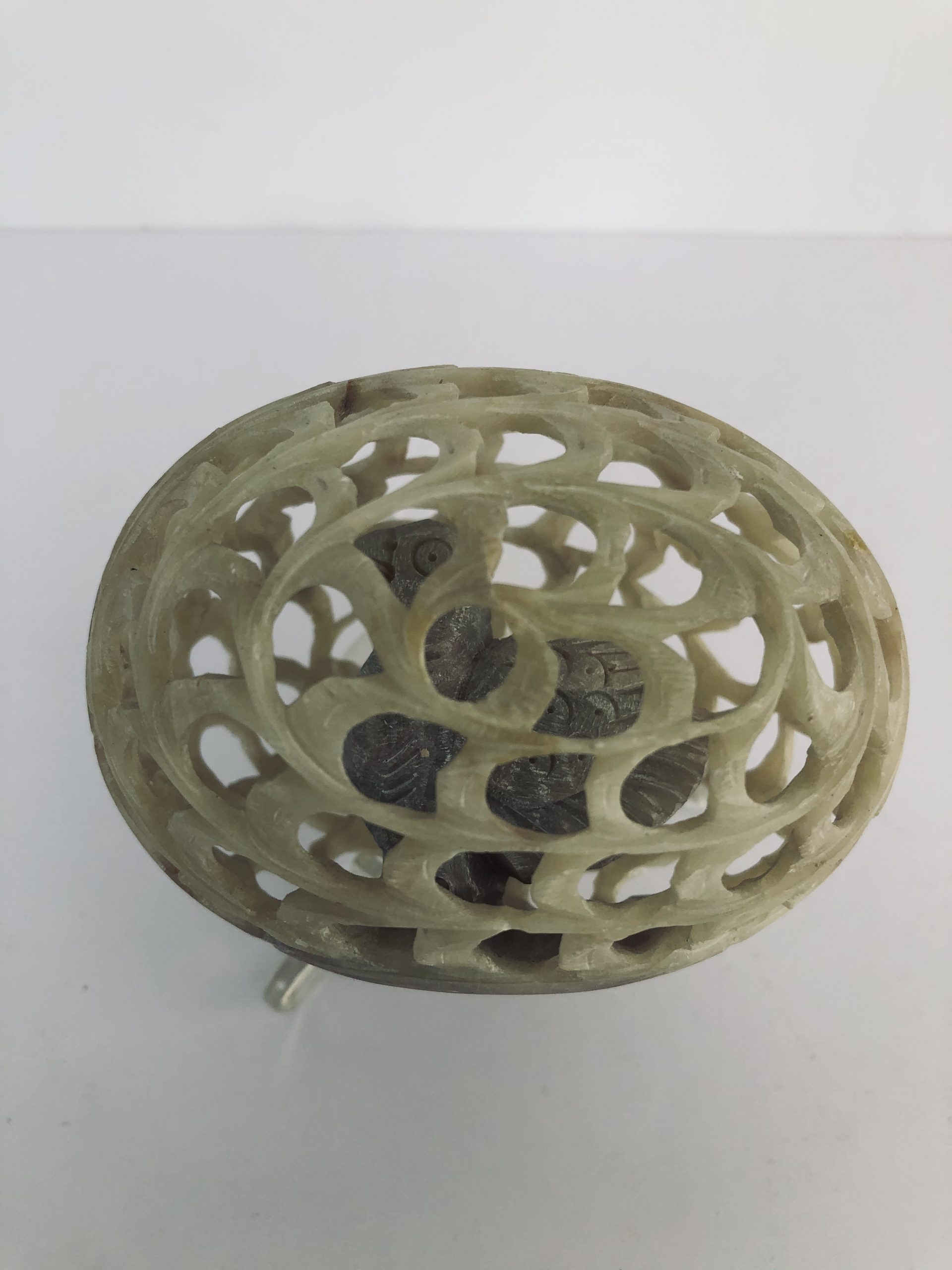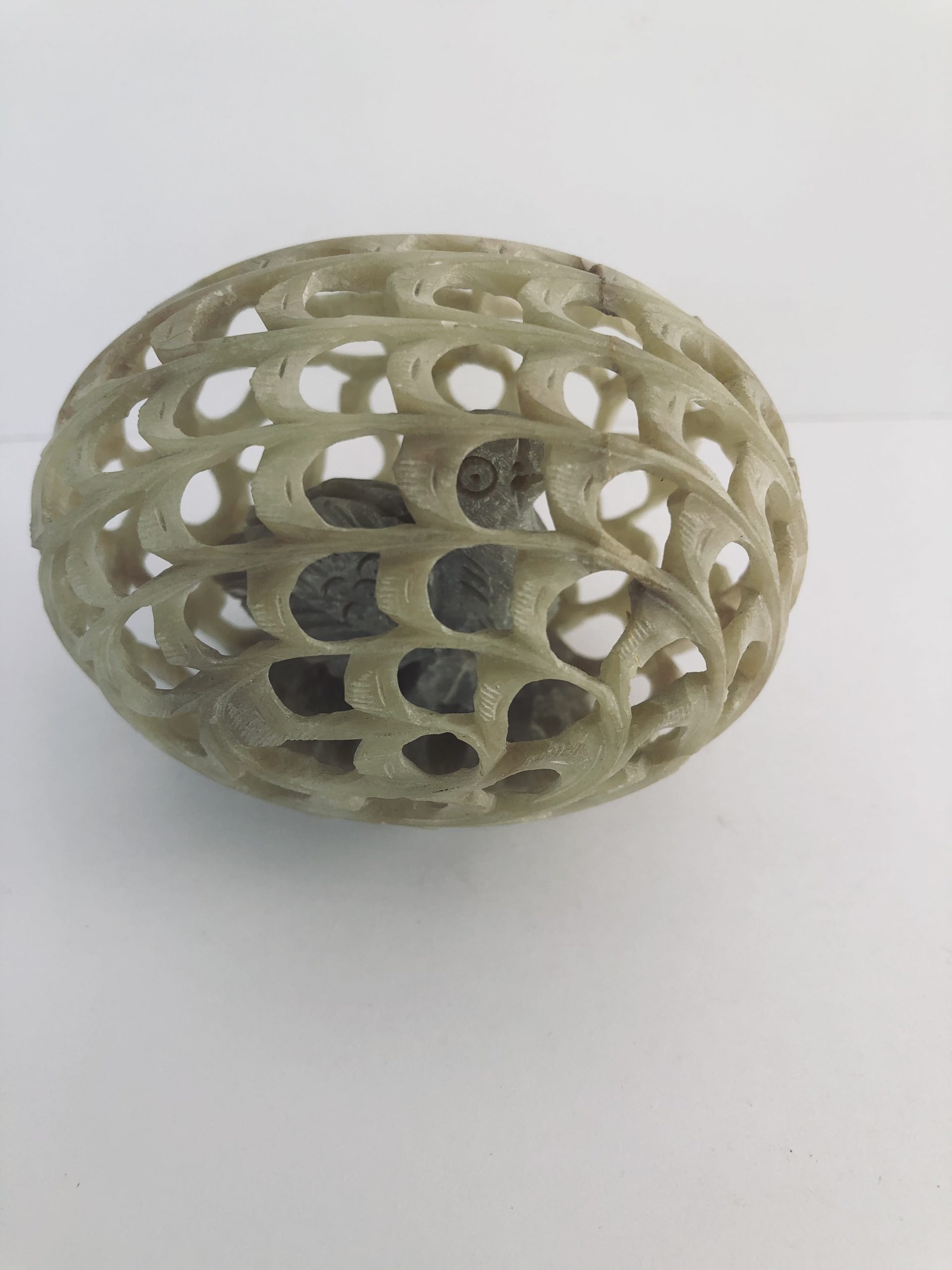 Travail de ciselure d’un oeuf en pierre à savon, ajouré avec un poussin fixé à l’intérieur.