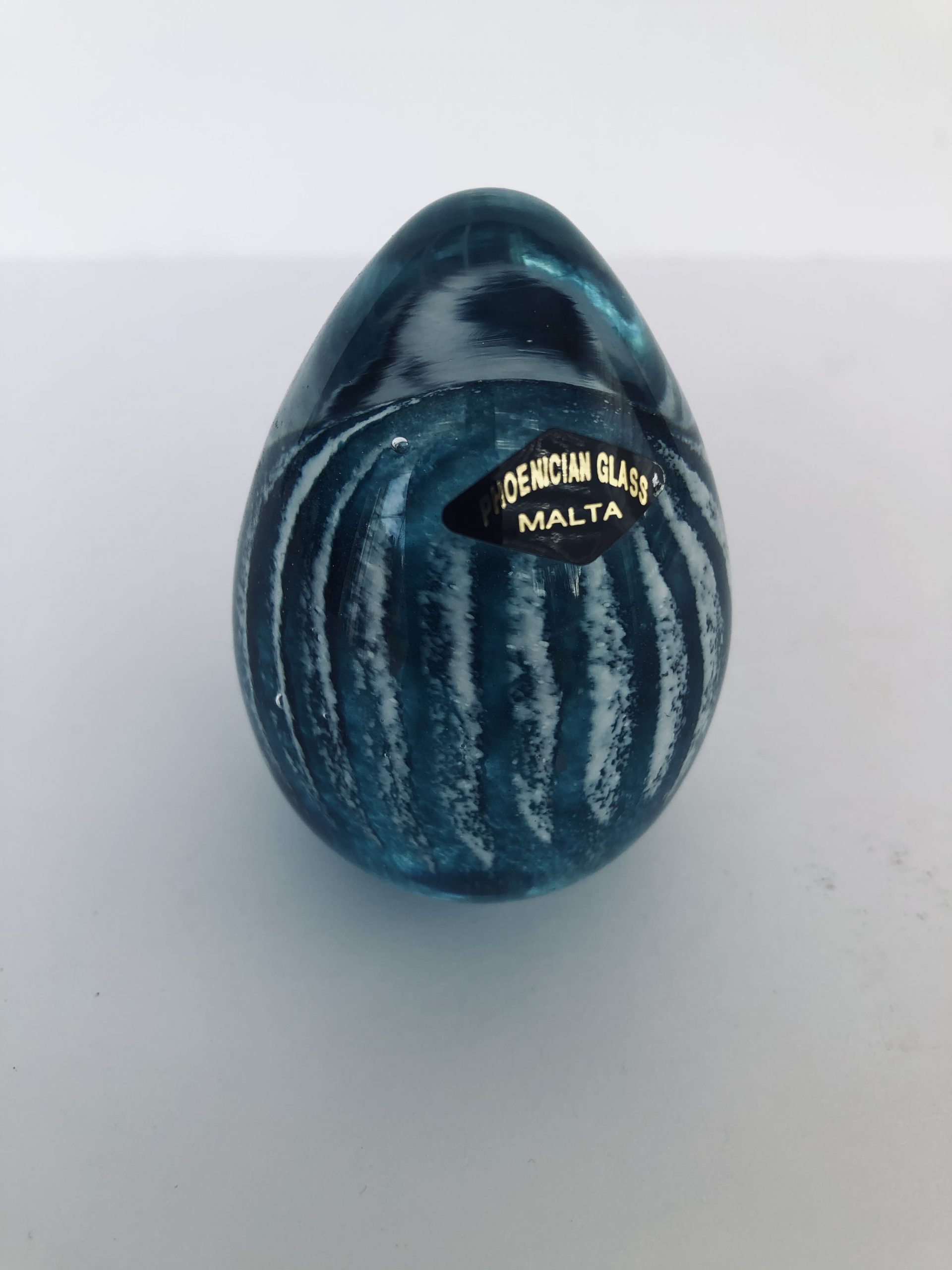 Oeuf en cristal soufflé bleu turquoise avec zébrures blanches. Fond plat. H: 6,5 cm. P: 35 g.