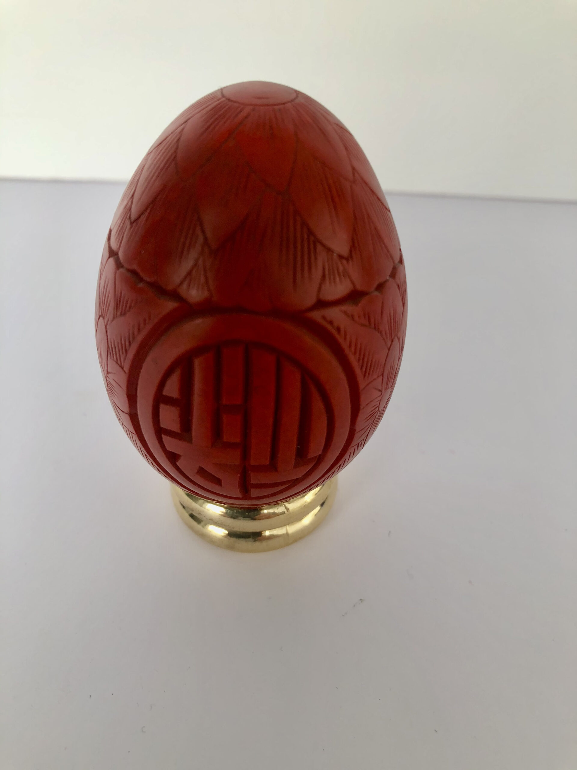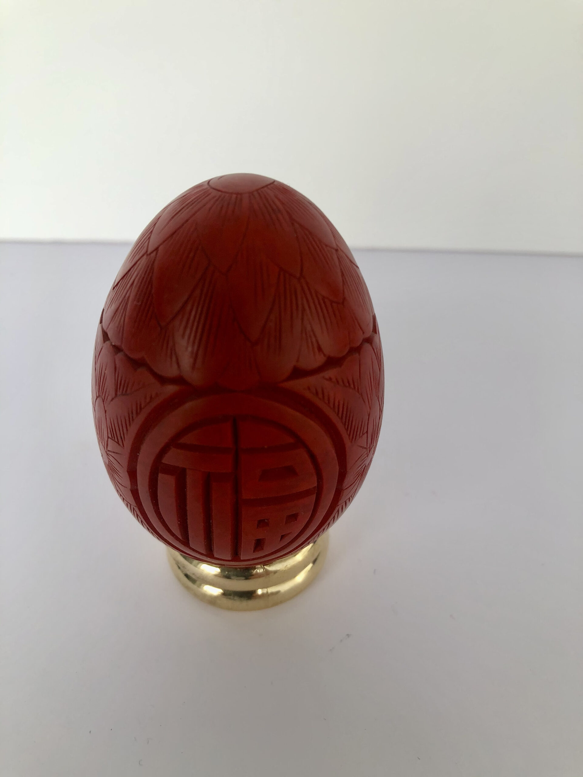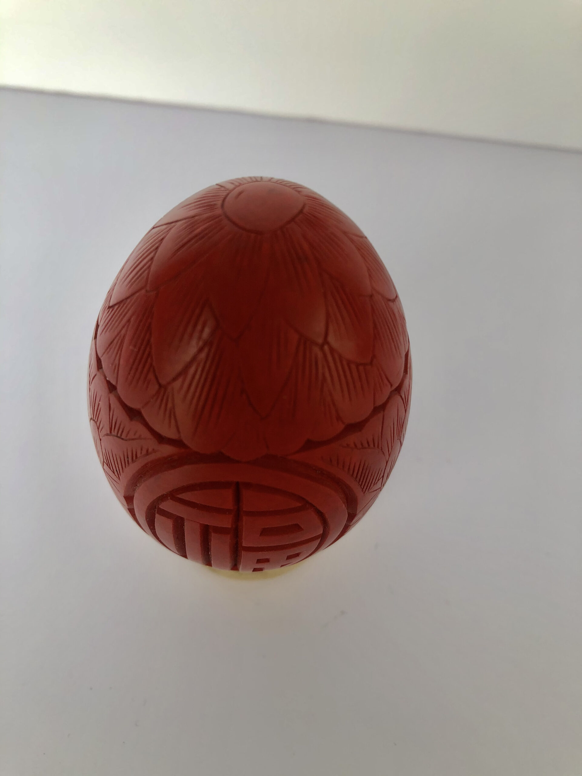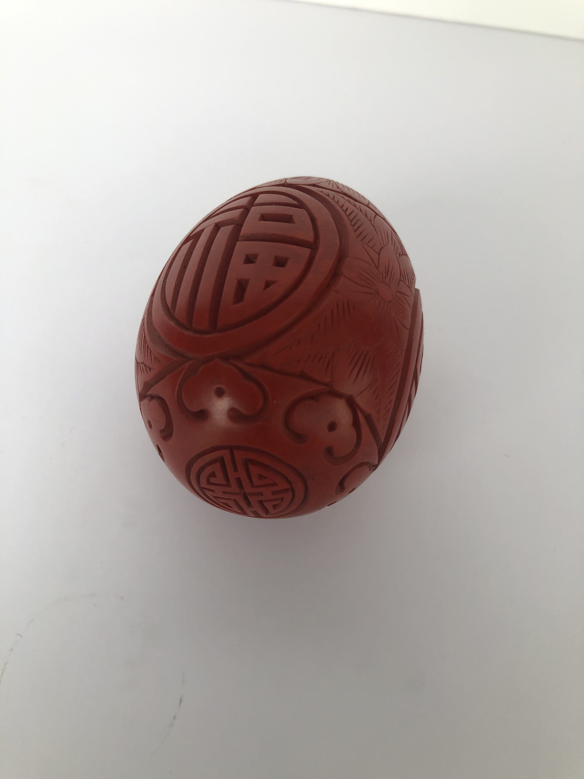 Oeuf sculpté de motifs chinois, couleur cinabre. P: 48g, H: 7 cm.