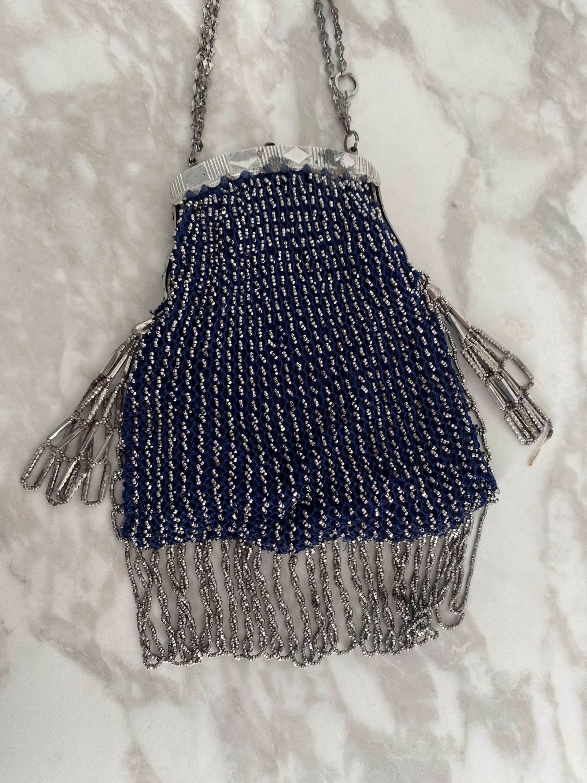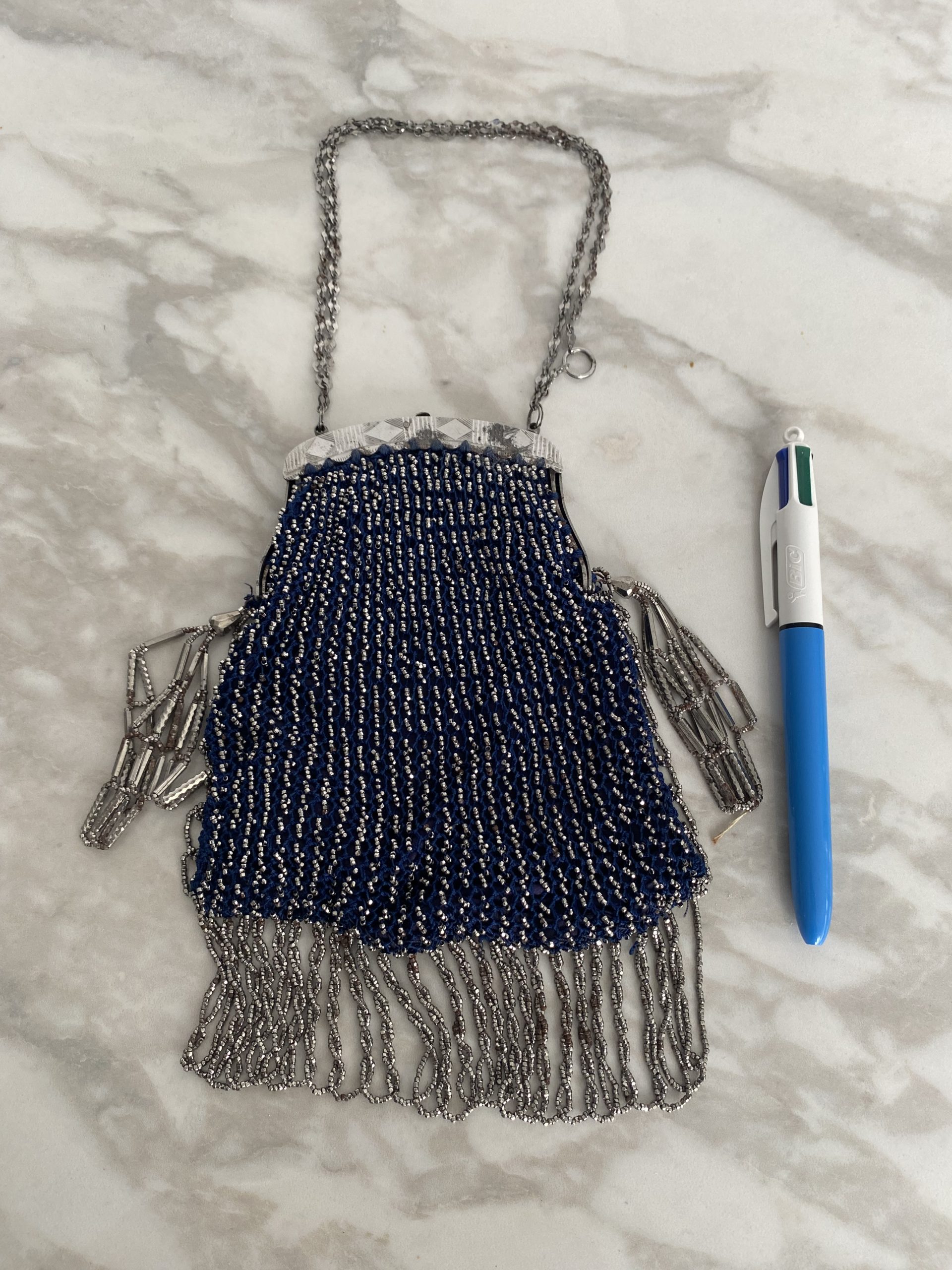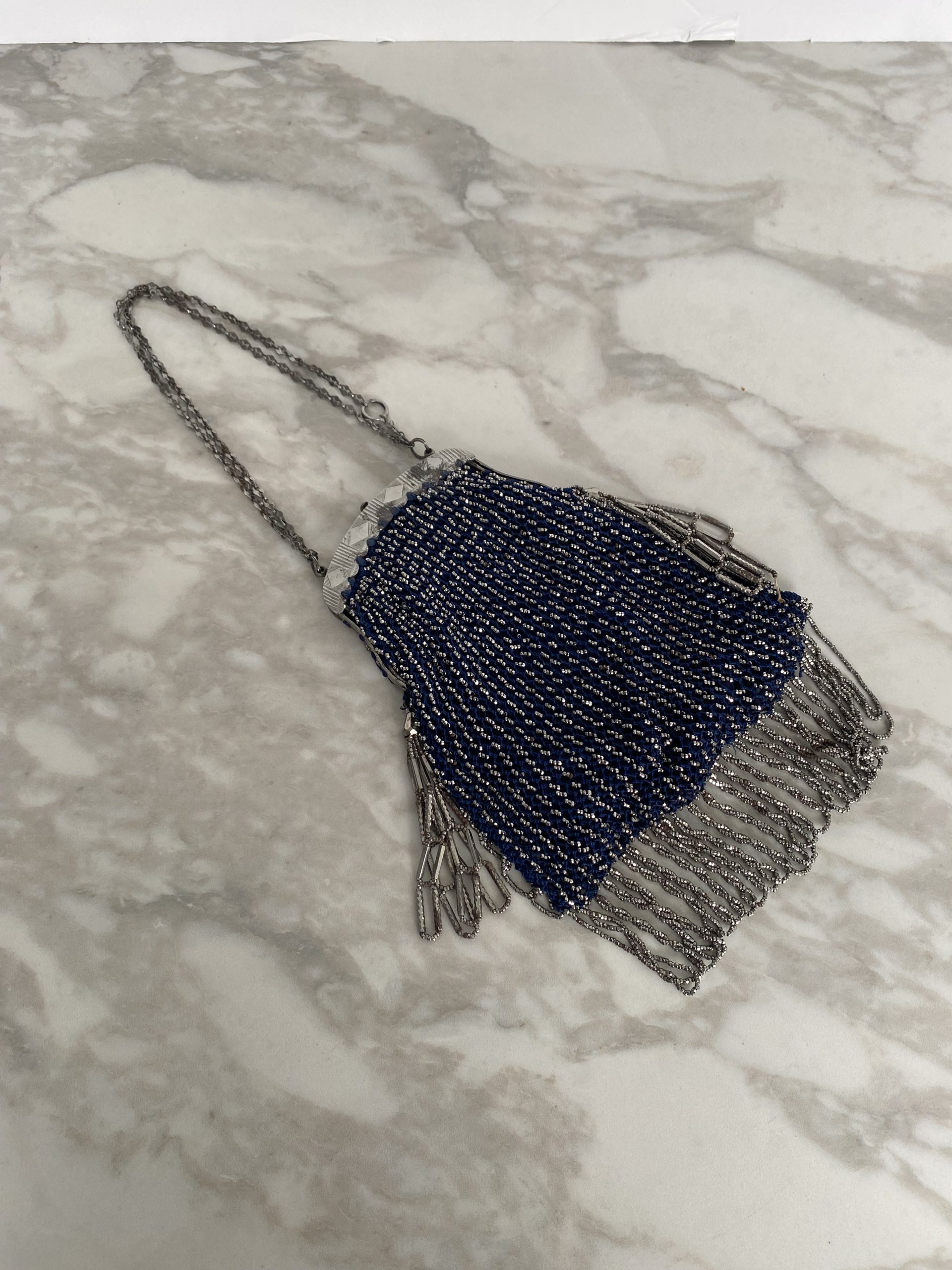 Elégant sac de dame en fil bleu et perles métallisées d’époque Art Déco. Fermeture métallique fonctionnelle, petites chaînes pour le porter au poignet, franges de perles sur les côtés et le dessous du sac. Objet de collection ou juste magnifique pour des amoureux de l’époque.