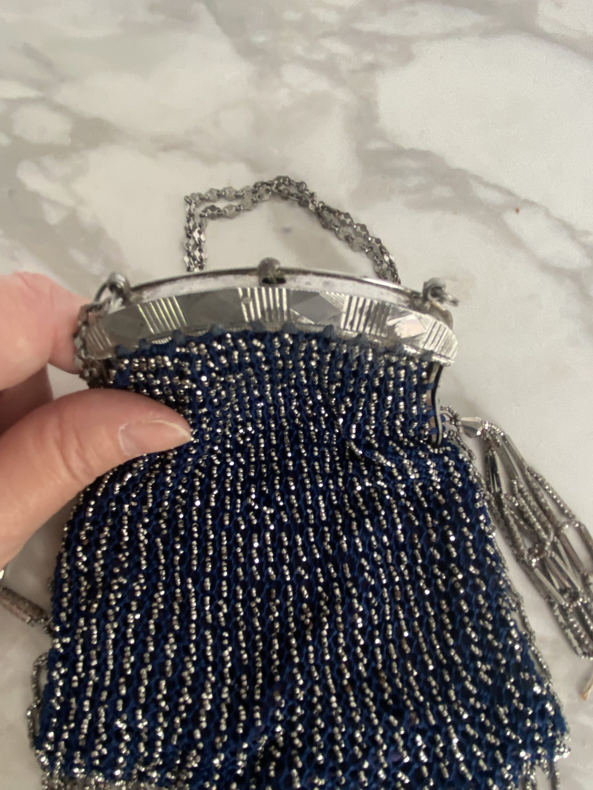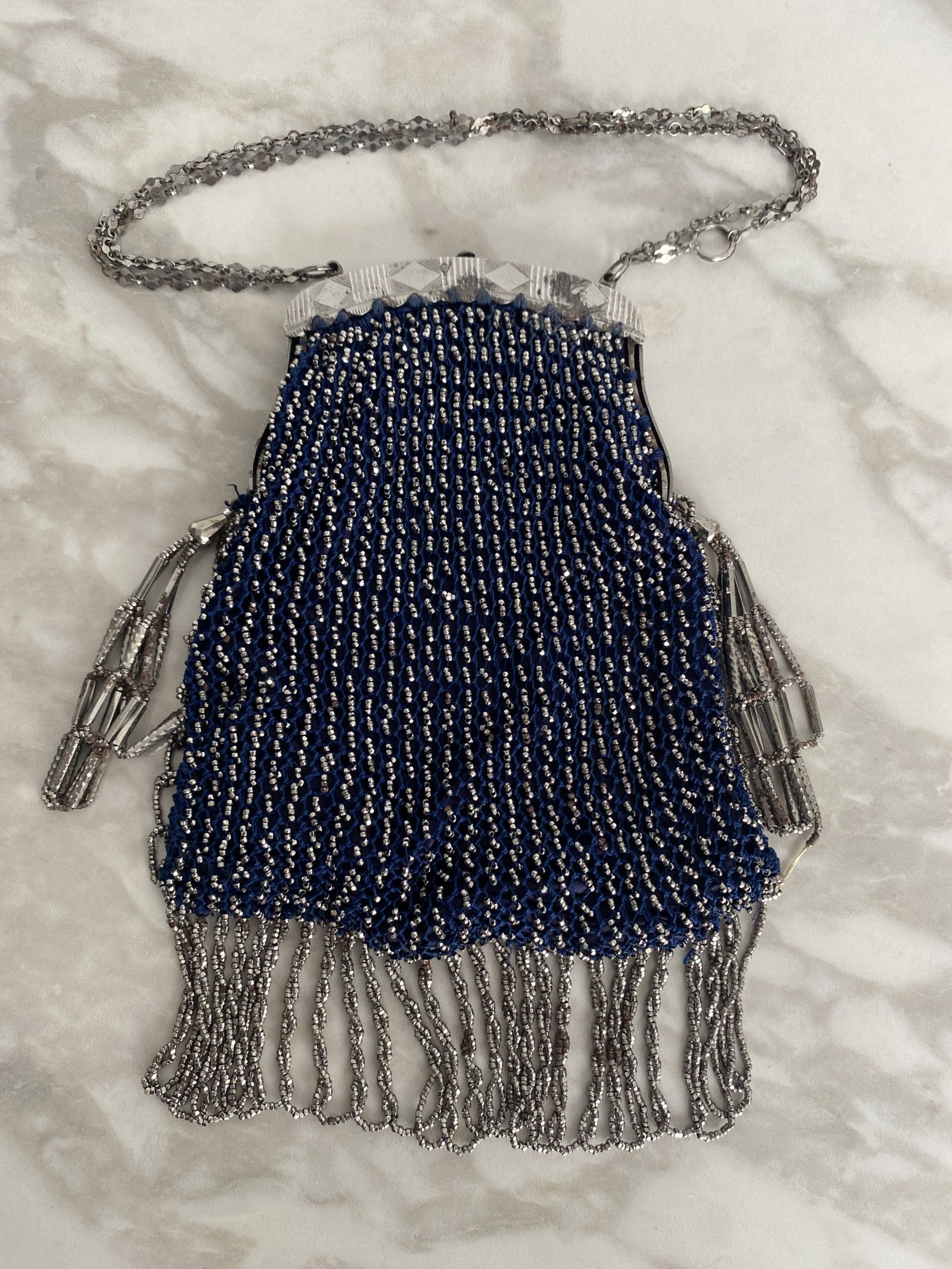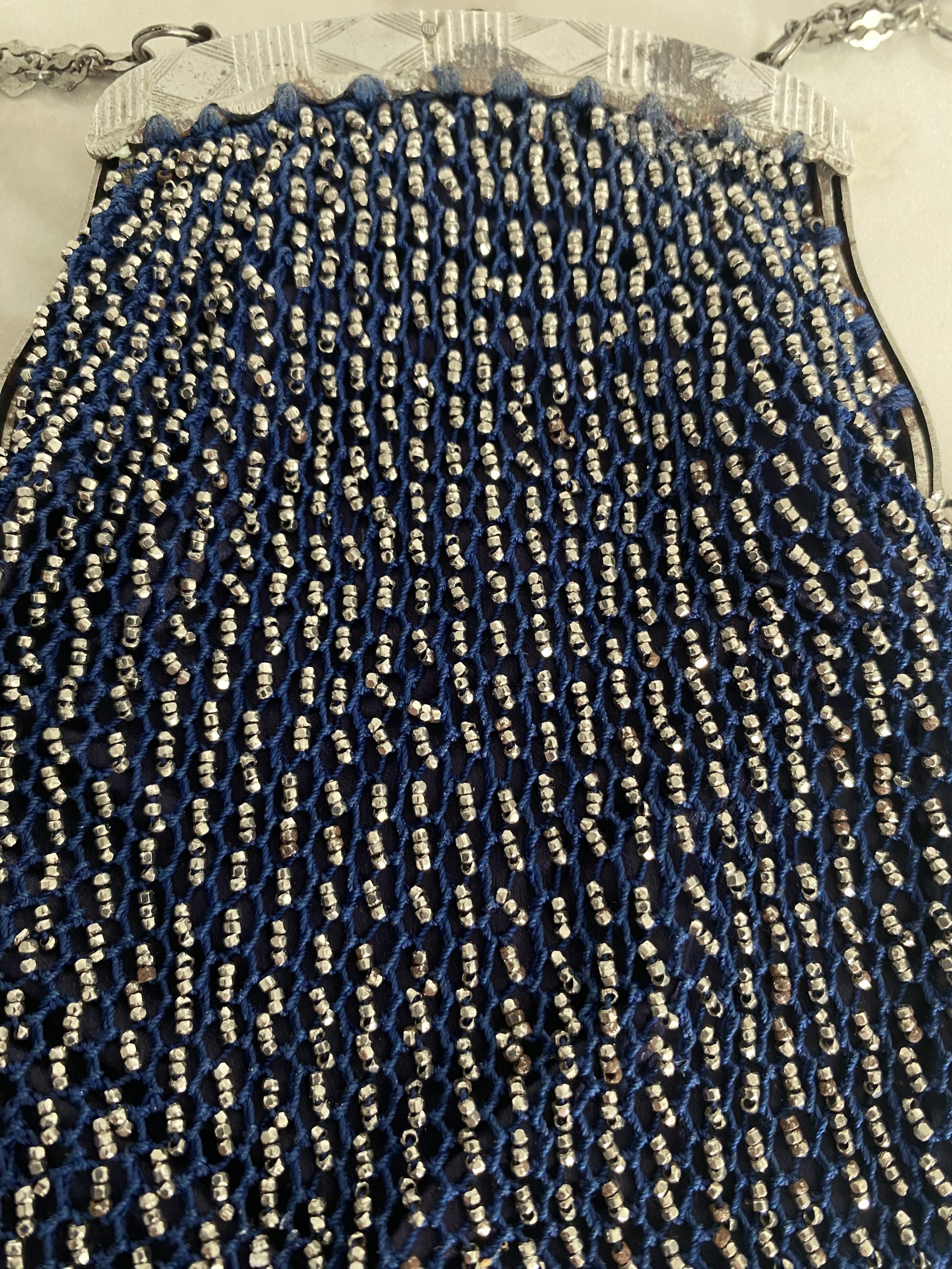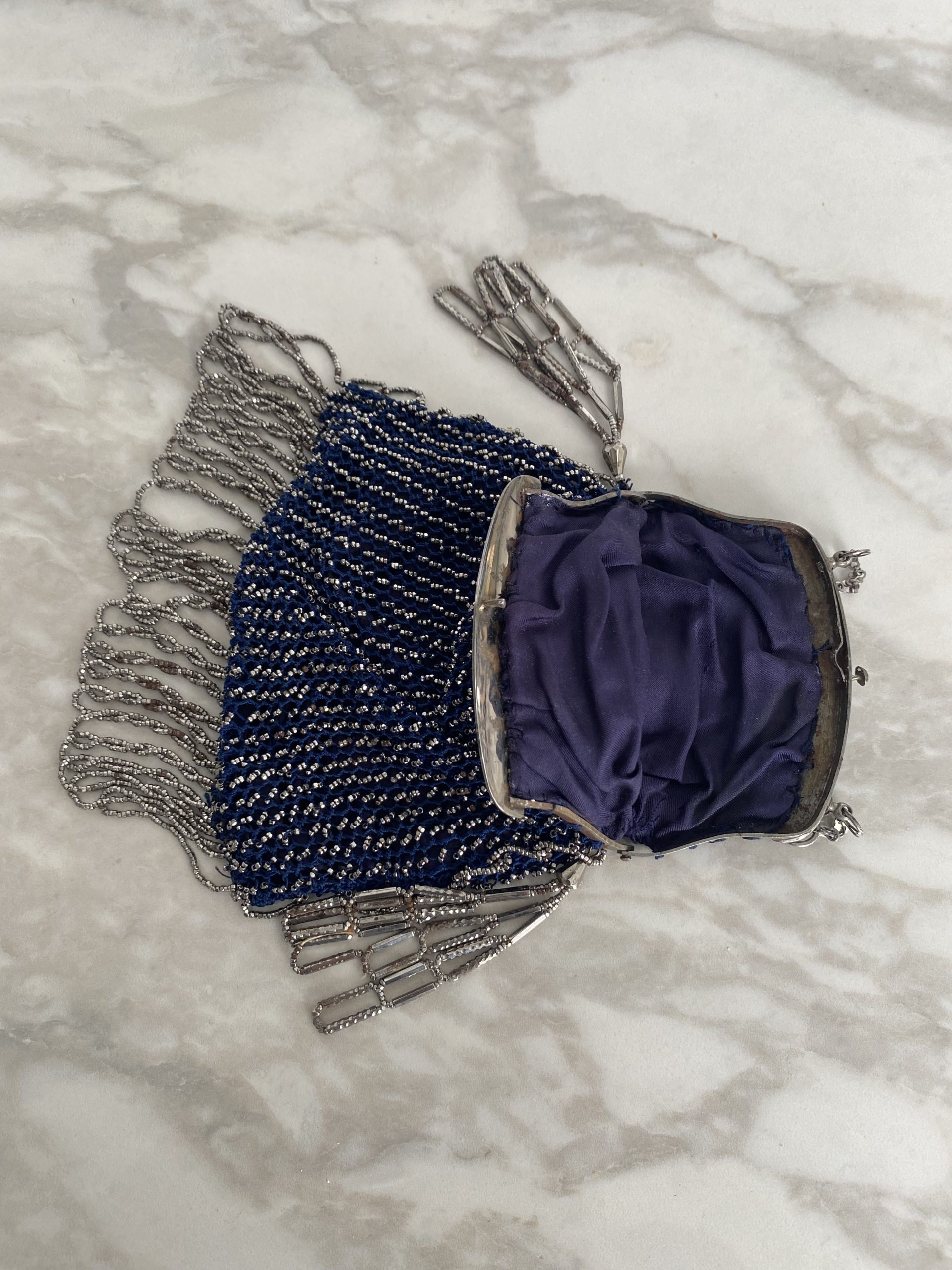 Elégant sac de dame en fil bleu et perles métallisées d’époque Art Déco. Fermeture métallique fonctionnelle, petites chaînes pour le porter au poignet, franges de perles sur les côtés et le dessous du sac. Objet de collection ou juste magnifique pour des amoureux de l’époque.