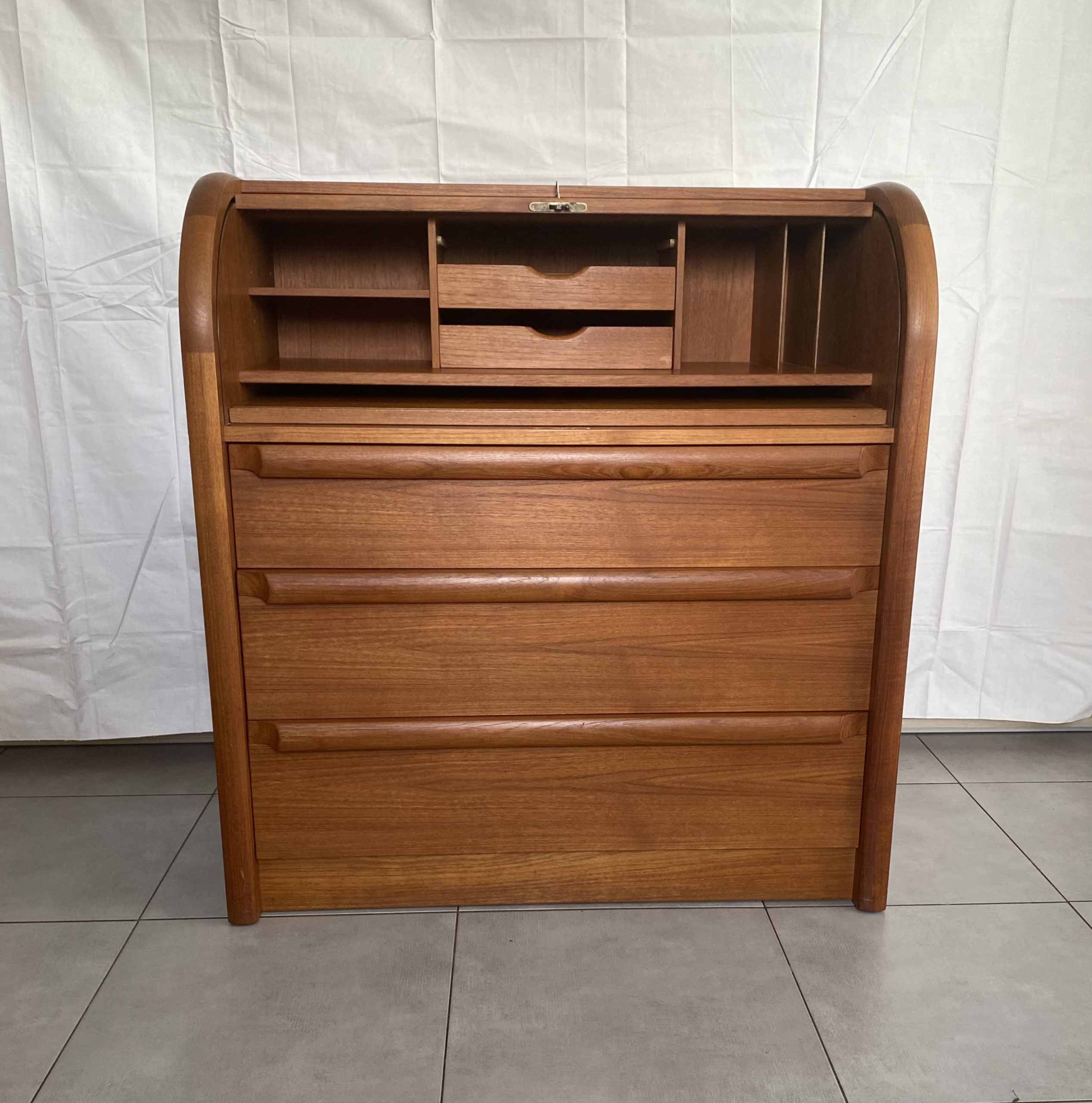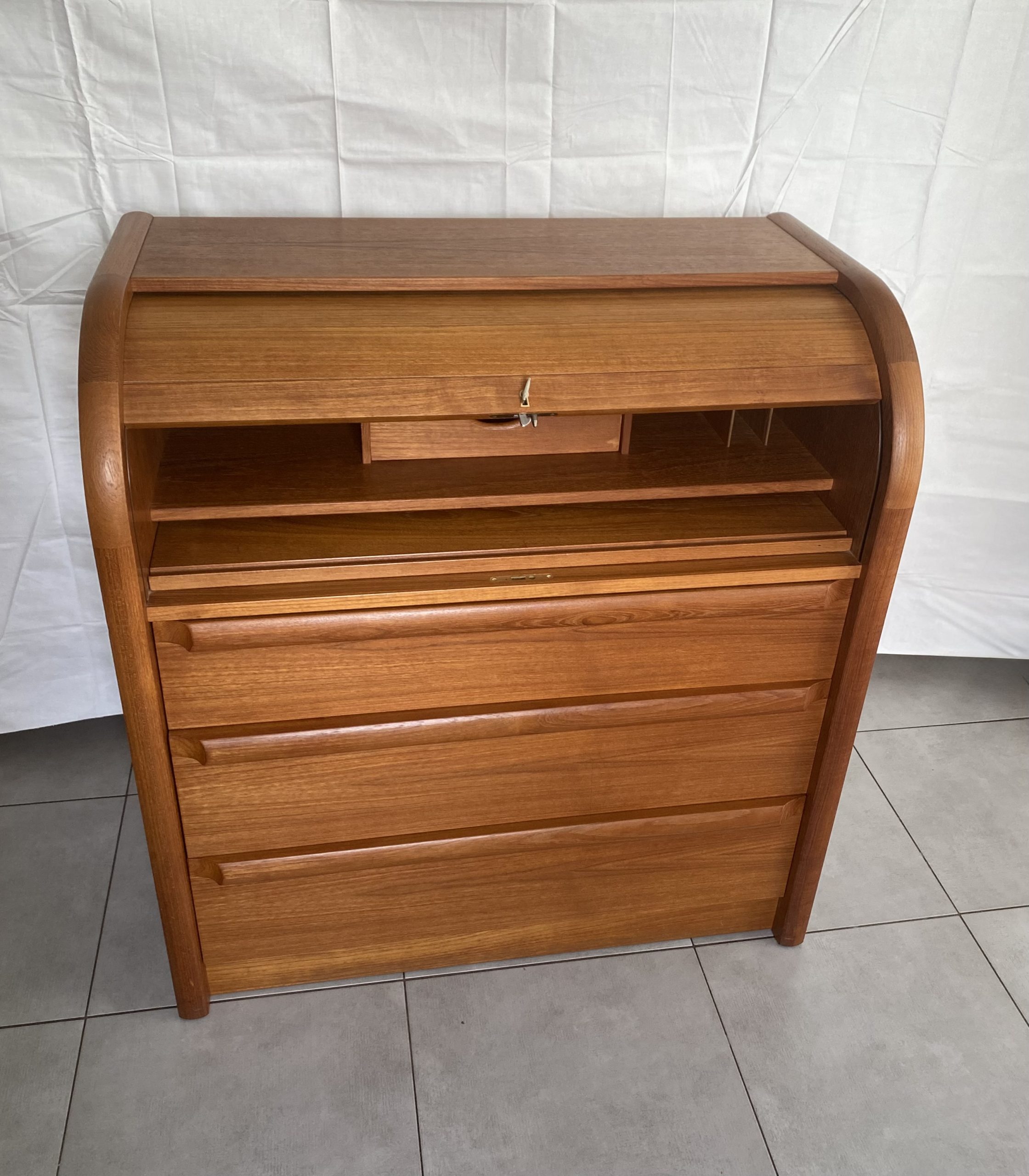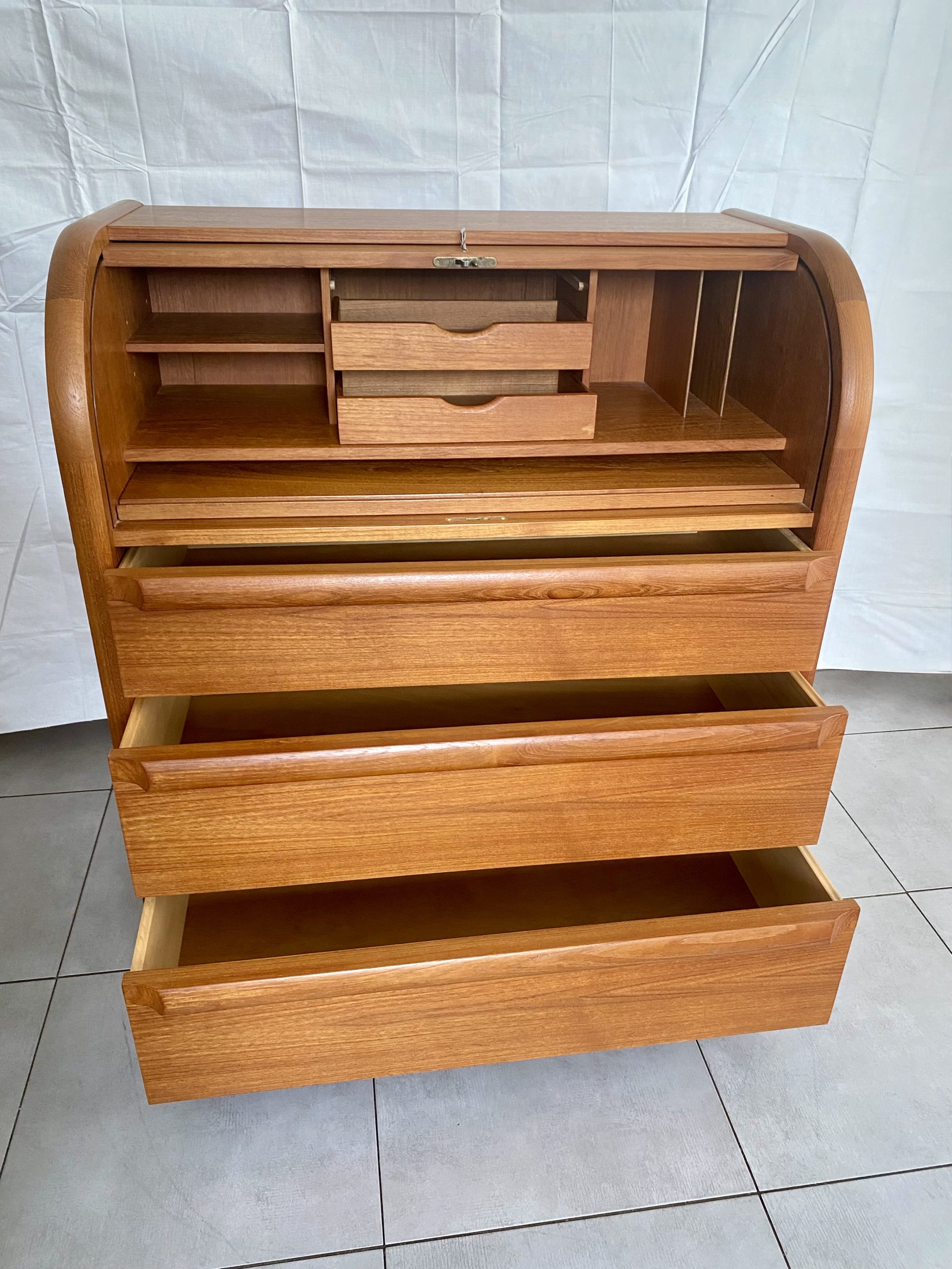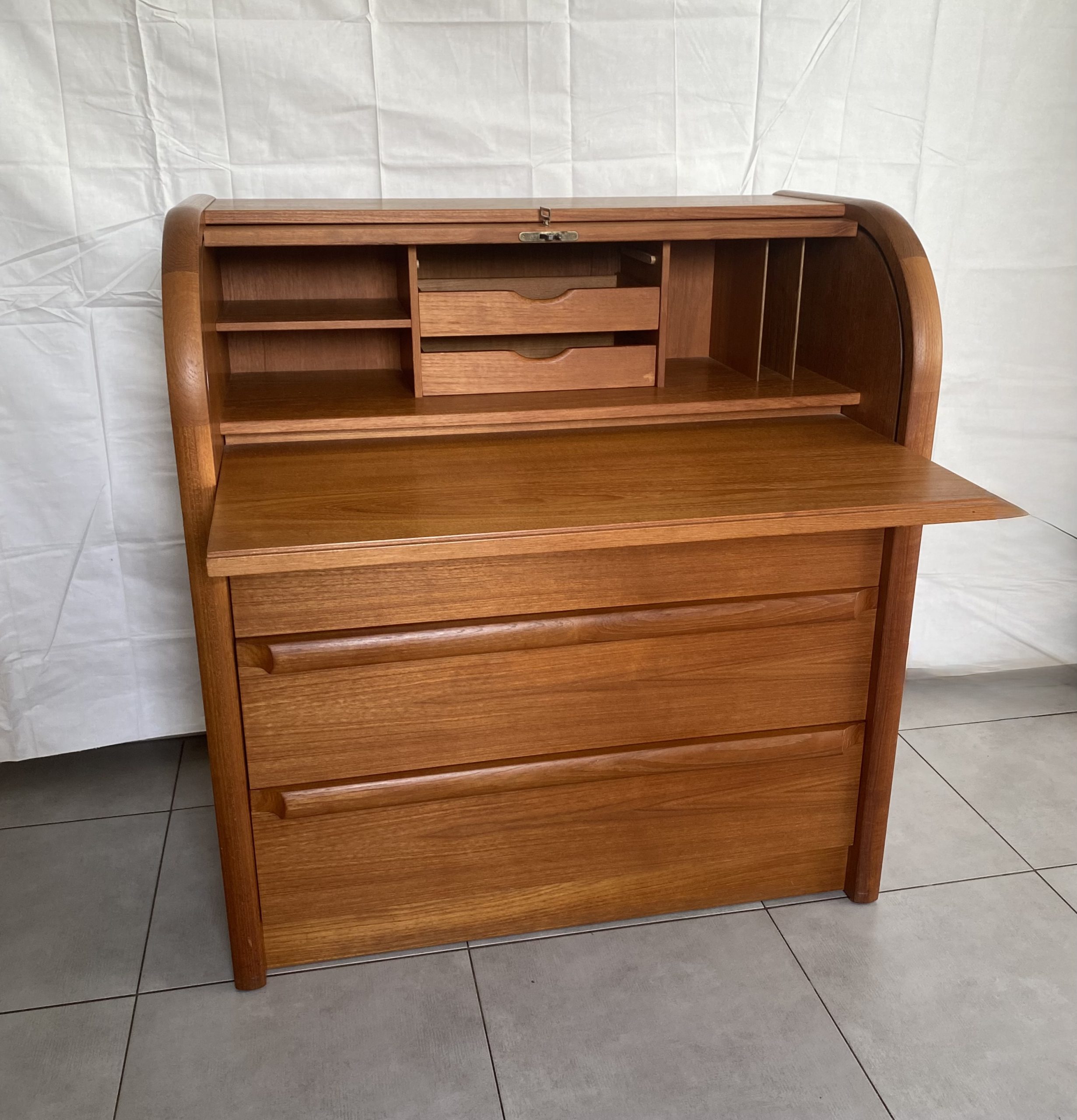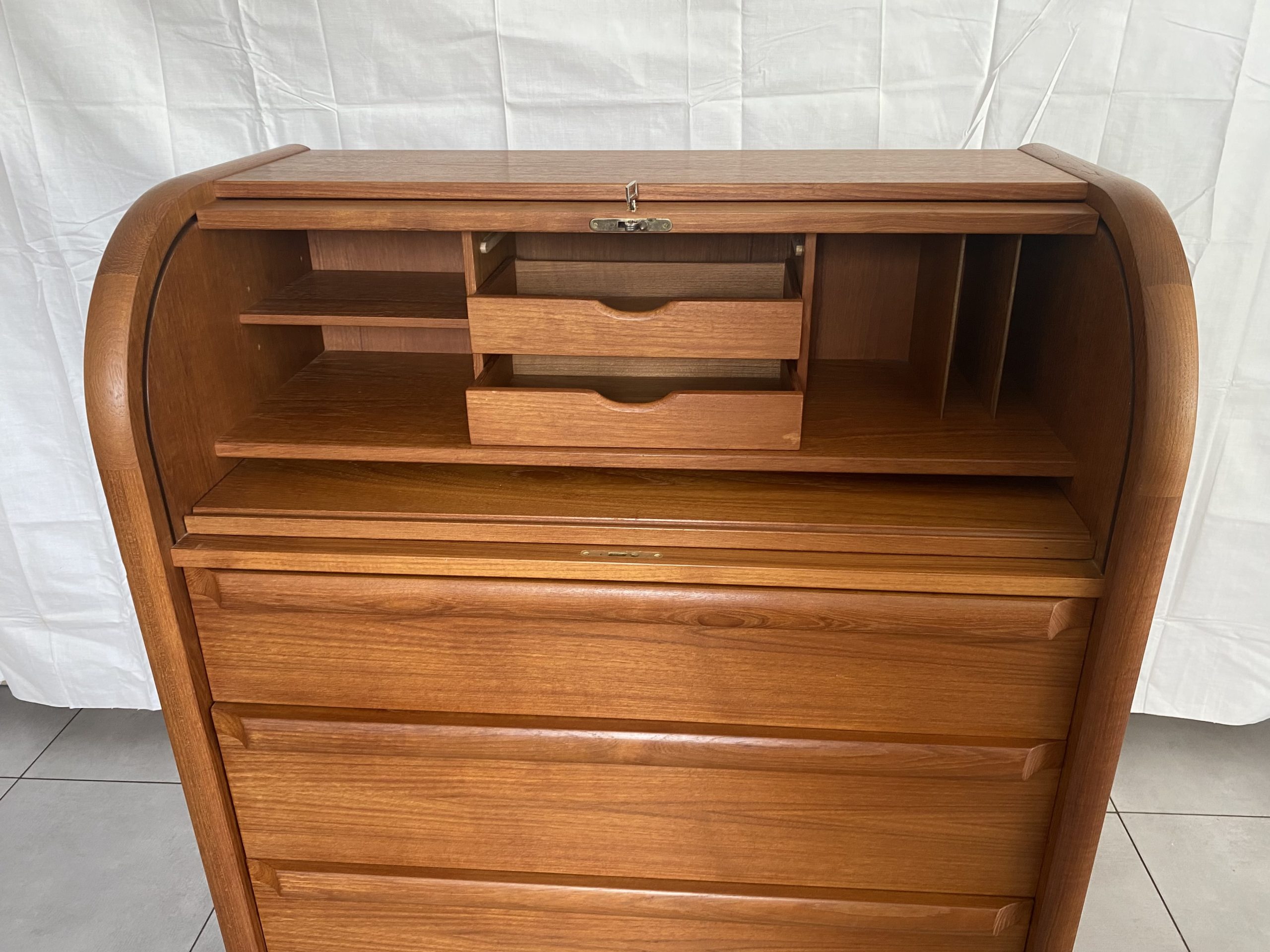Secrétaire en bois de teck très complet. Dans le haut, il présente une partie secrétaire fermée à clef par un rideau coulissant, bombé, derrière lequel figure deux tiroirs centraux, des espaces de rangement avec un planche horizontale réglable en hauteur à gauche, et à droite des espaces pour des papiers. Un tablette d’écritoire peut se déployer en glissant avec une profondeur de 37 cm, ce qui permet d’y placer un ordinateur. En dessous, il présente 3 tiroirs de profondeur croissante avec des poignées en bois stylisées. Ceci rend ce meuble très polyvalent, pouvant être utilisé dans un salon, un bureau, une chambre, une entrée. Le meuble est estampillé au revers du sigle VM, pour la fabrique Vinde Møbelfabrik et numéroté 86. Il est dessiné par le designer danois Arne Wahl Iversen (1927 -2016) dans les années 60.