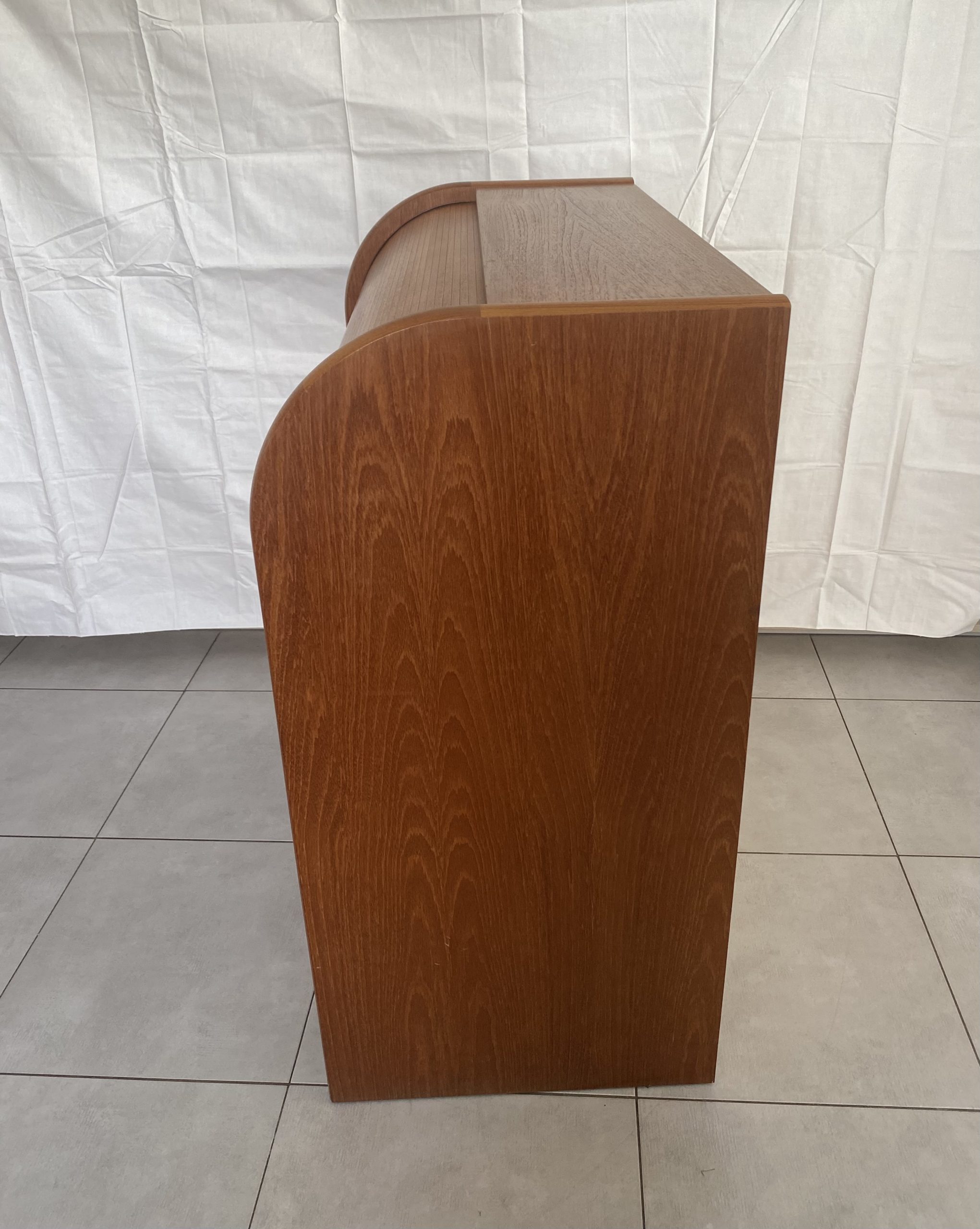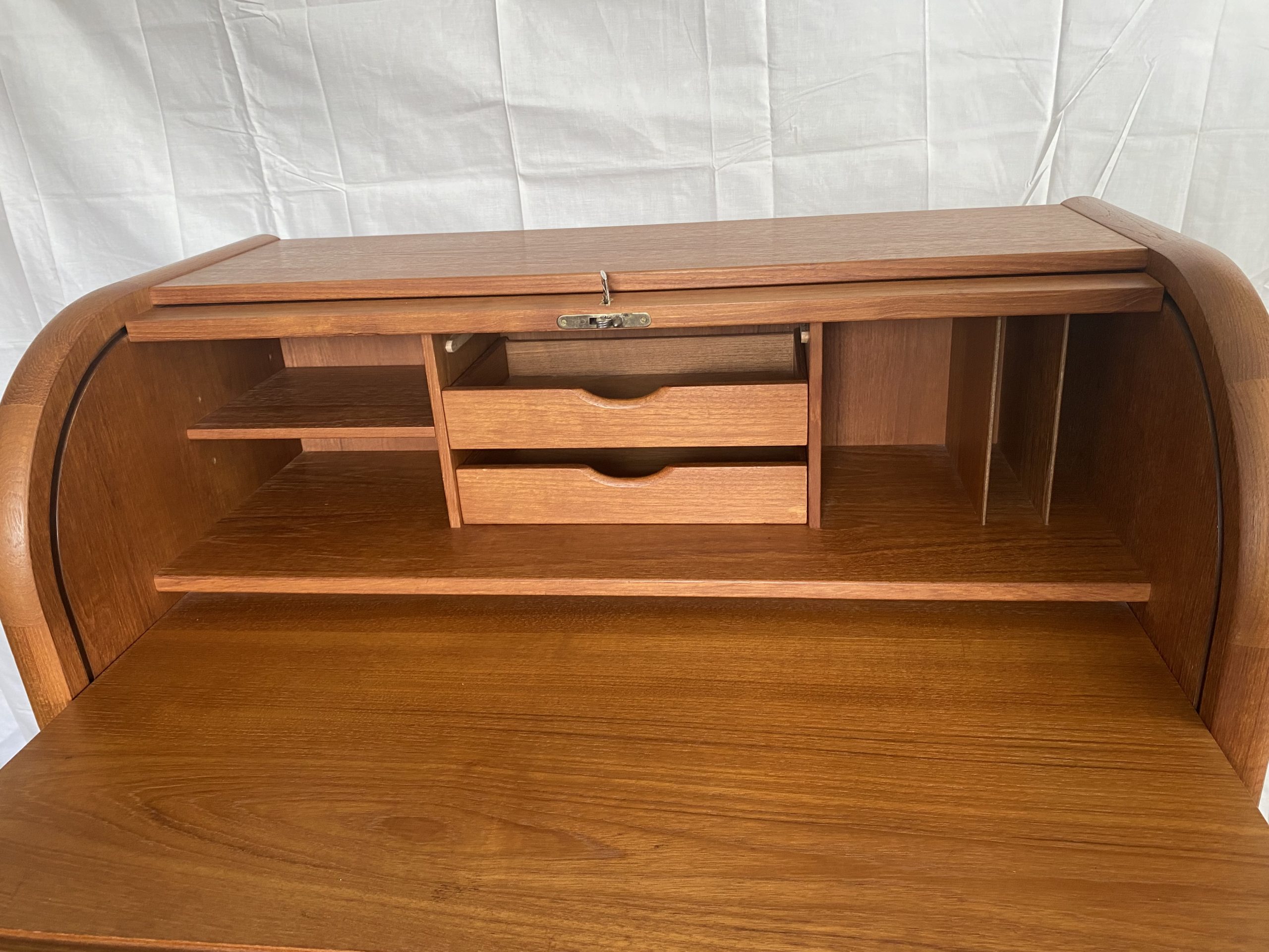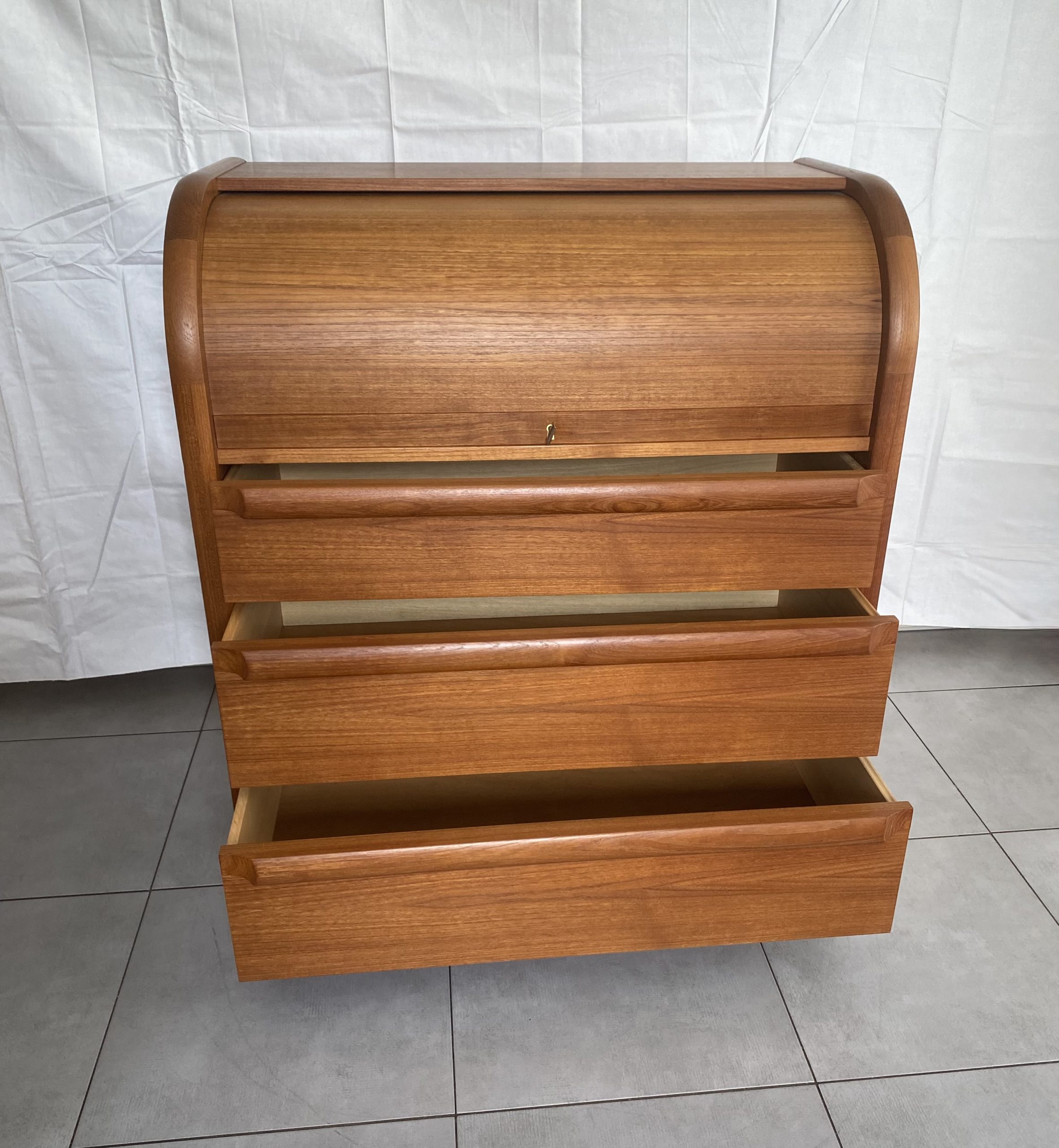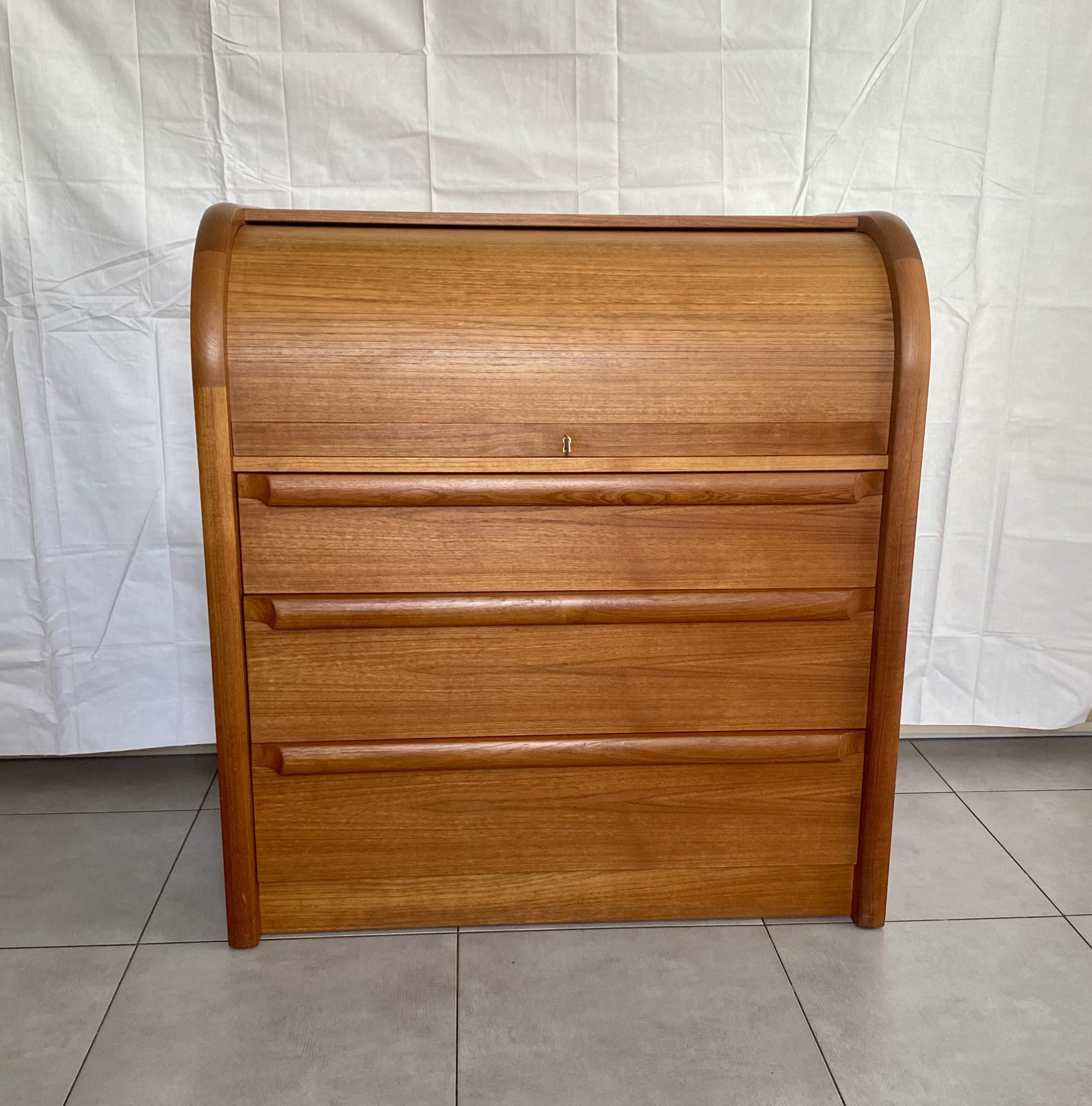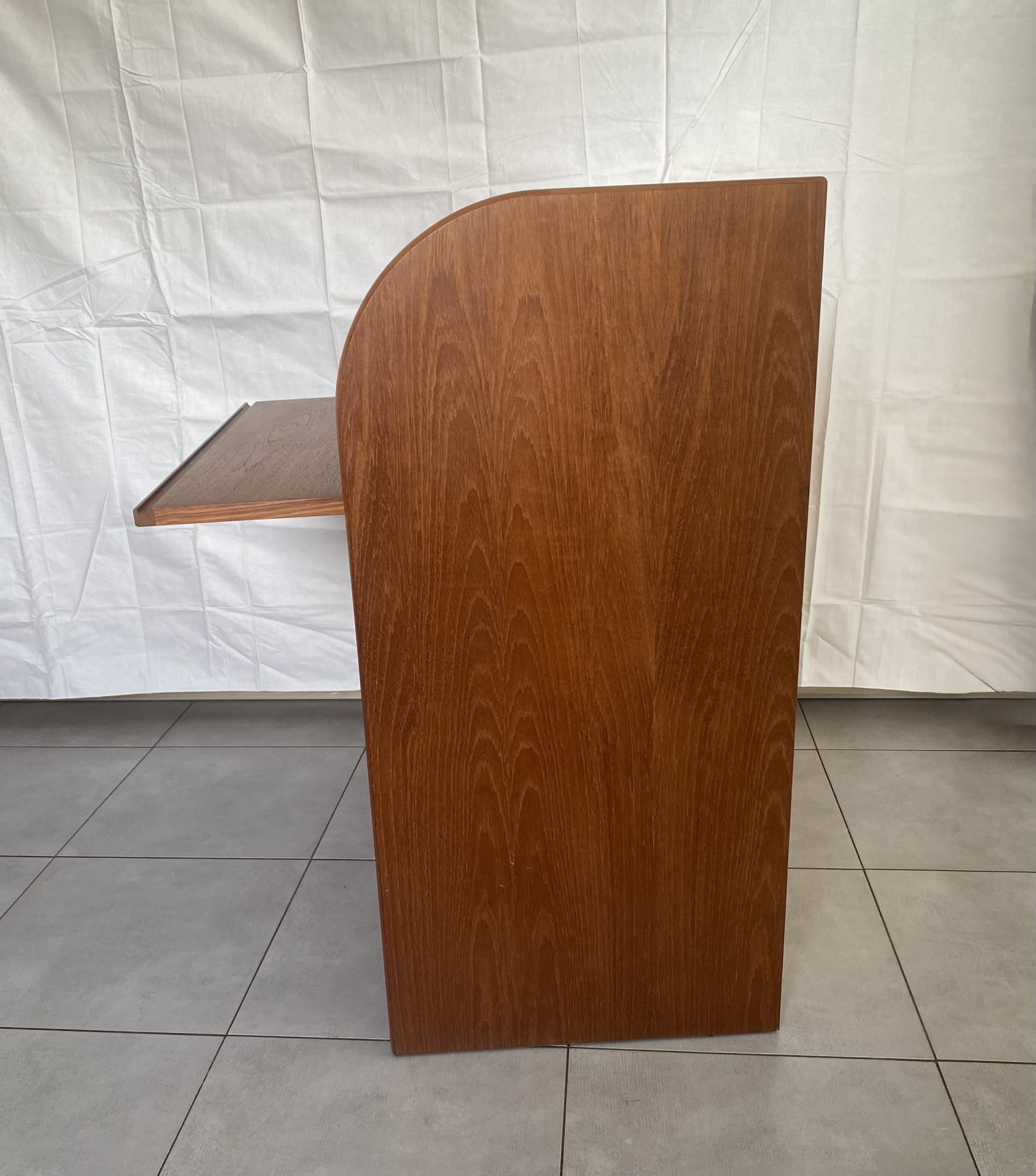 Secrétaire en bois de teck très complet. Dans le haut, il présente une partie secrétaire fermée à clef par un rideau coulissant, bombé, derrière lequel figure deux tiroirs centraux, des espaces de rangement avec un planche horizontale réglable en hauteur à gauche, et à droite des espaces pour des papiers. Un tablette d’écritoire peut se déployer en glissant avec une profondeur de 37 cm, ce qui permet d’y placer un ordinateur. En dessous, il présente 3 tiroirs de profondeur croissante avec des poignées en bois stylisées. Ceci rend ce meuble très polyvalent, pouvant être utilisé dans un salon, un bureau, une chambre, une entrée. Le meuble est estampillé au revers du sigle VM, pour la fabrique Vinde Møbelfabrik et numéroté 86. Il est dessiné par le designer danois Arne Wahl Iversen (1927 -2016) dans les années 60.
