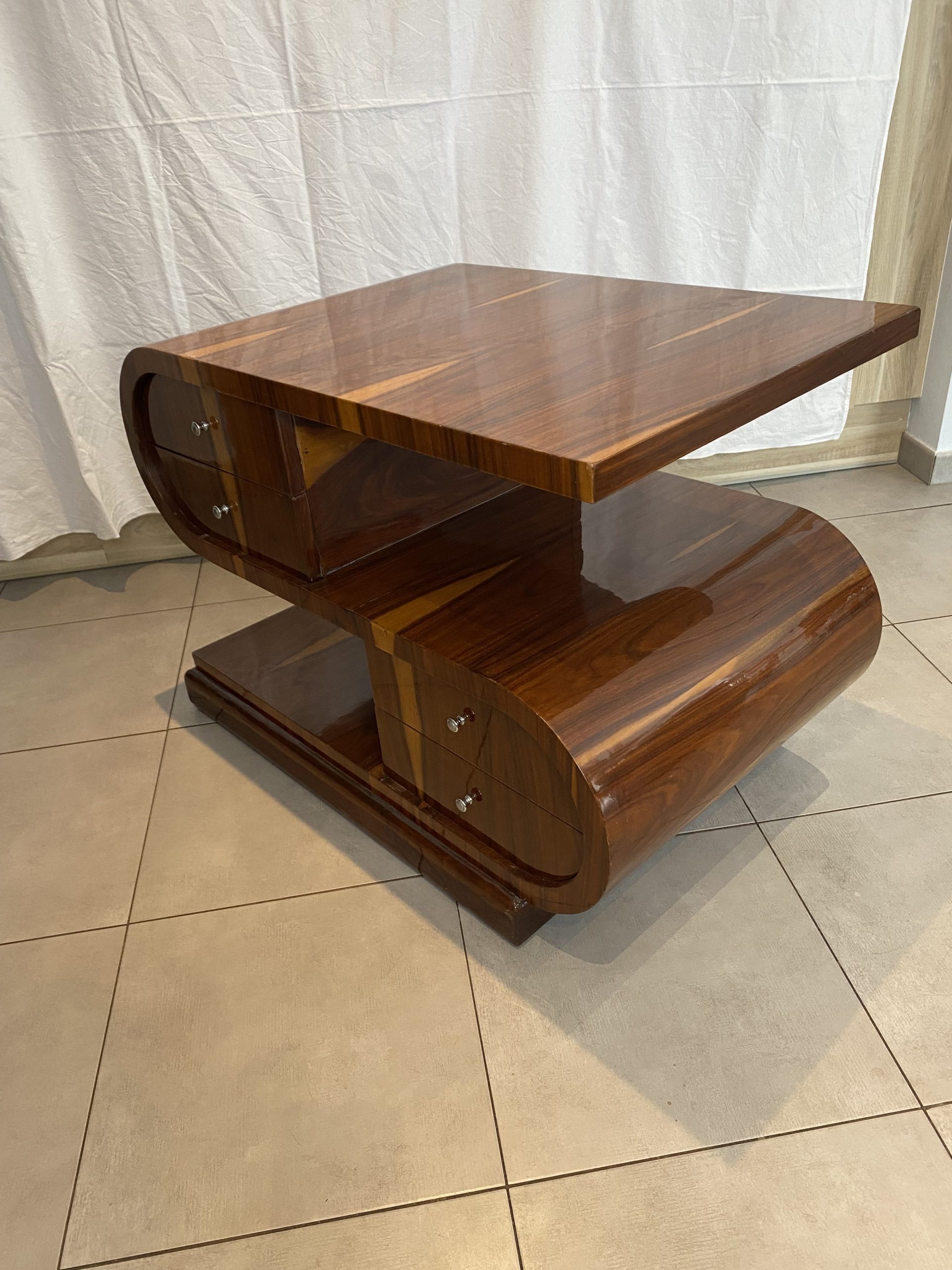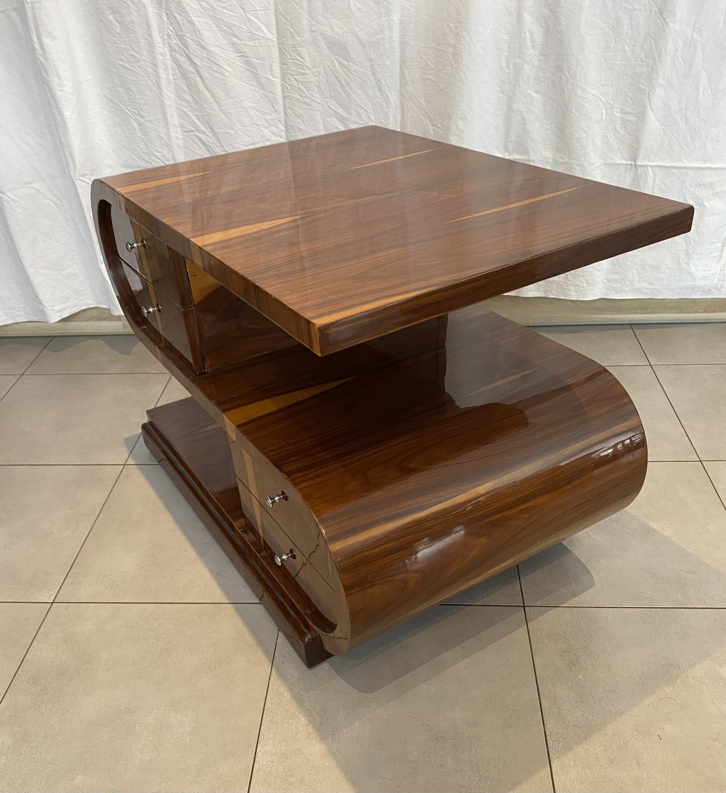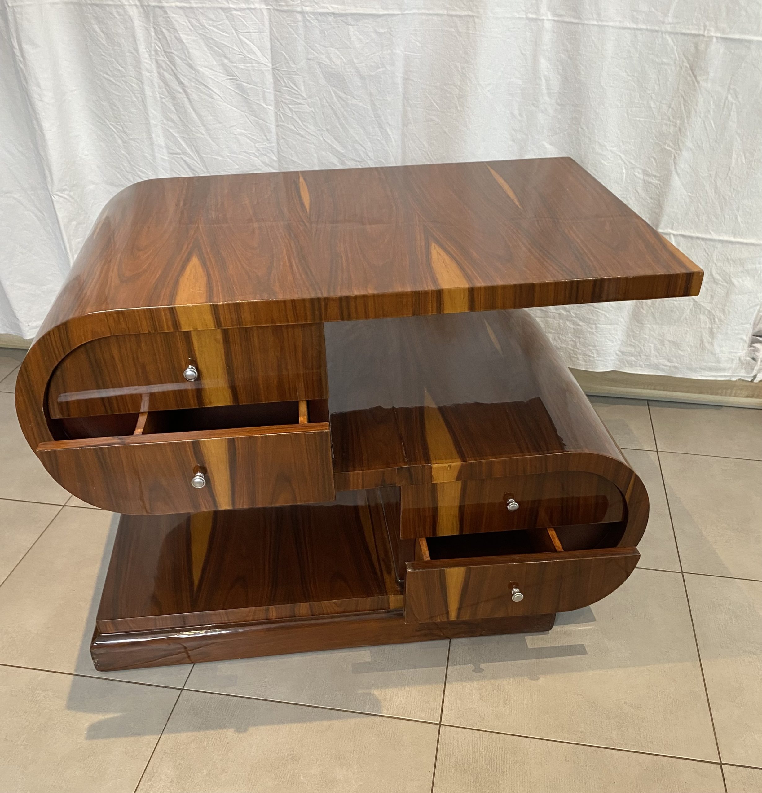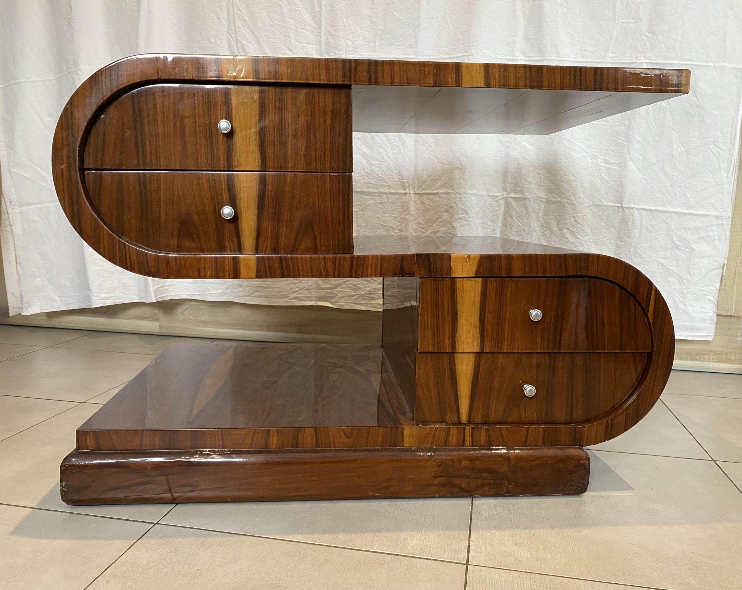 Etonnant meuble en S, visible sous toutes ses faces, d’époque Art Déco. Il peut servir de table avec rangement dans un coin lecture ou trôner seul dans un salon supportant une lampe et une sculpture. Il est réalisé en placage de bois exotique ( peut-être du cèdre du Liban ) avec 8 tiroirs, 4 par cotés.