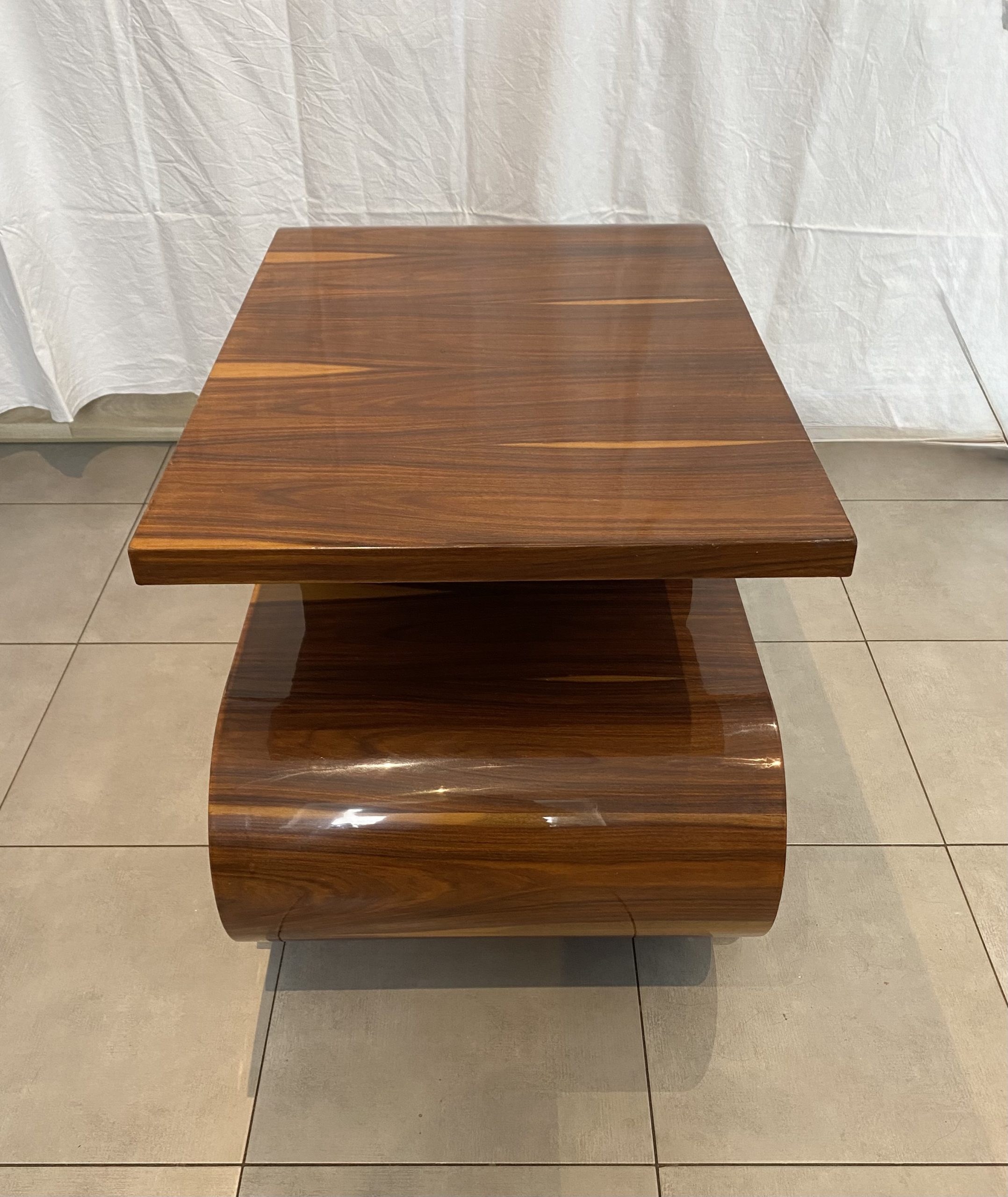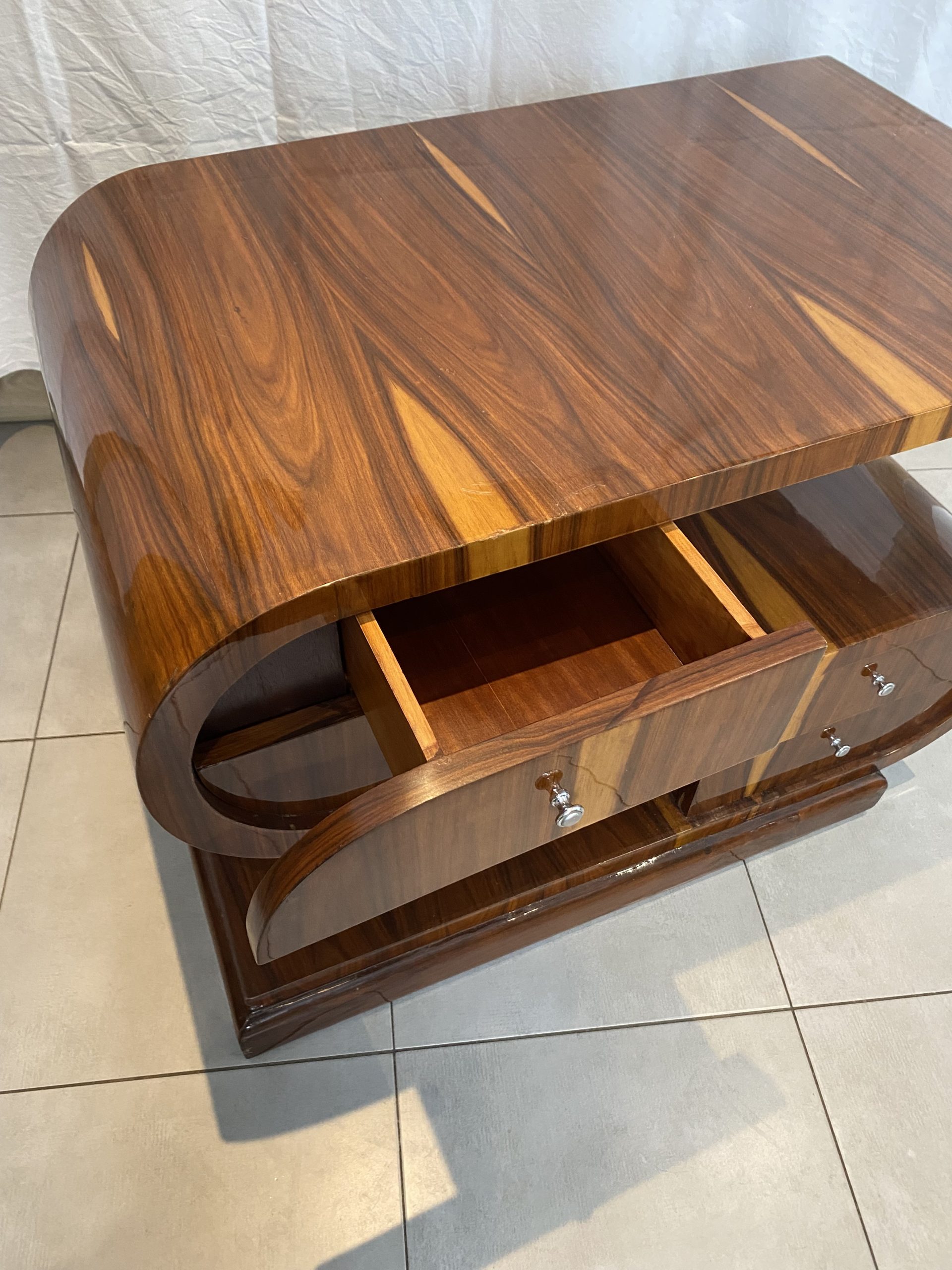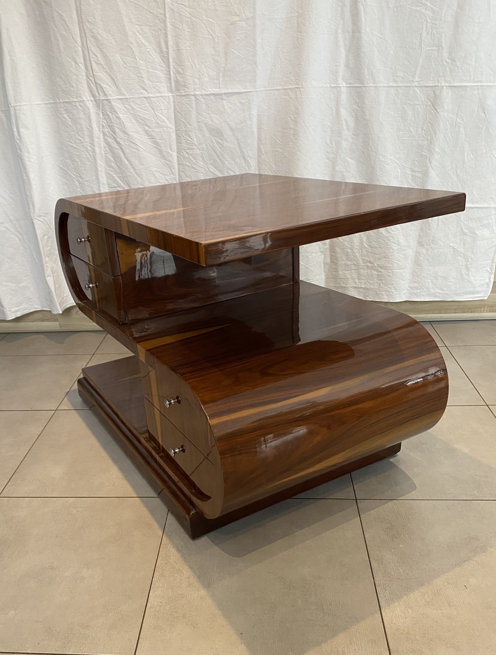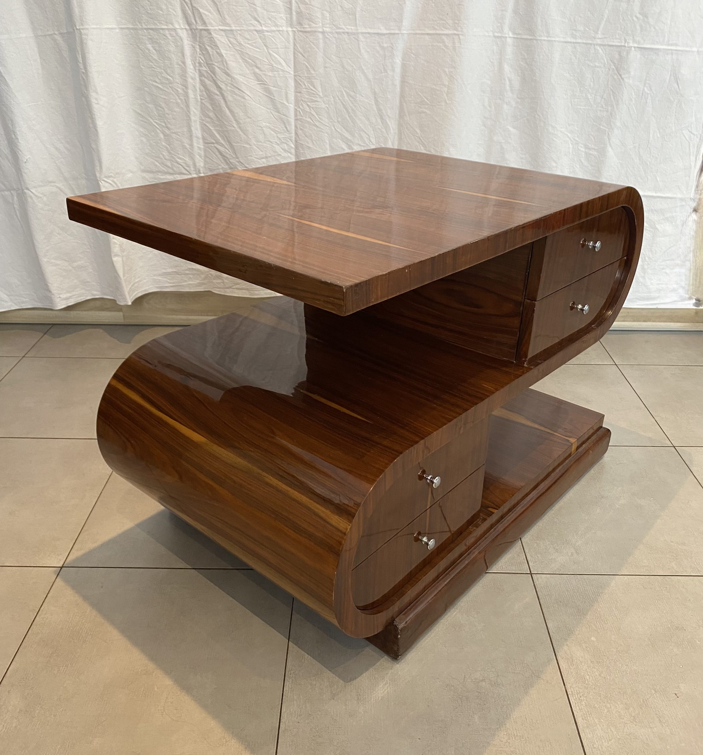 Etonnant meuble en S, visible sous toutes ses faces, d’époque Art Déco. Il peut servir de table avec rangement dans un coin lecture ou trôner seul dans un salon supportant une lampe et une sculpture. Il est réalisé en placage de bois exotique ( peut-être du cèdre du Liban ) avec 8 tiroirs, 4 par cotés.