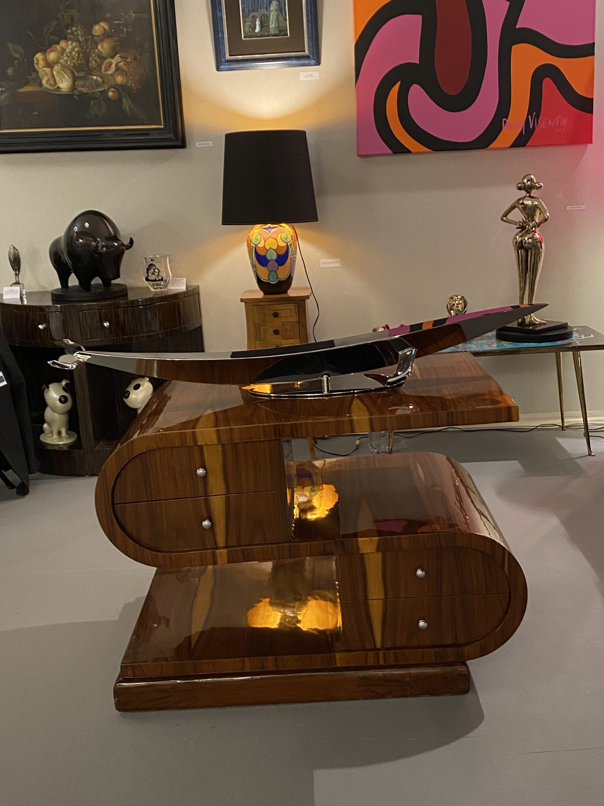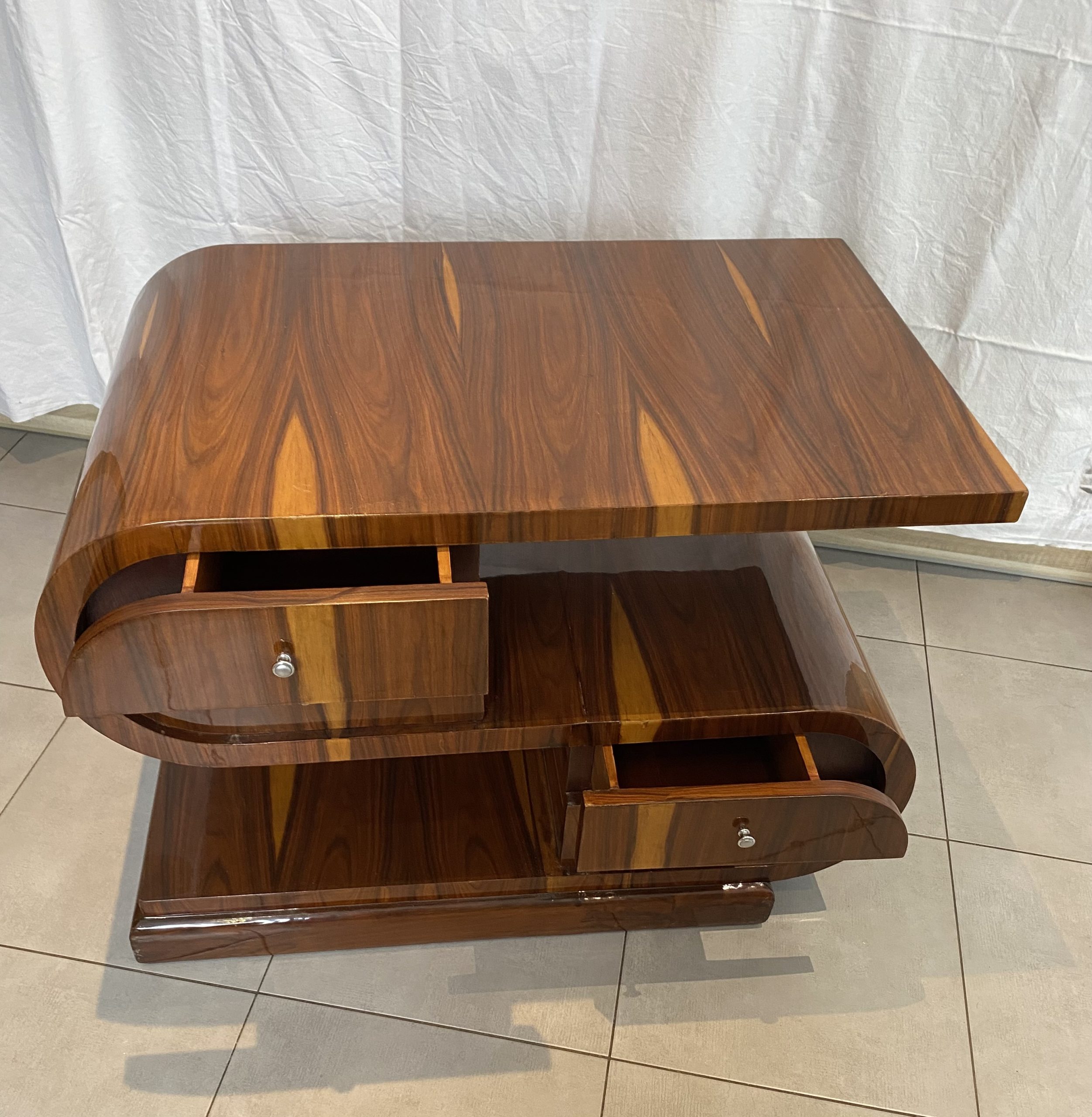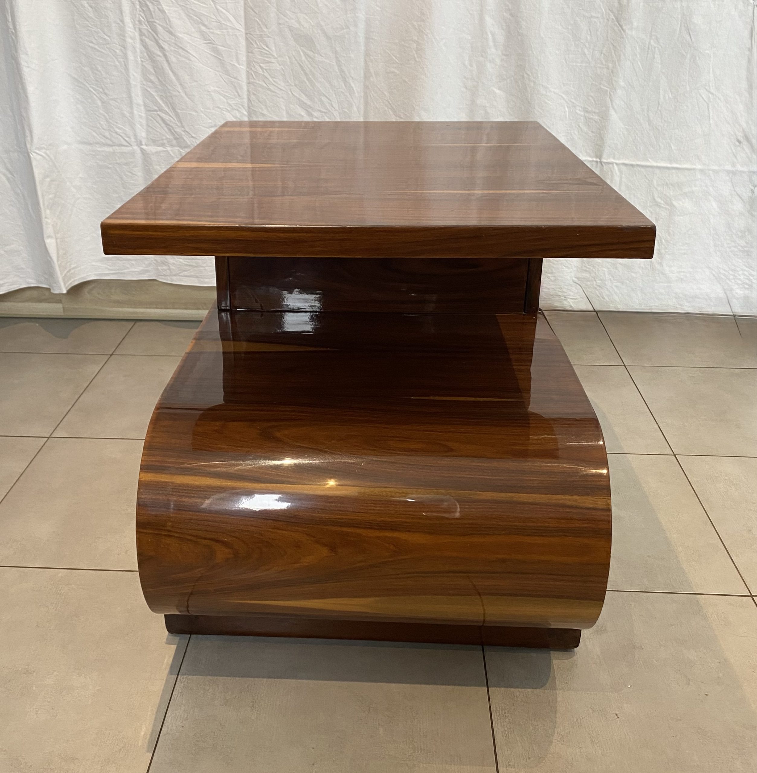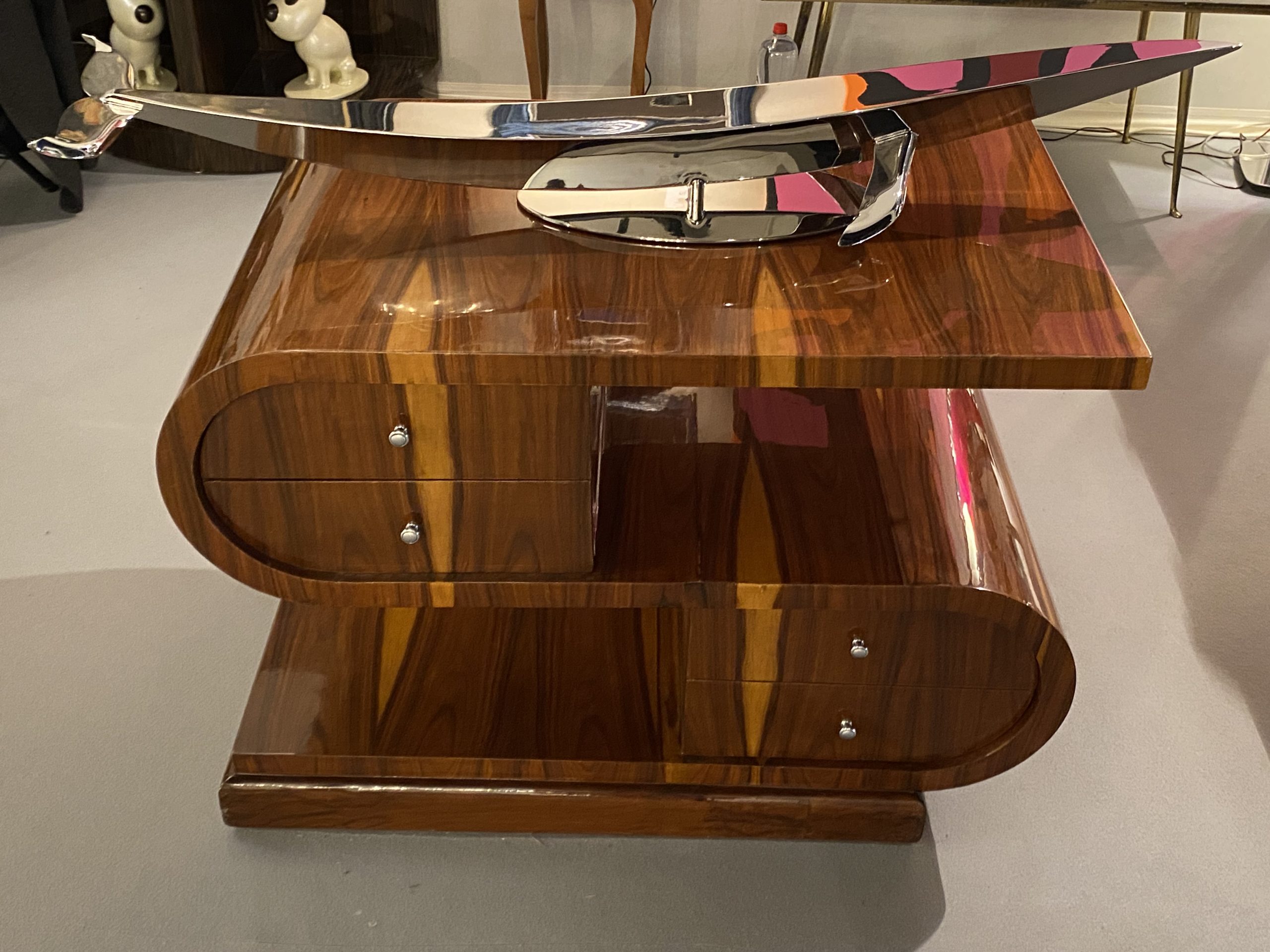 Etonnant meuble en S, visible sous toutes ses faces, d’époque Art Déco. Il peut servir de table avec rangement dans un coin lecture ou trôner seul dans un salon supportant une lampe et une sculpture. Il est réalisé en placage de bois exotique ( peut-être du cèdre du Liban ) avec 8 tiroirs, 4 par cotés.