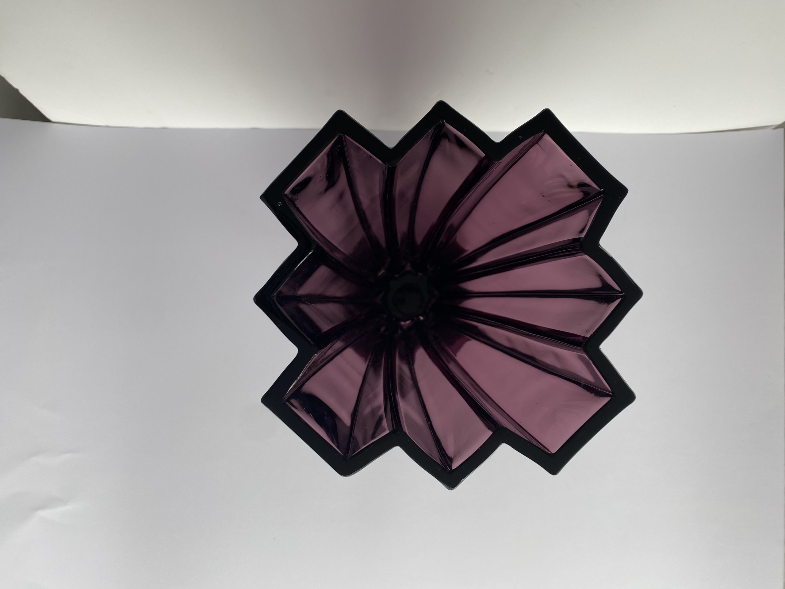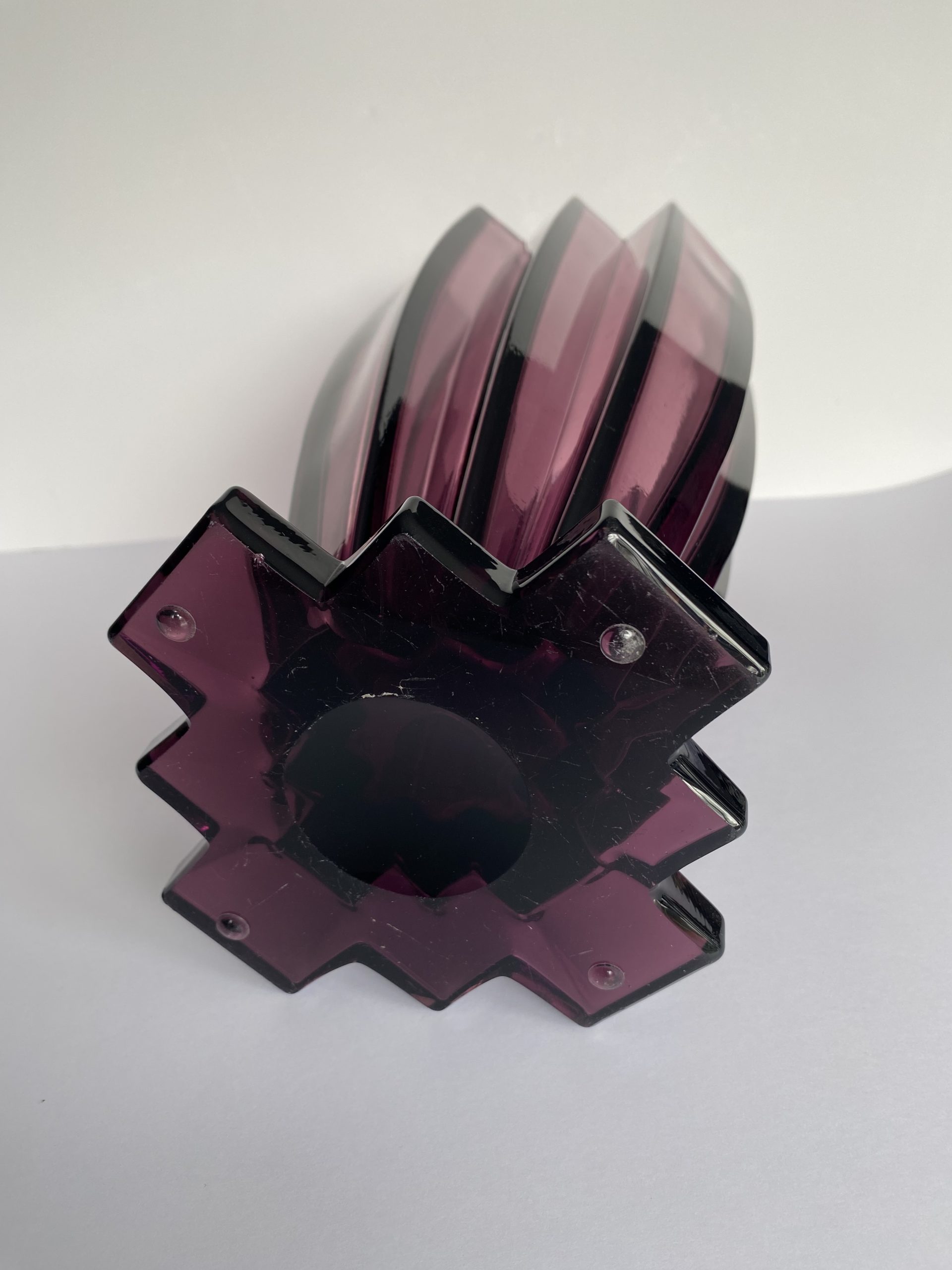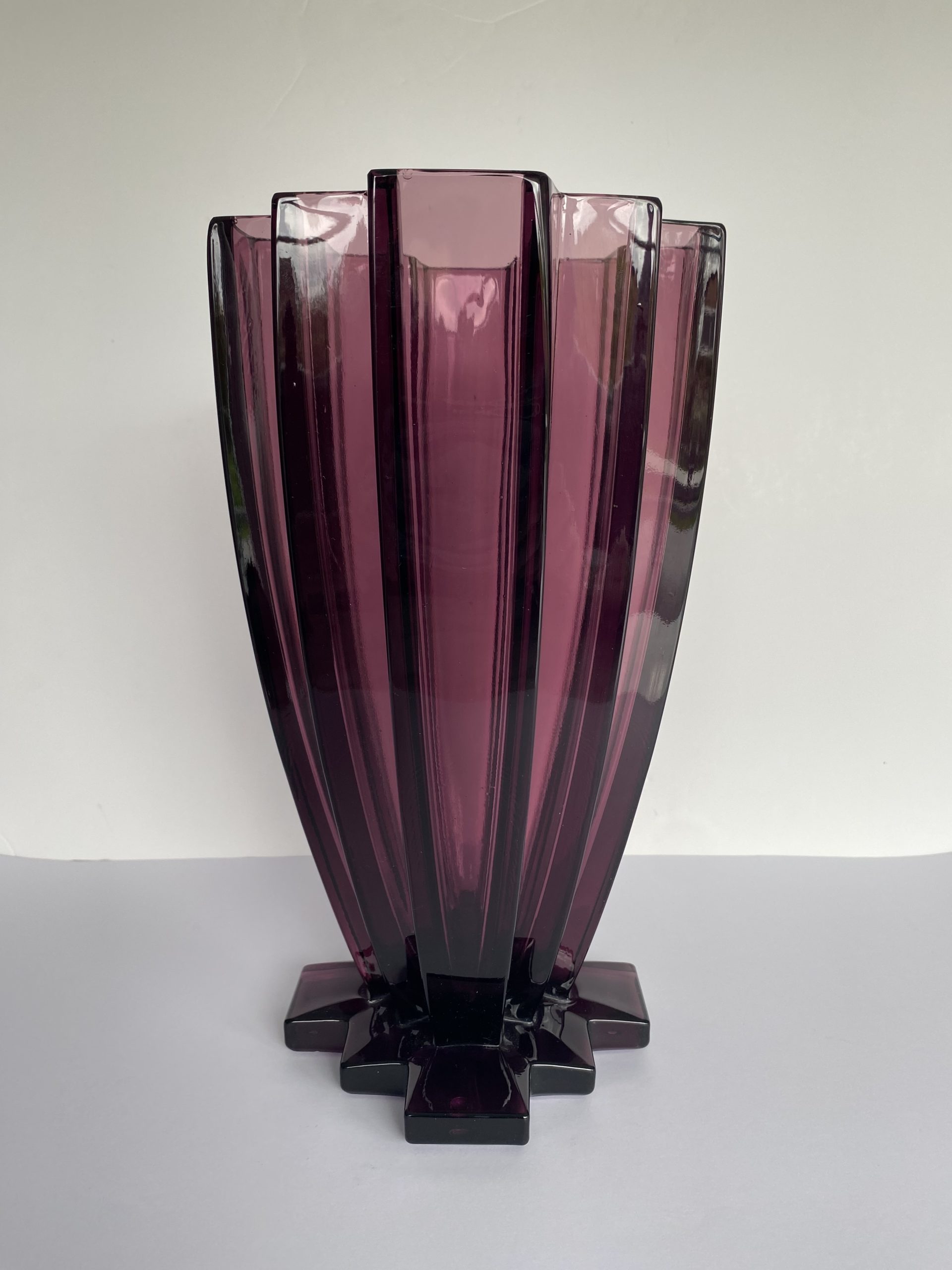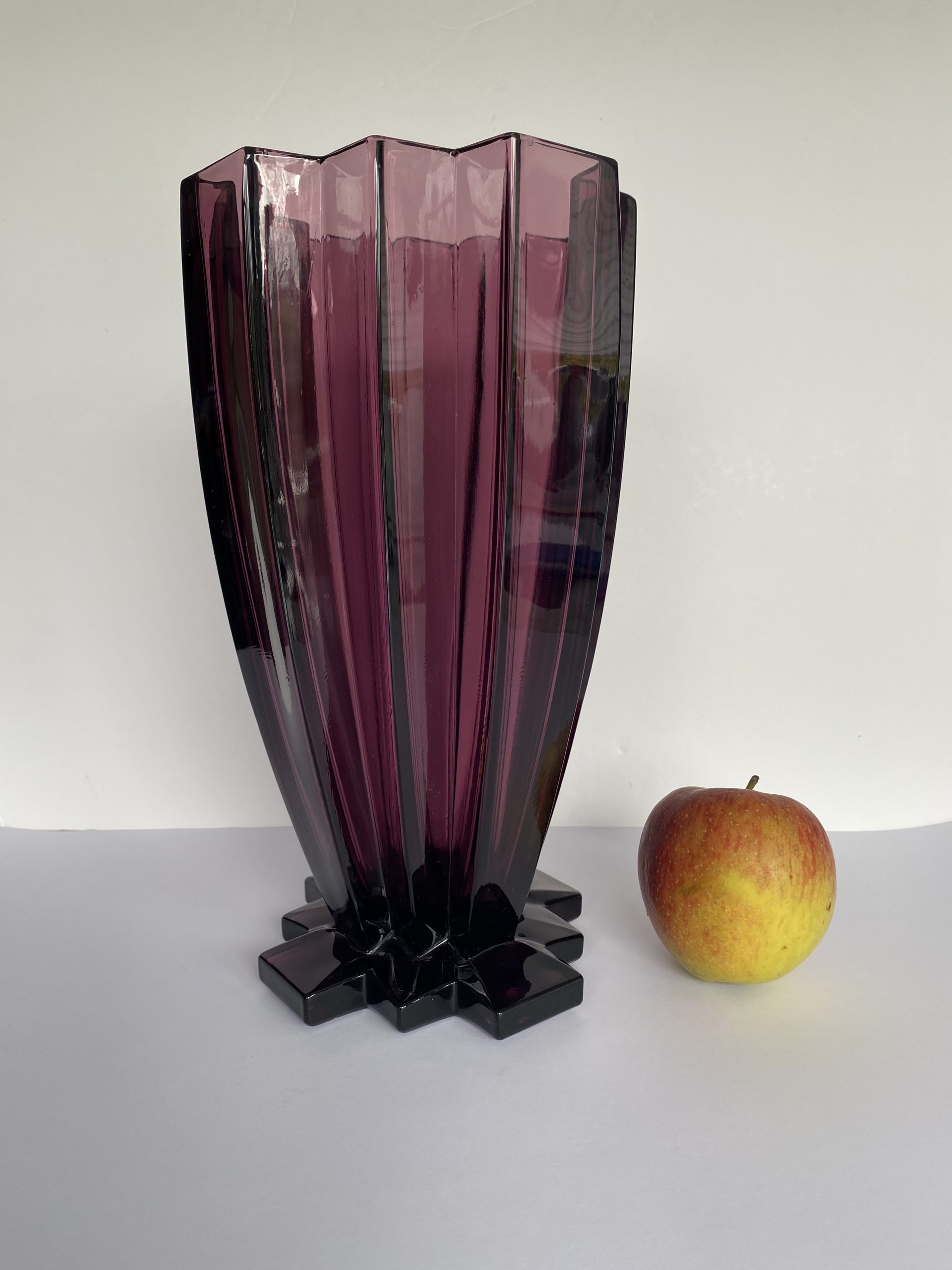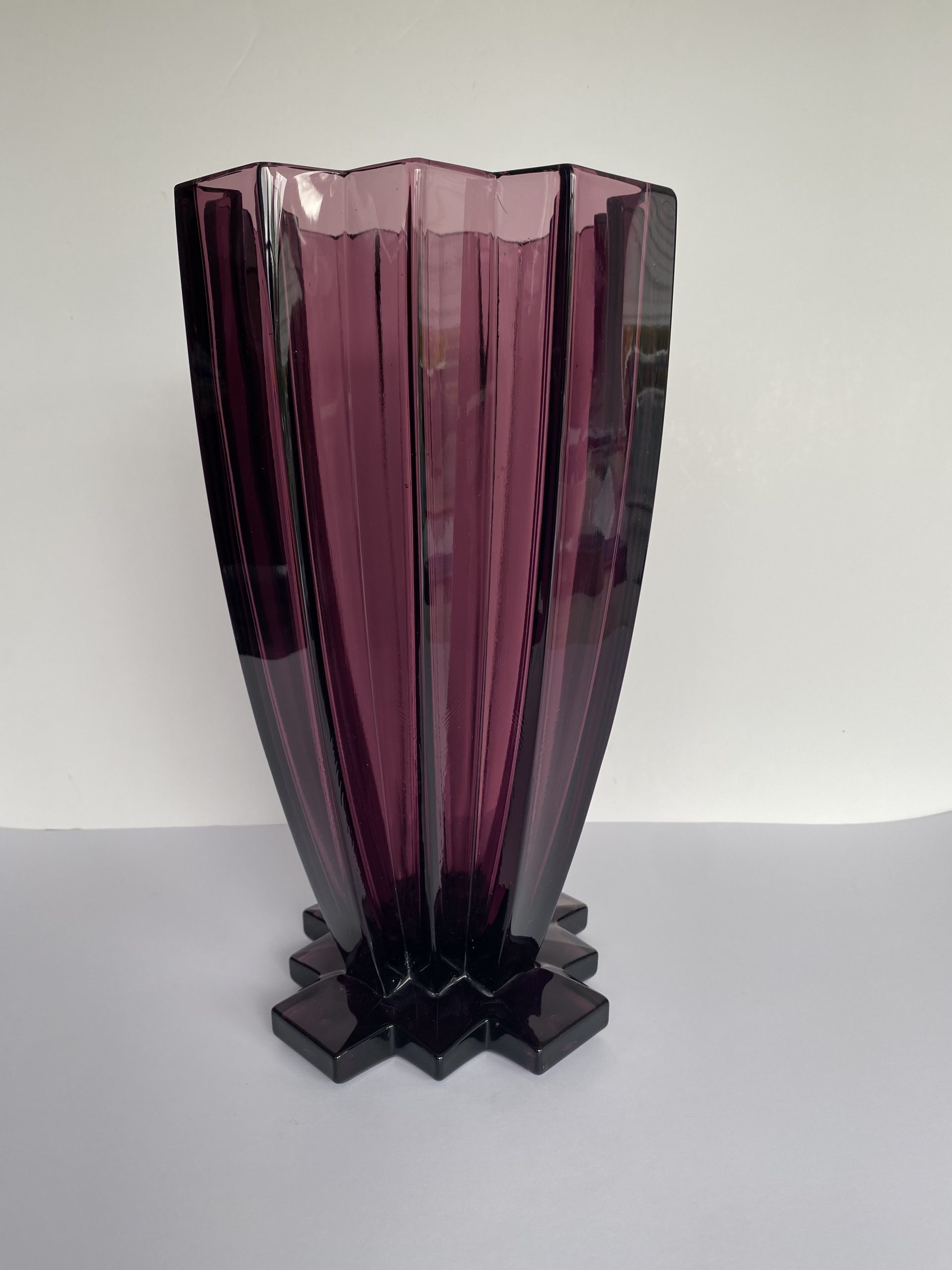 Vase art Déco au dessin géométrique en demi-cristal améthyste, fabriqué dans la verrerie Markhbeinn, qui avait une succursale à Paris. Modèle daté de 1934 et repris au catalogue.