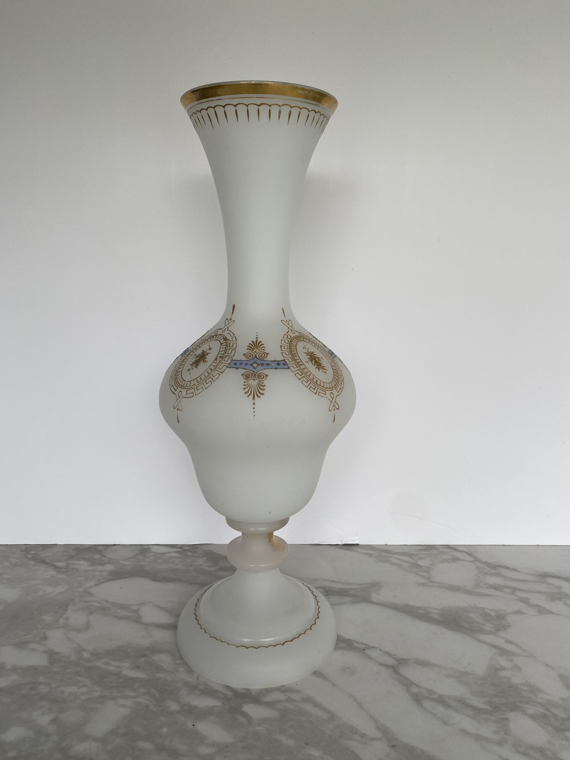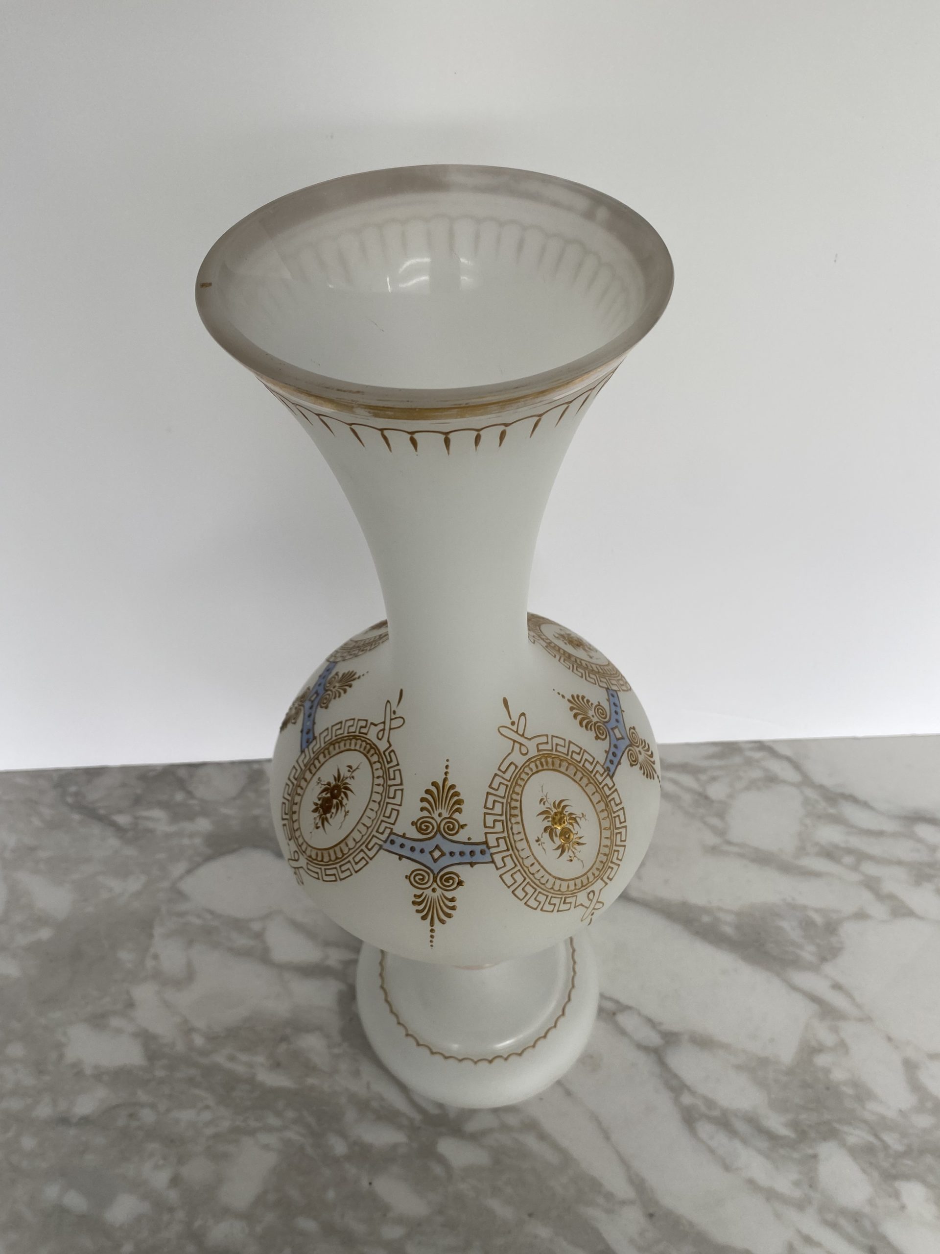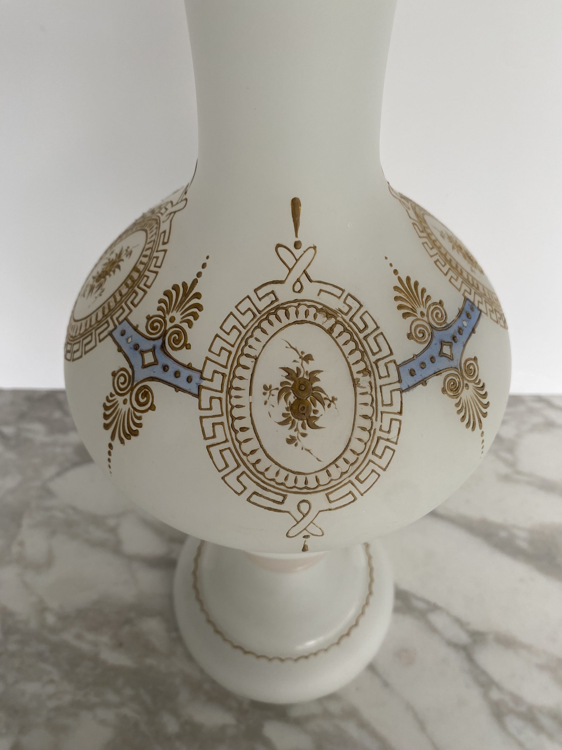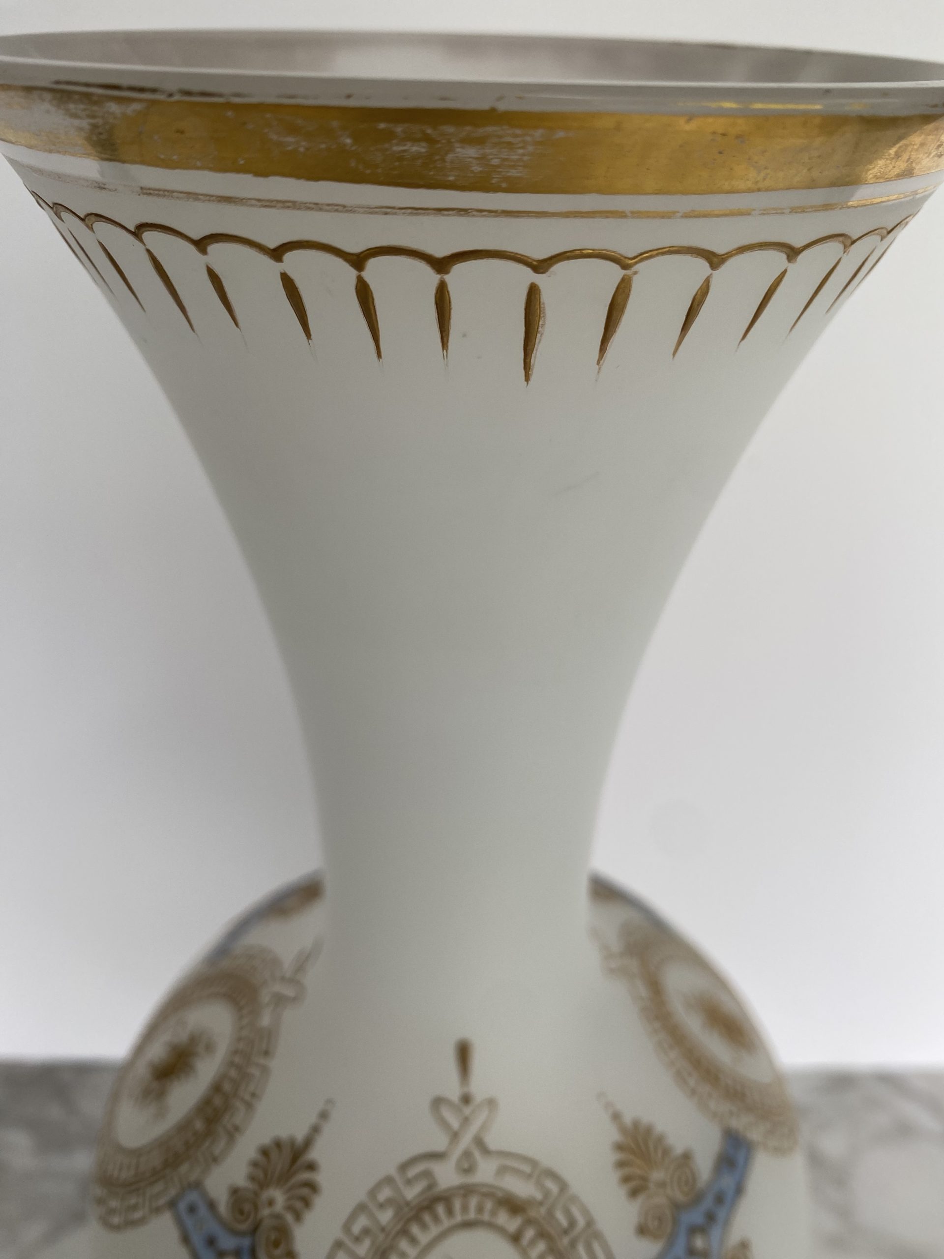 Vase en opaline blanche “pâte de riz” garni d’une frise or et bleu faite de motifs de fleurs en médaillons de grecques, séparés par des palmettes. Le haut du vase est également garni d’un liseret or et de motifs en gouttes. Le pieds du vase présente un rehaut d’or, fort abimé et un liseret mammelonné dans le bas. Le style est Napoléon III avec une production de la fin du XIX ème siècle.