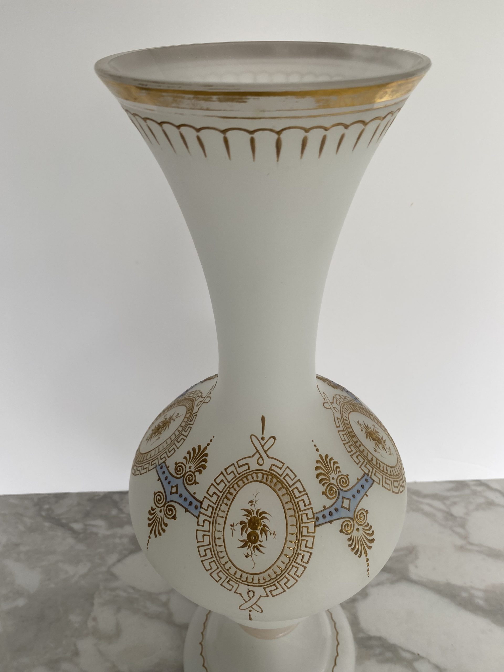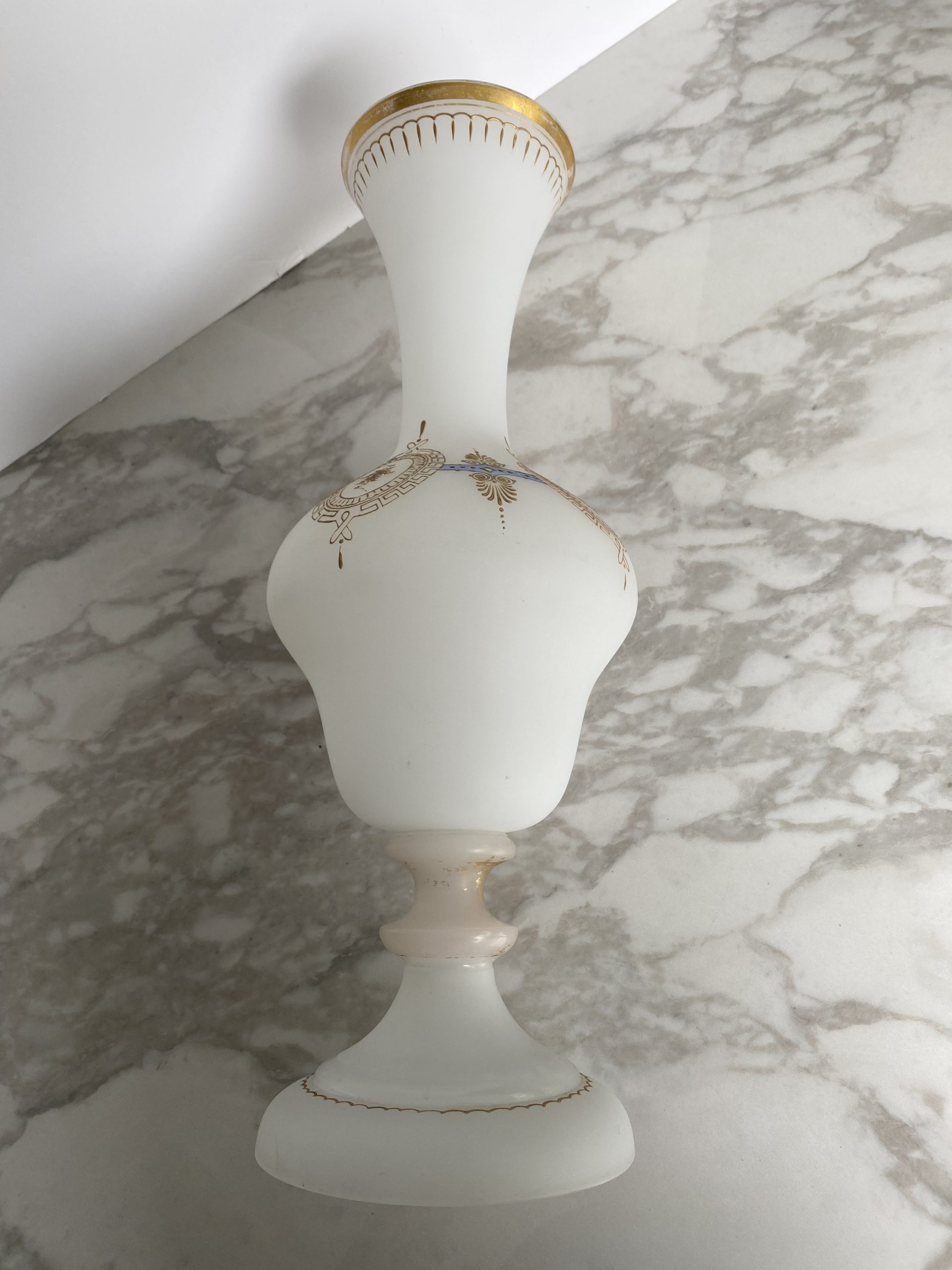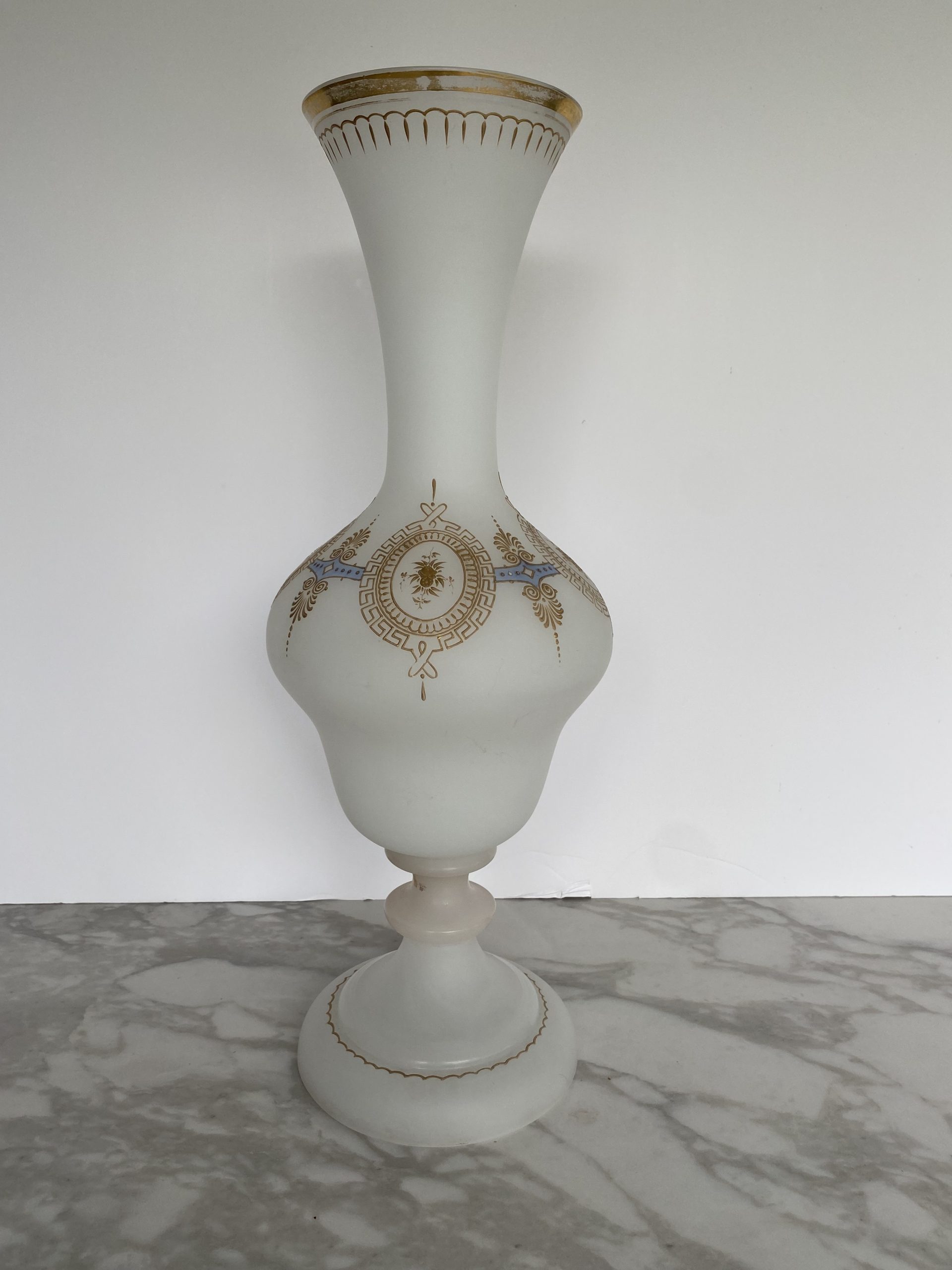 Vase en opaline blanche “pâte de riz” garni d’une frise or et bleu faite de motifs de fleurs en médaillons de grecques, séparés par des palmettes. Le haut du vase est également garni d’un liseret or et de motifs en gouttes. Le pieds du vase présente un rehaut d’or, fort abimé et un liseret mammelonné dans le bas. Le style est Napoléon III avec une production de la fin du XIX ème siècle.