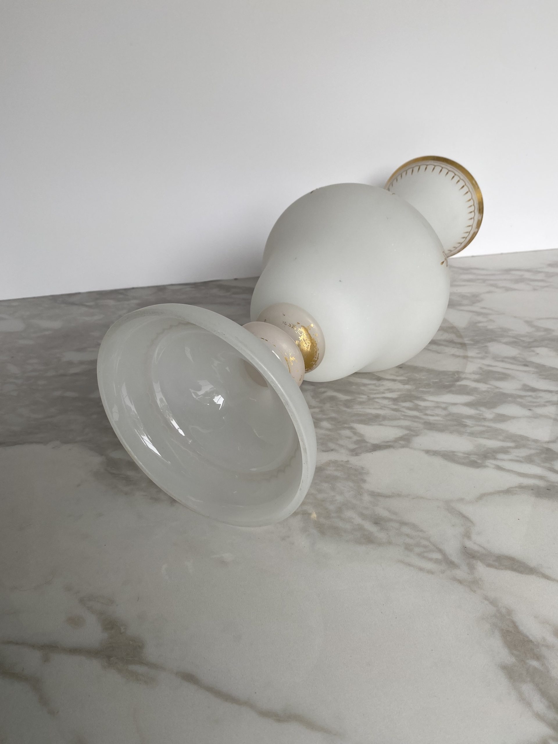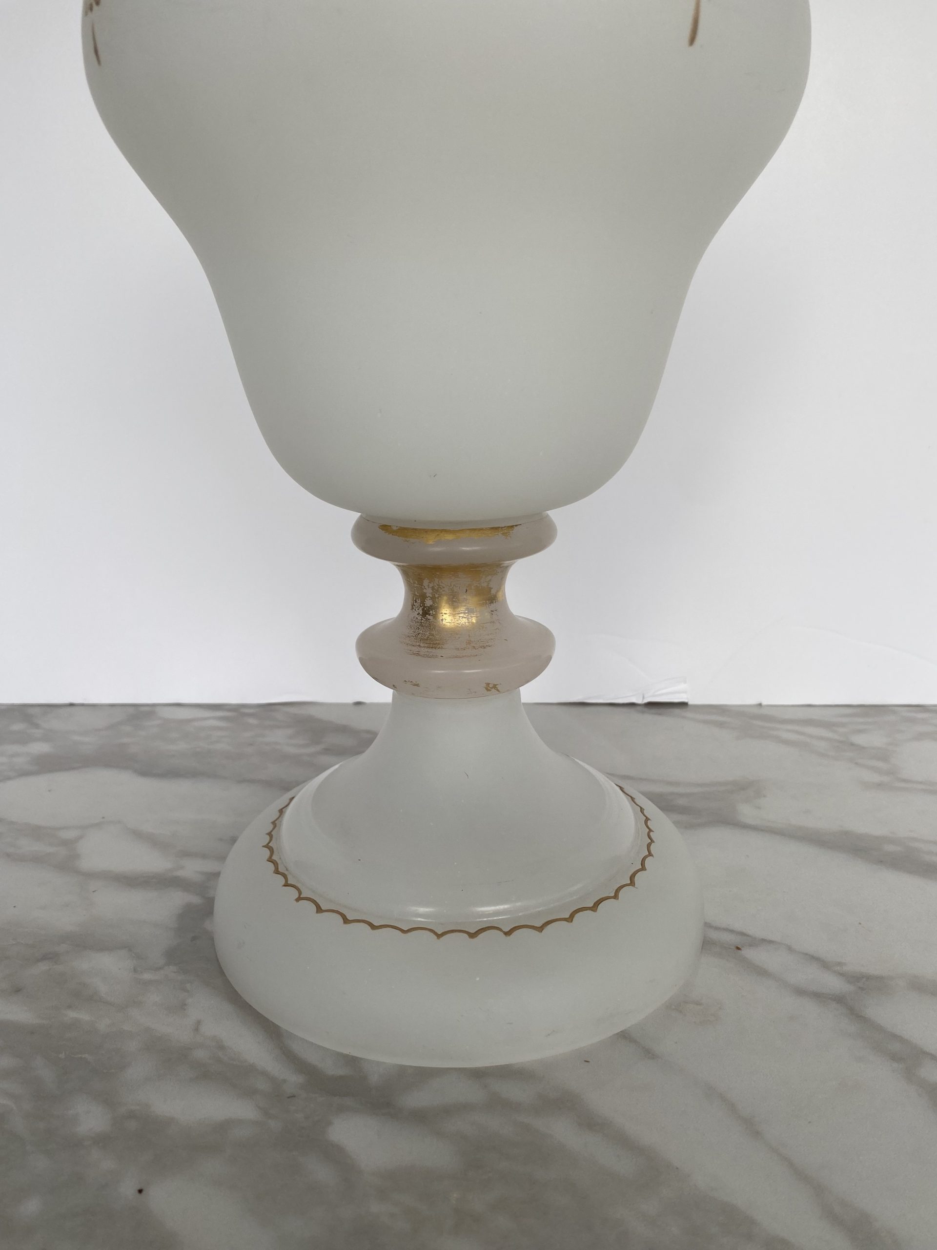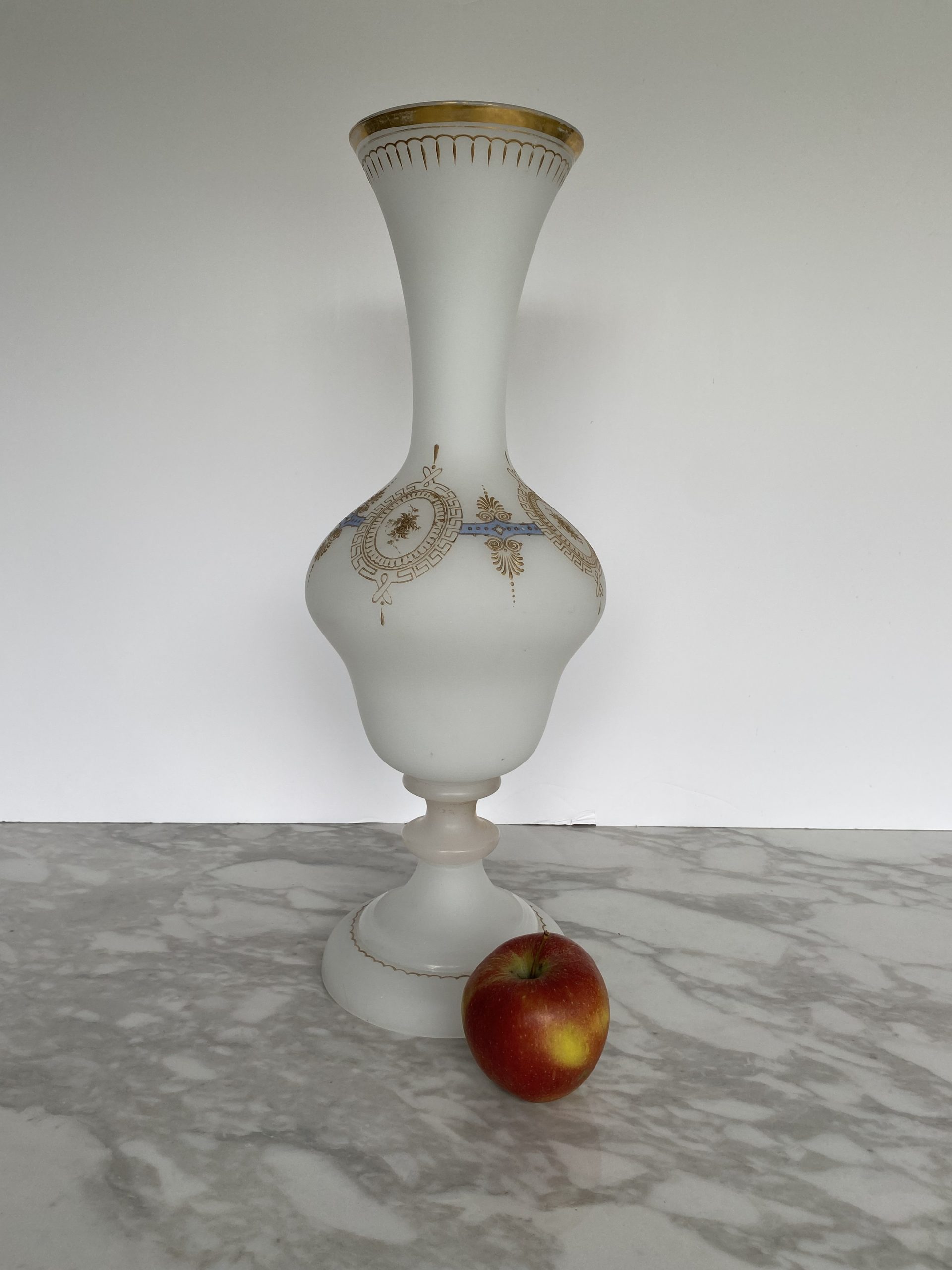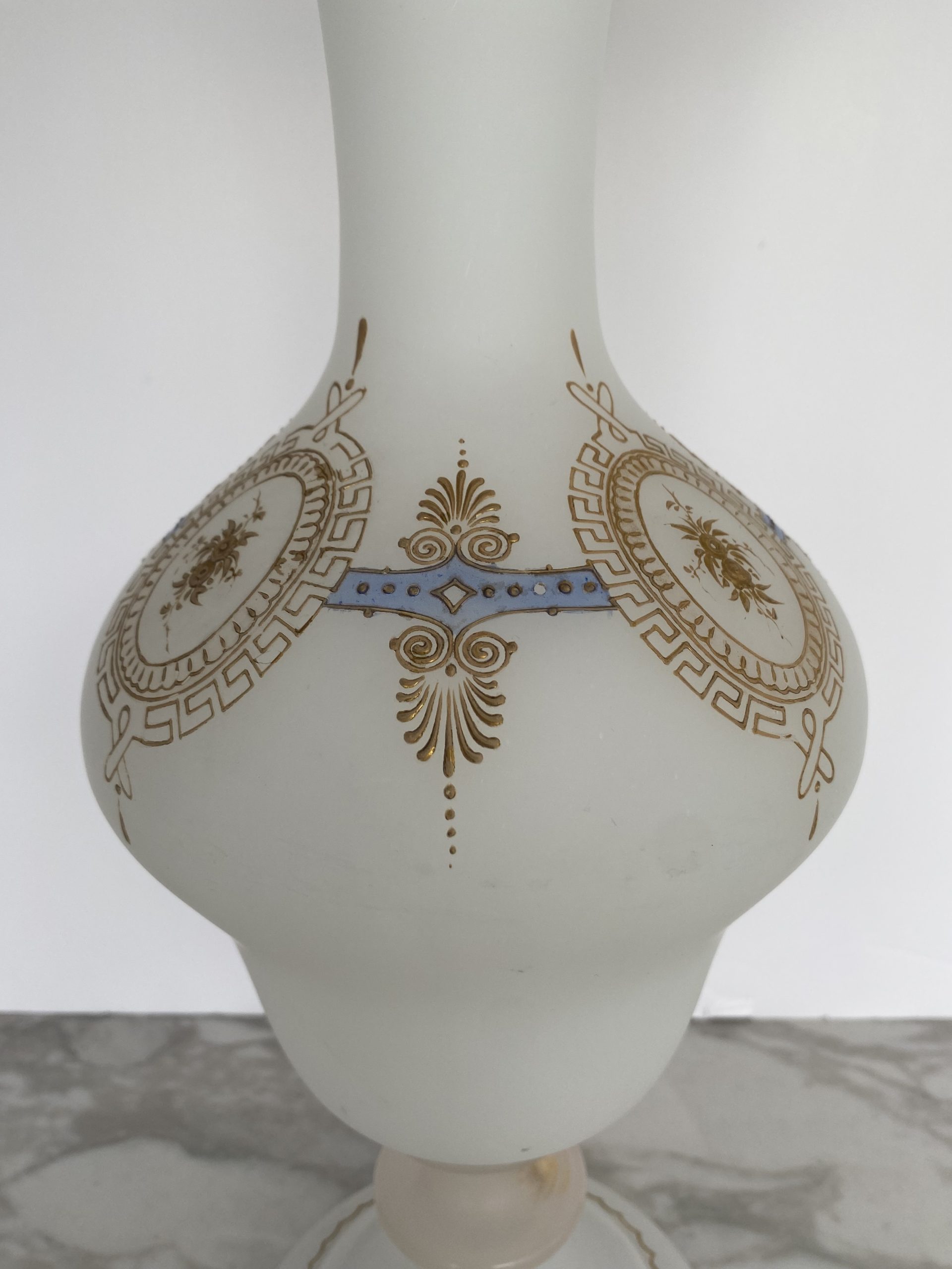 Vase en opaline blanche “pâte de riz” garni d’une frise or et bleu faite de motifs de fleurs en médaillons de grecques, séparés par des palmettes. Le haut du vase est également garni d’un liseret or et de motifs en gouttes. Le pieds du vase présente un rehaut d’or, fort abimé et un liseret mammelonné dans le bas. Le style est Napoléon III avec une production de la fin du XIX ème siècle.