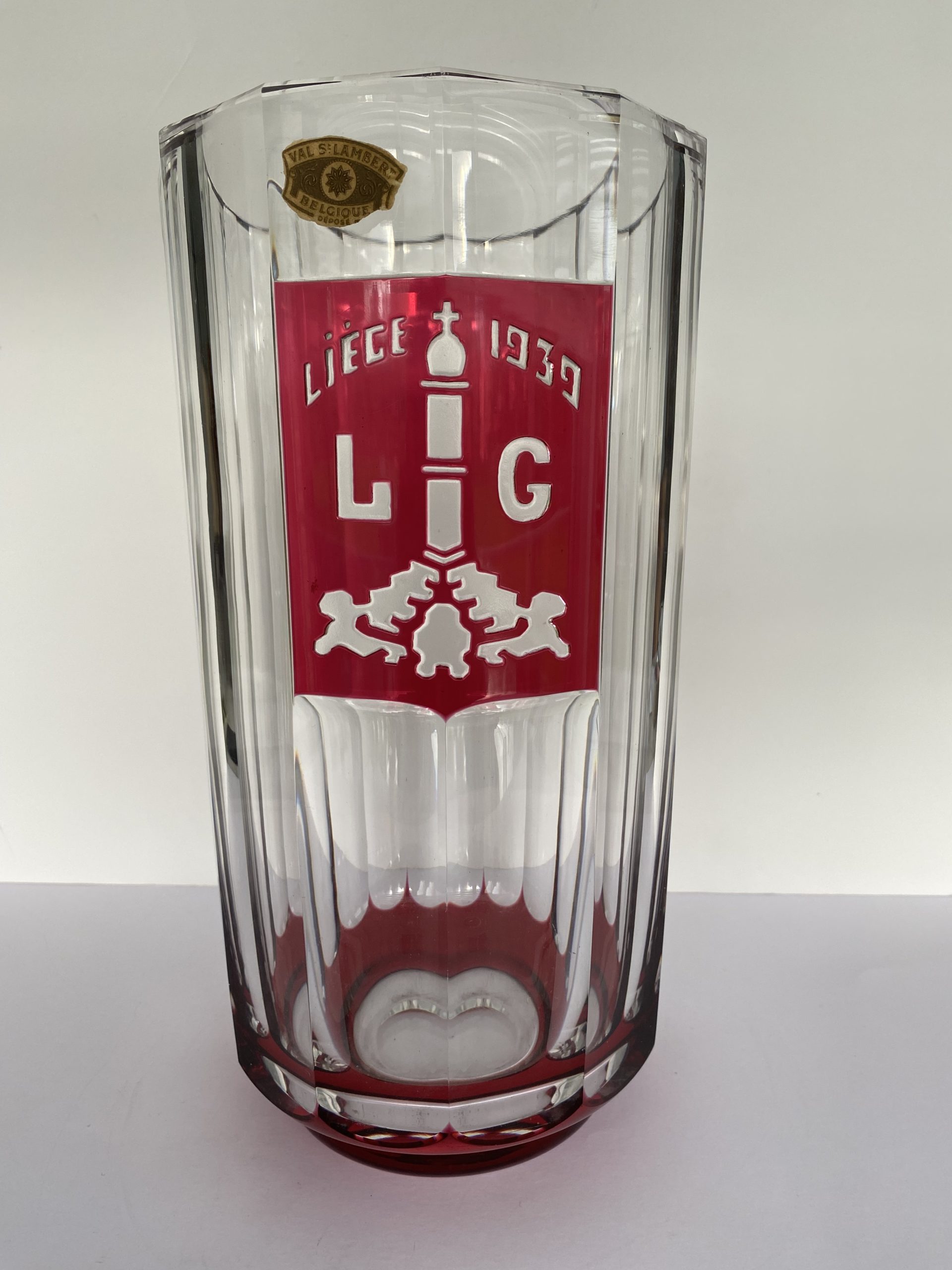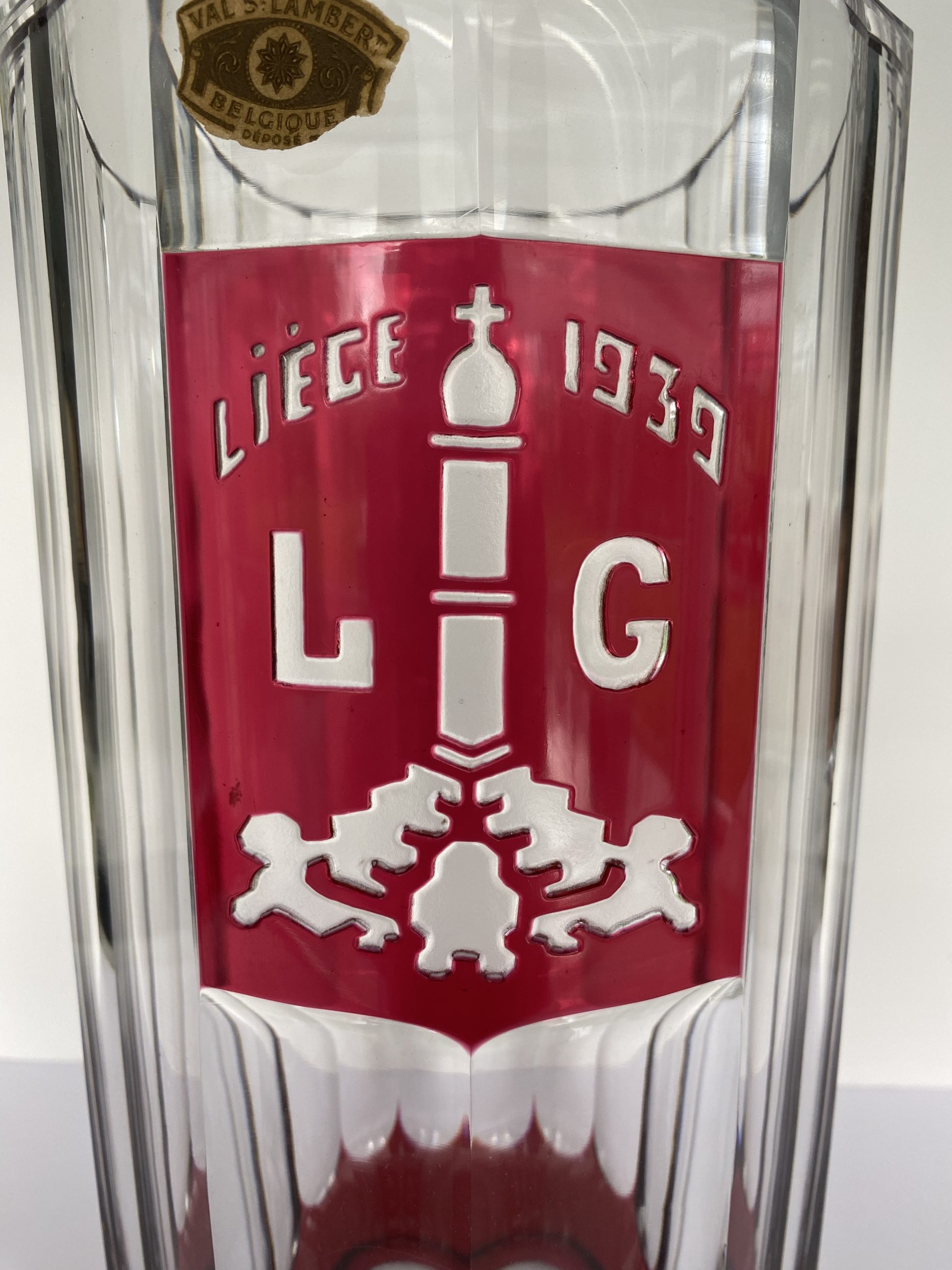 Il arbore, en médaillon, l’emblème de Liège, le perron, et la date de 1939. Le culot est également rouge.