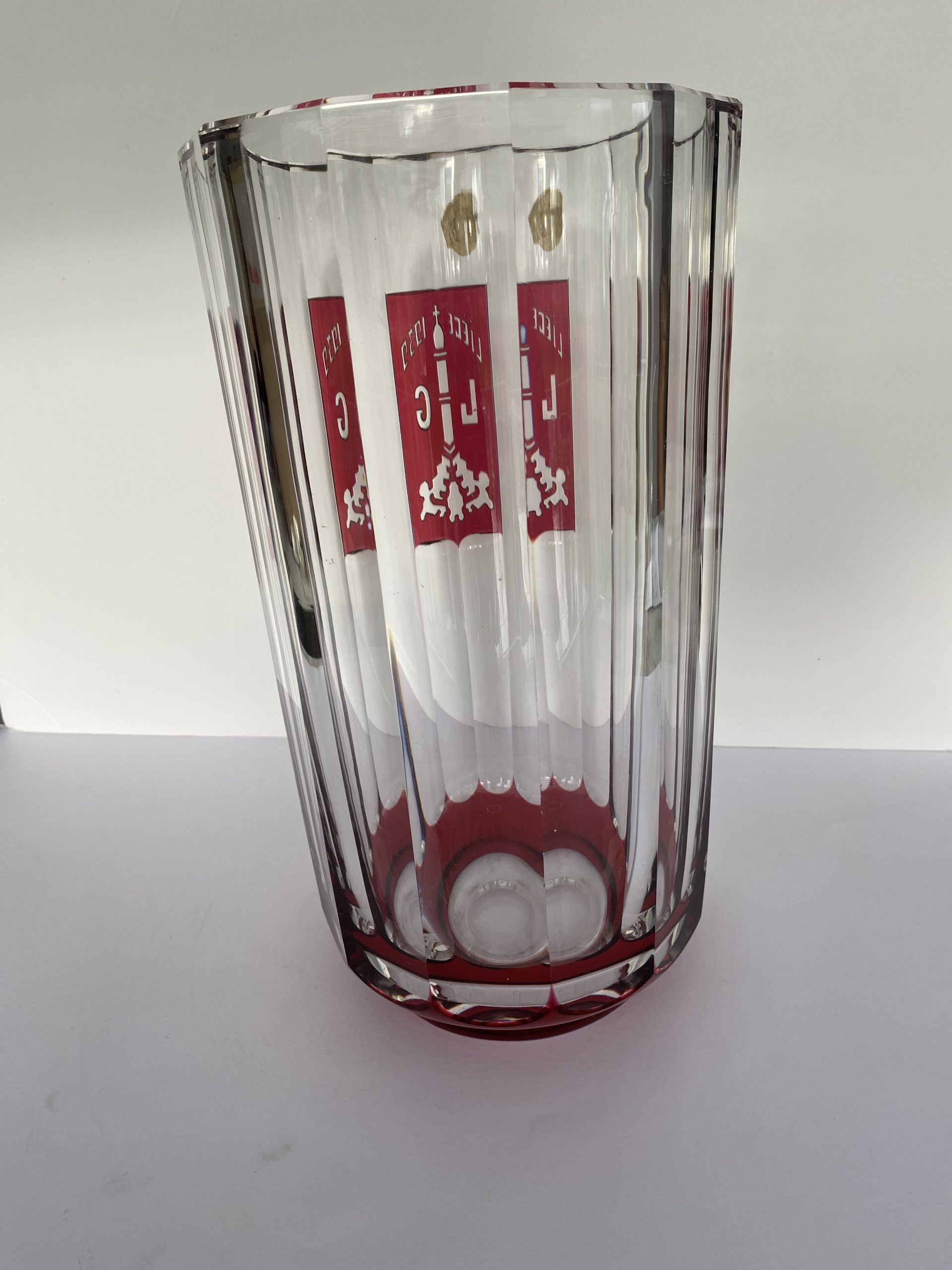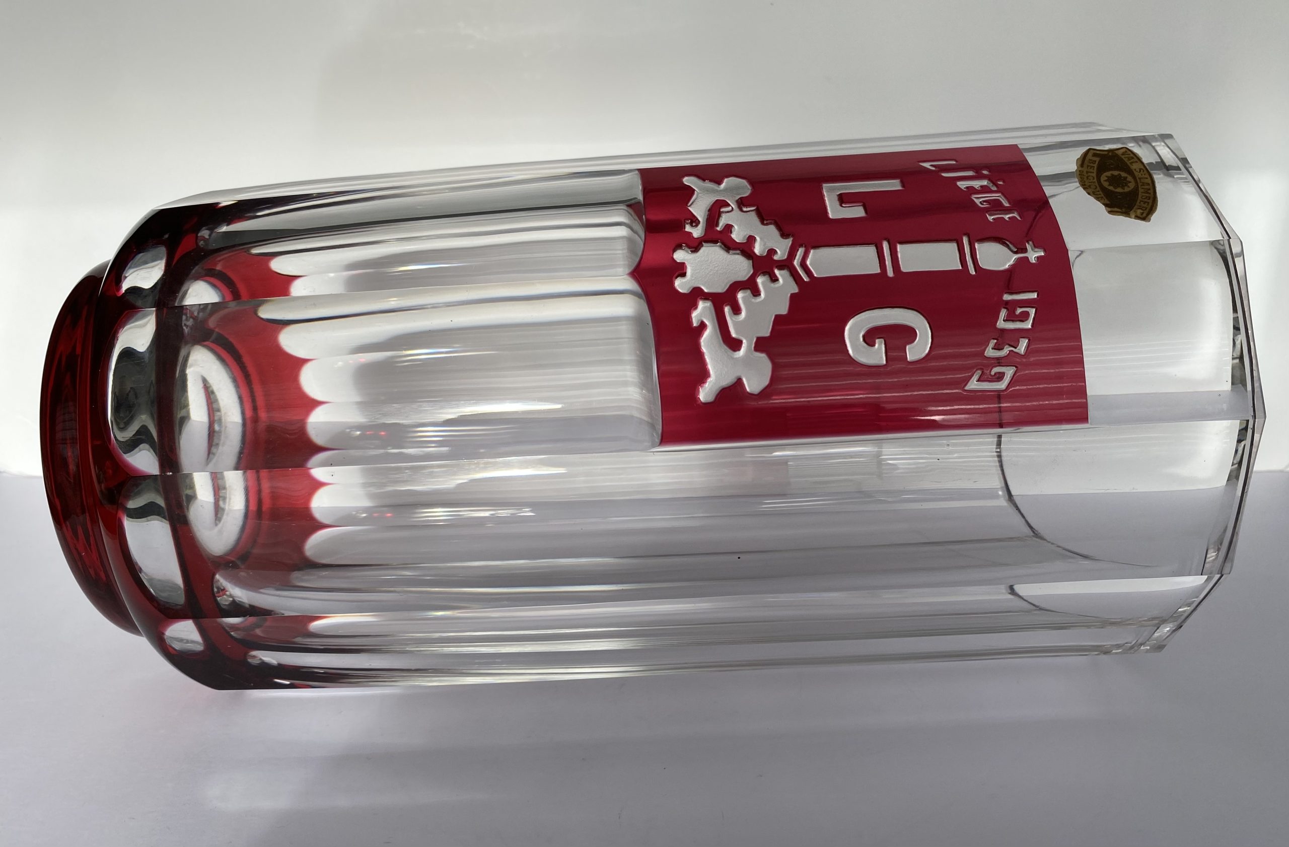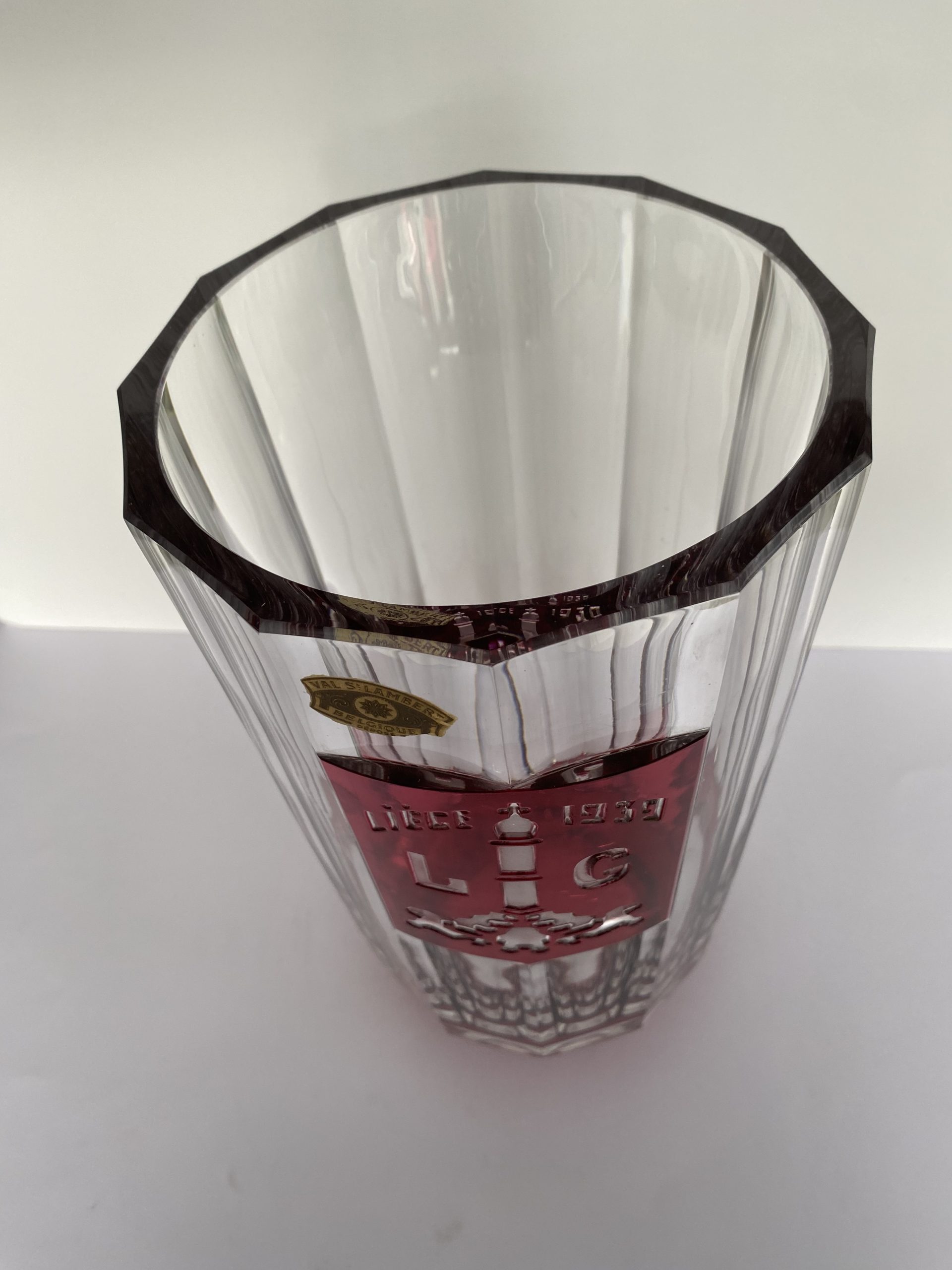 Haut vase en cristal incolore de 52 cm et 5,5 kg, doublé rouge de la manufacture du Val-Saint-Lambert.