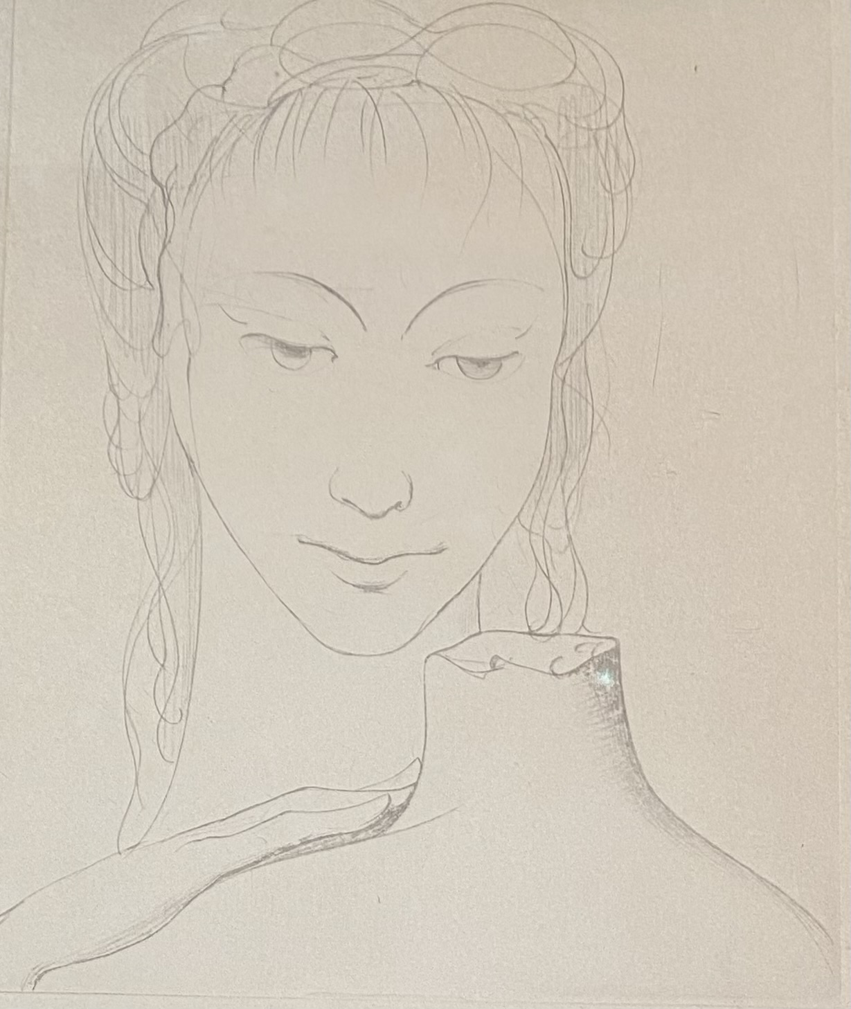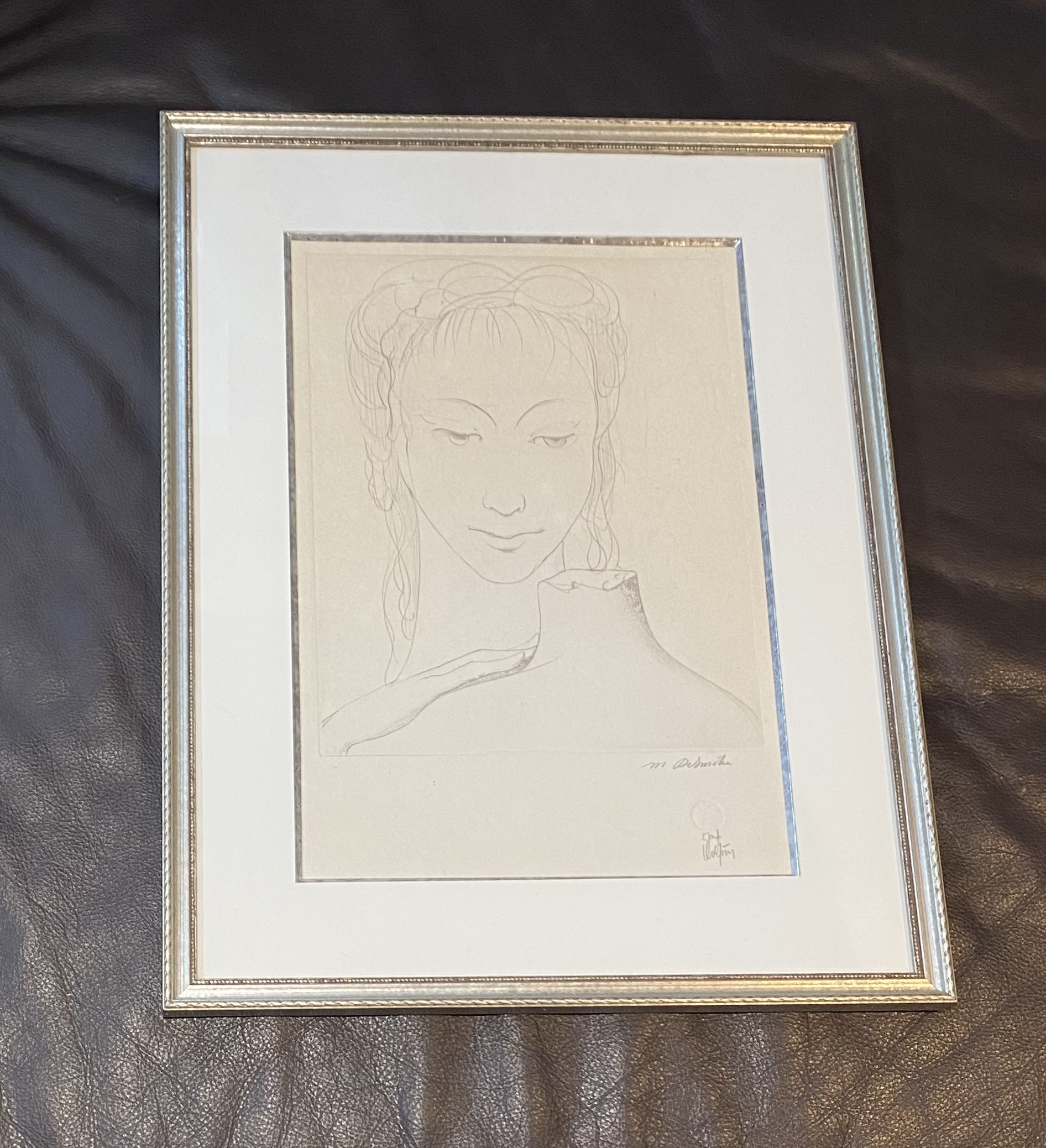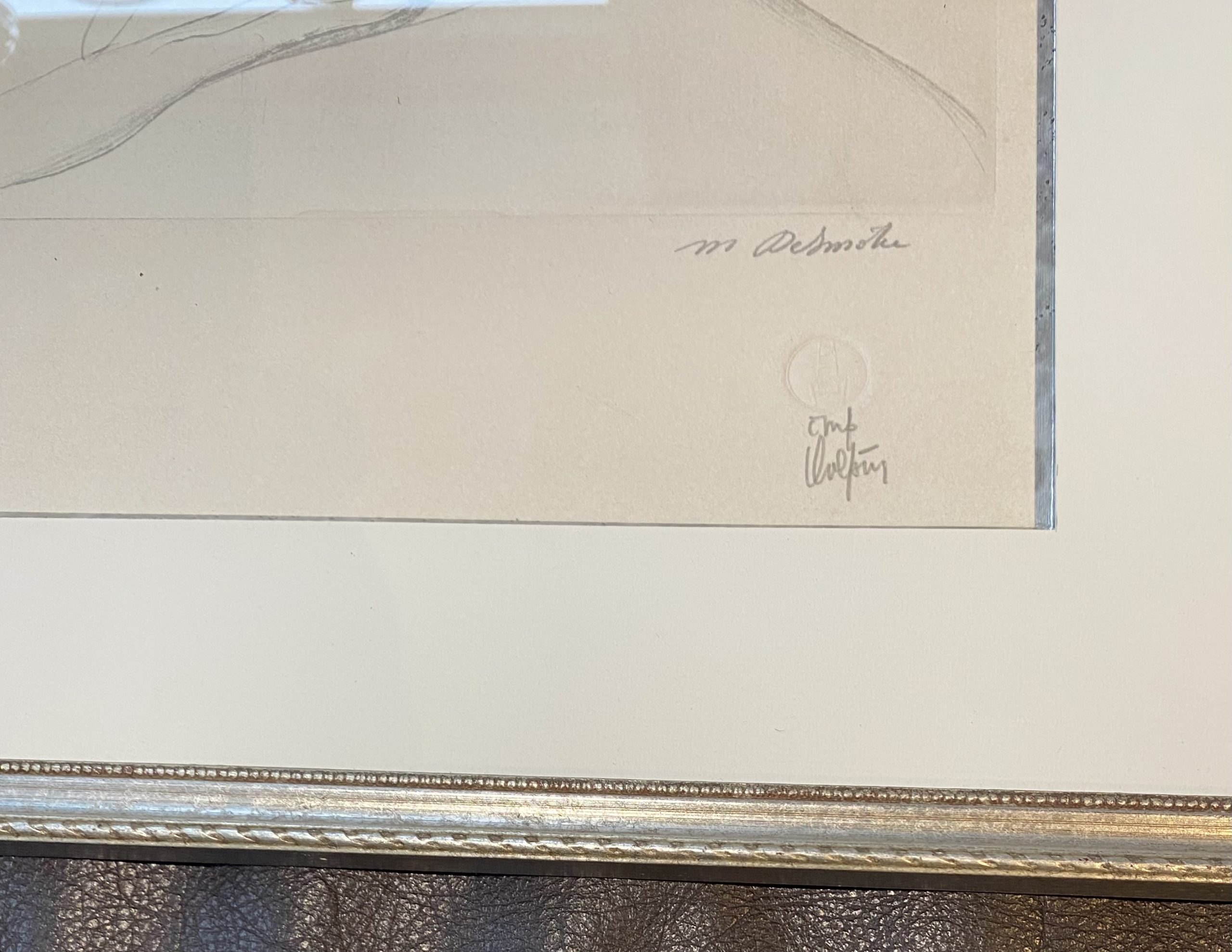 Très jolie lithogravure de Marcel Delmotte représentant un visage féminin, à coté d’une statue. Dessin classique avec un coté surréaliste, peut-être inspiré du monde de De Chirico, très apprécié par Delmotte. Signature au crayon de M.Delmotte, cachet à sec de l’imprimeur avec signature.